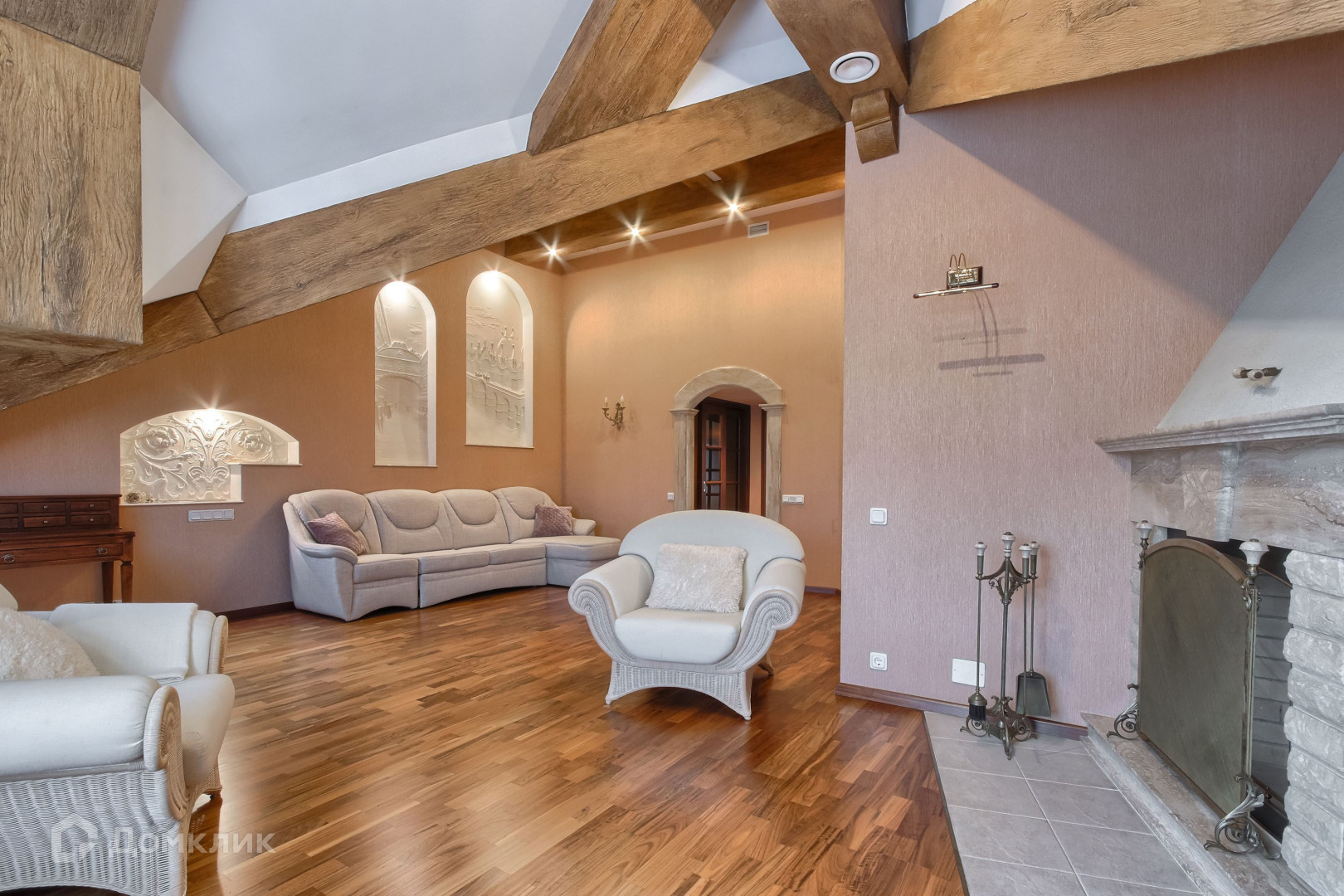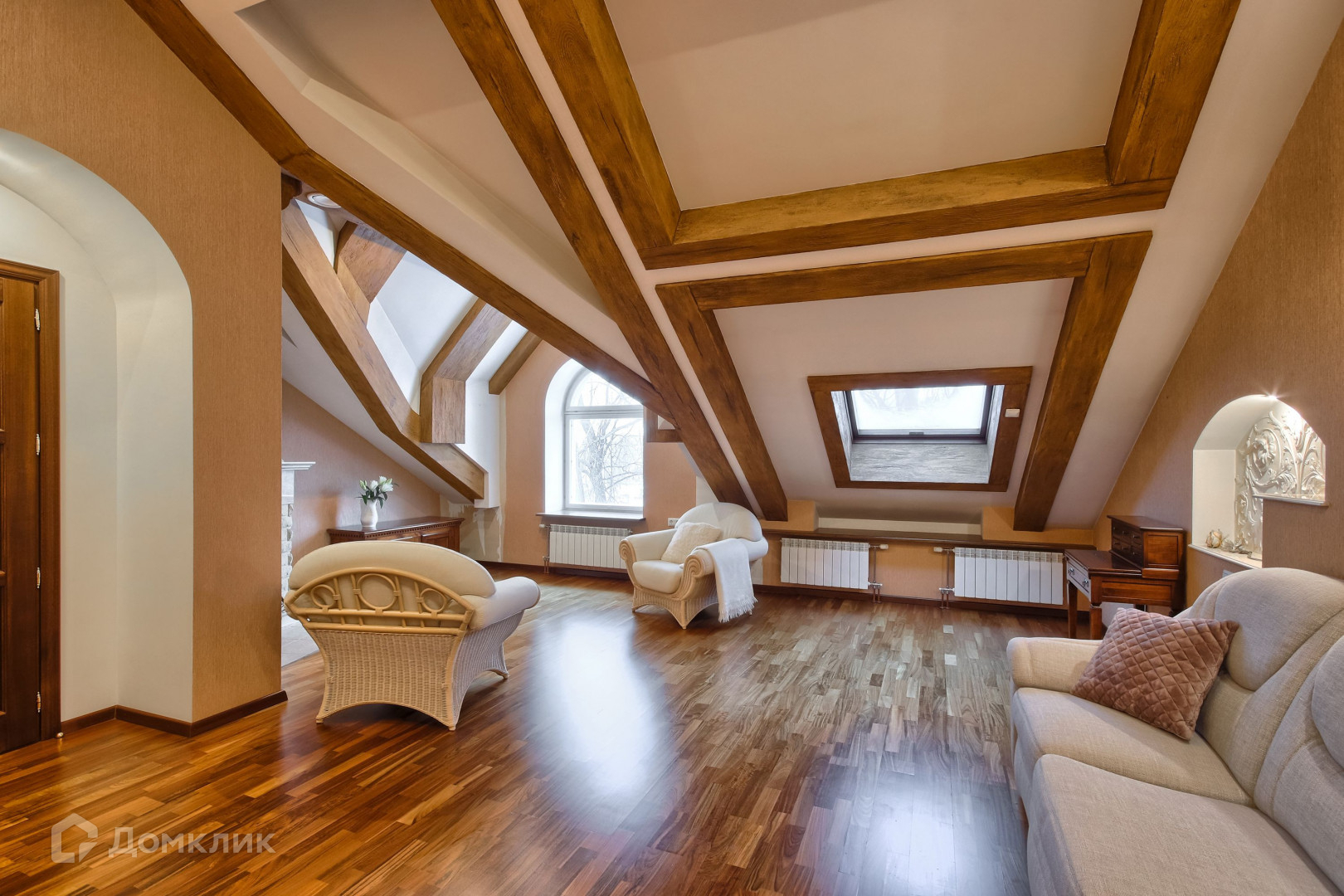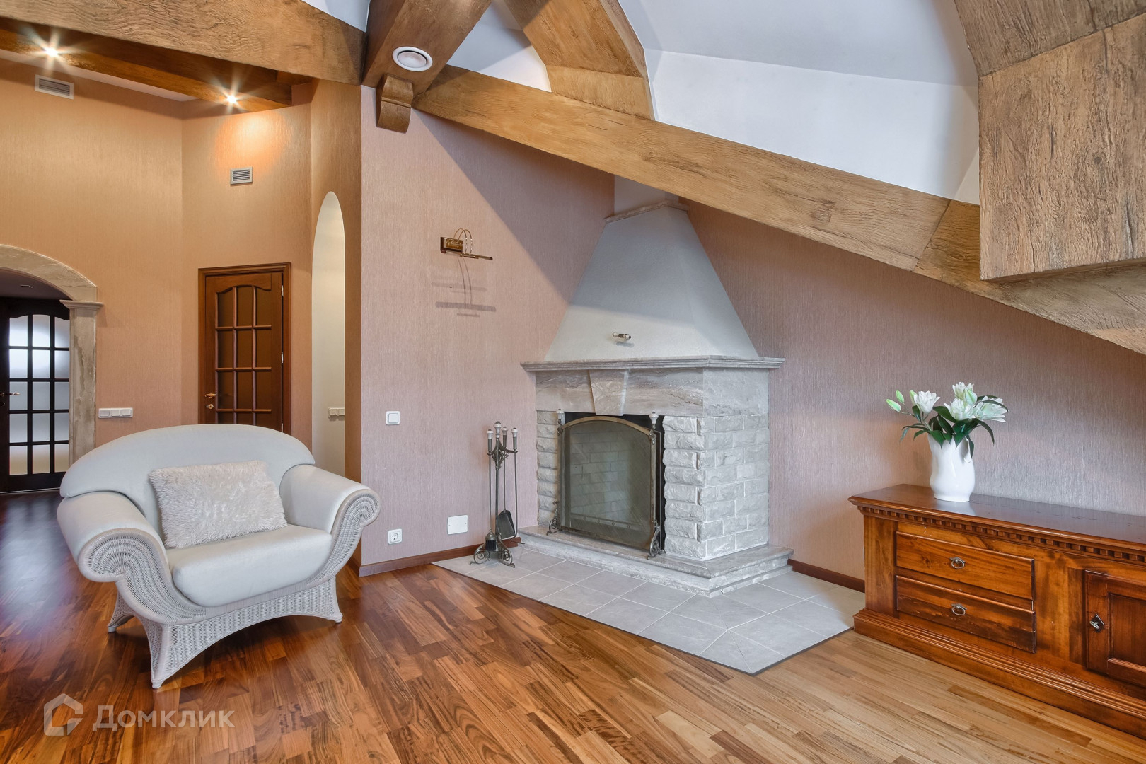 Главная мастер-спальня с камином 31 кв.м., арочное и мансардное окна