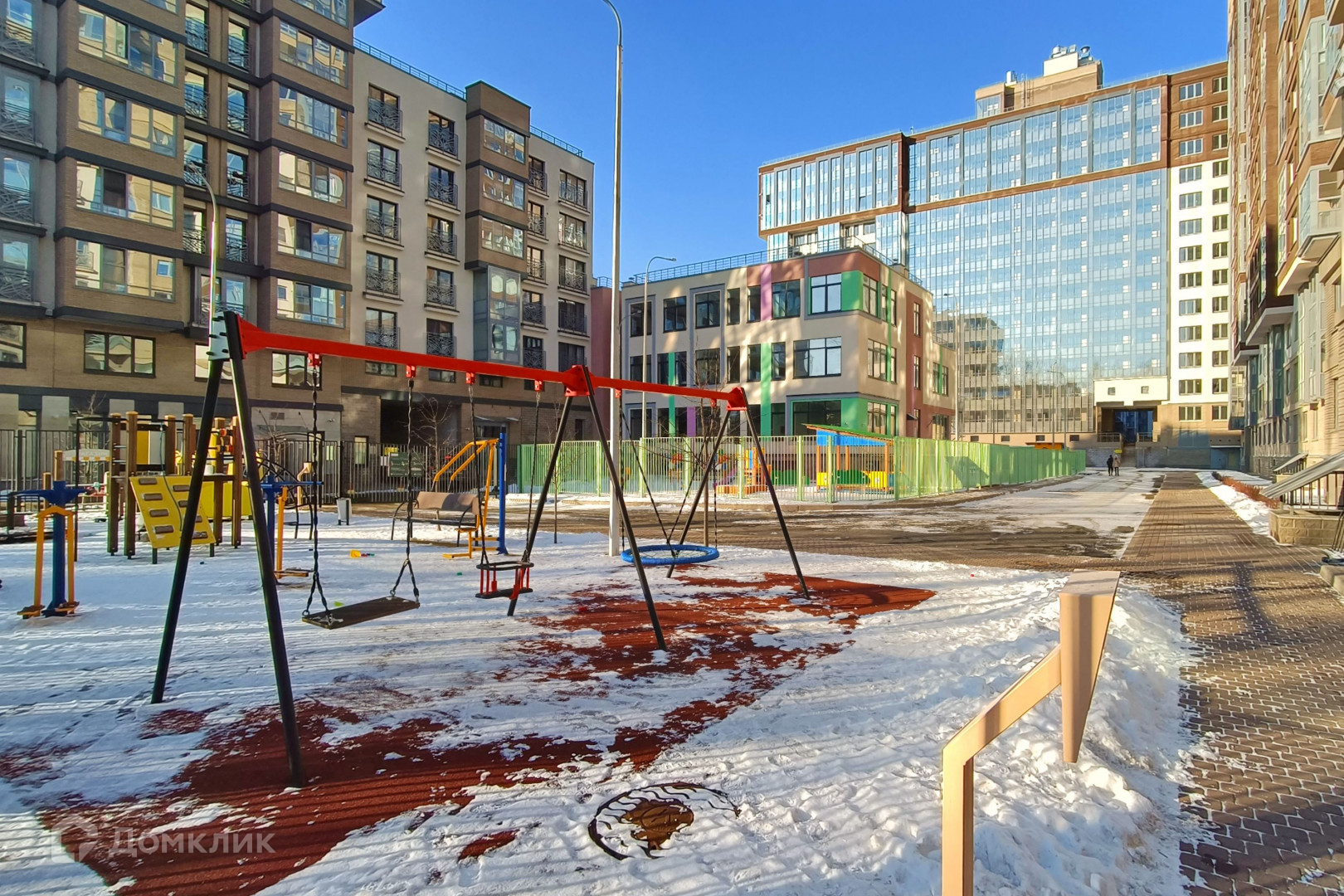 Территория комплекса огорожена и охраняется. Закрытый двор с детскими и спортивными площадками. Внутри ЖК детсад с бассейном.