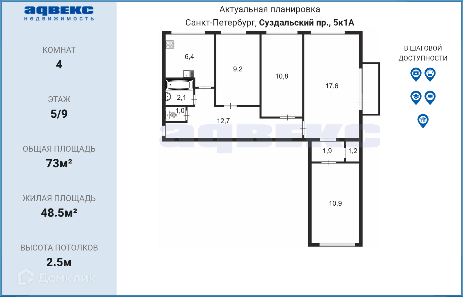 4-комнатная квартира, 73 м2, этаж 5 / 9, на продажу в Санкт-Петербурге, Суздальский проспект, 5к1