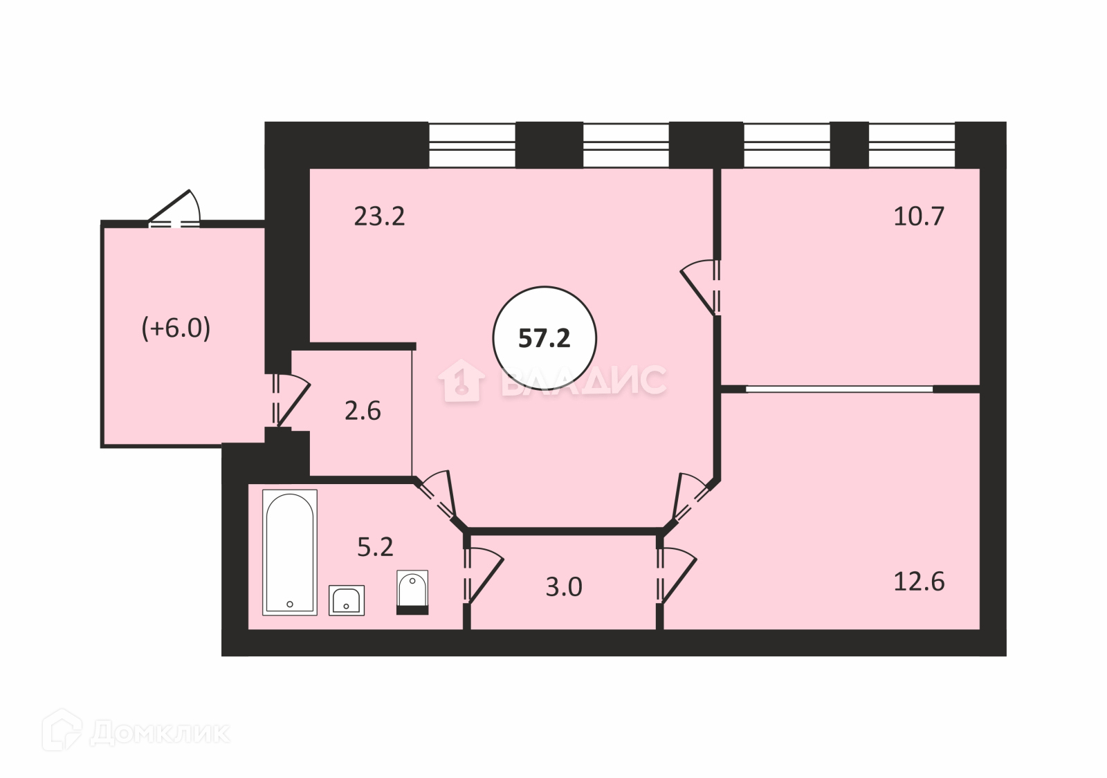 Общая площадью 57.2 кв.м. (+ отдельный тамбур 6 кв.м.). две изолированные комнаты (12,6+10,7). Гостиная 23кв.м