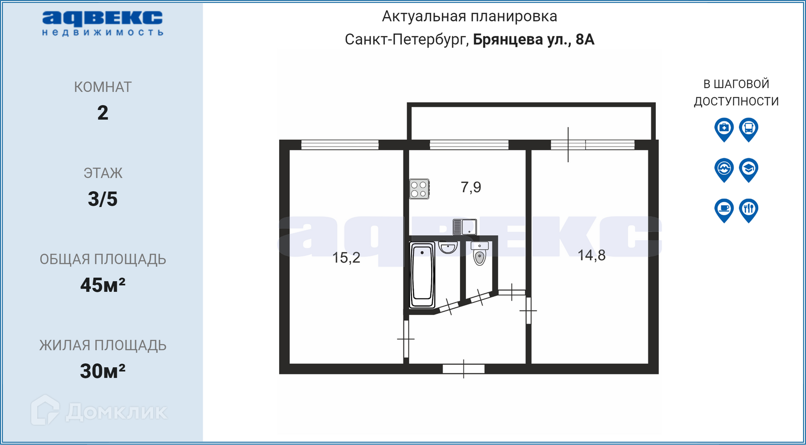 2-комнатная квартира, 45 м2, этаж 3 / 5, на продажу в Санкт-Петербурге, улица Брянцева, 8