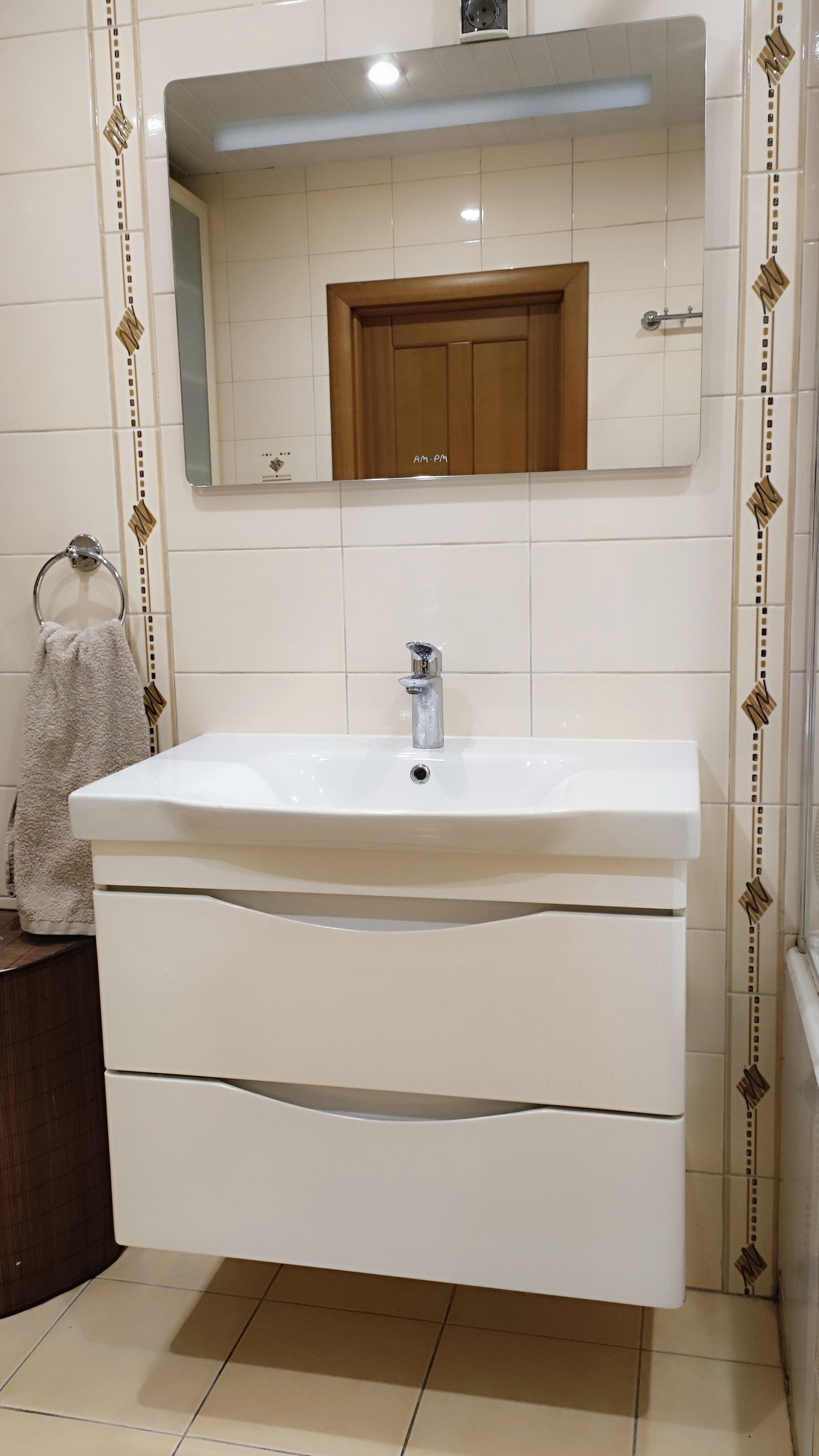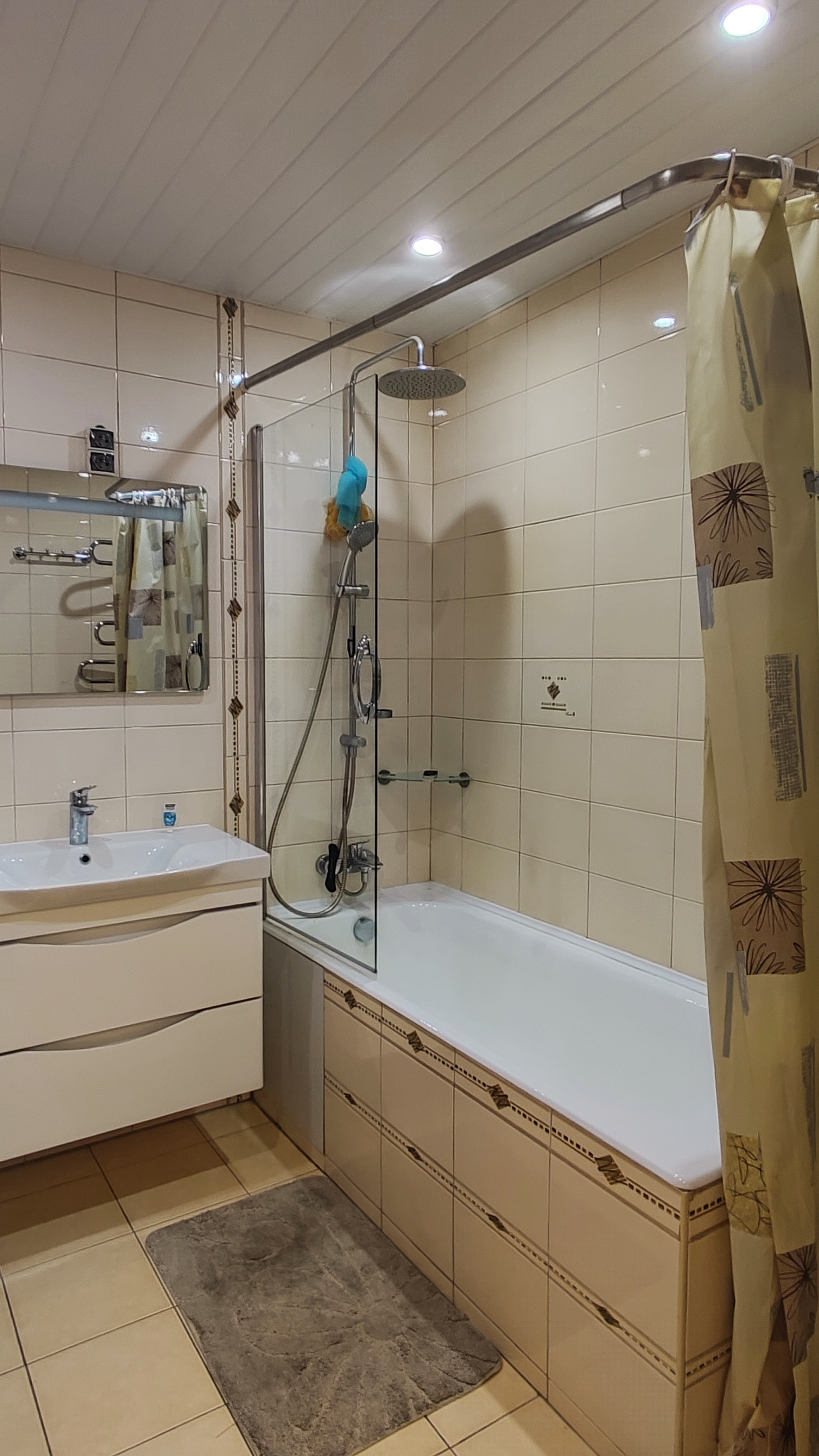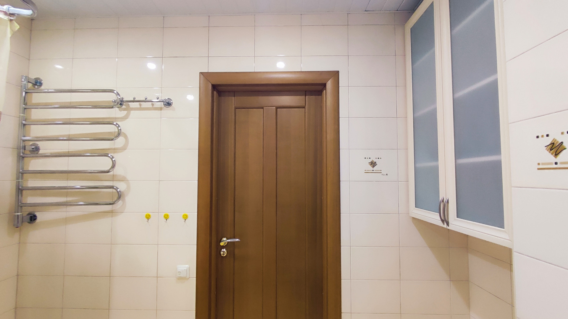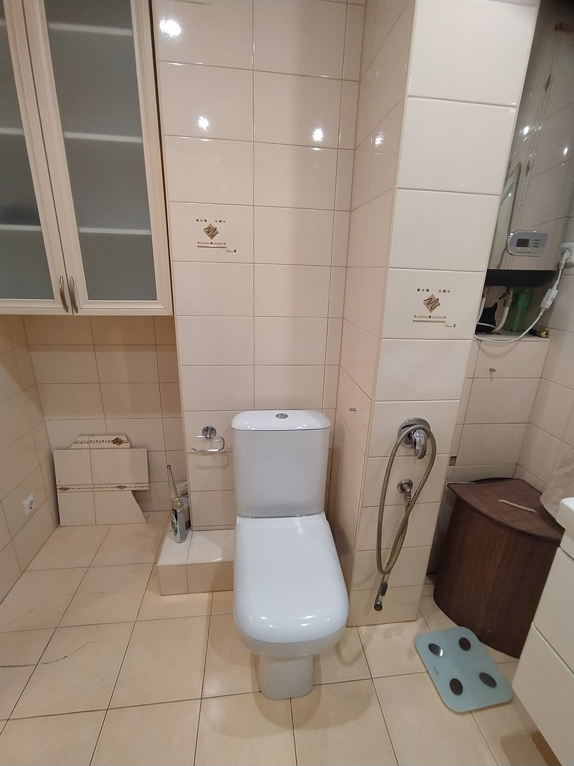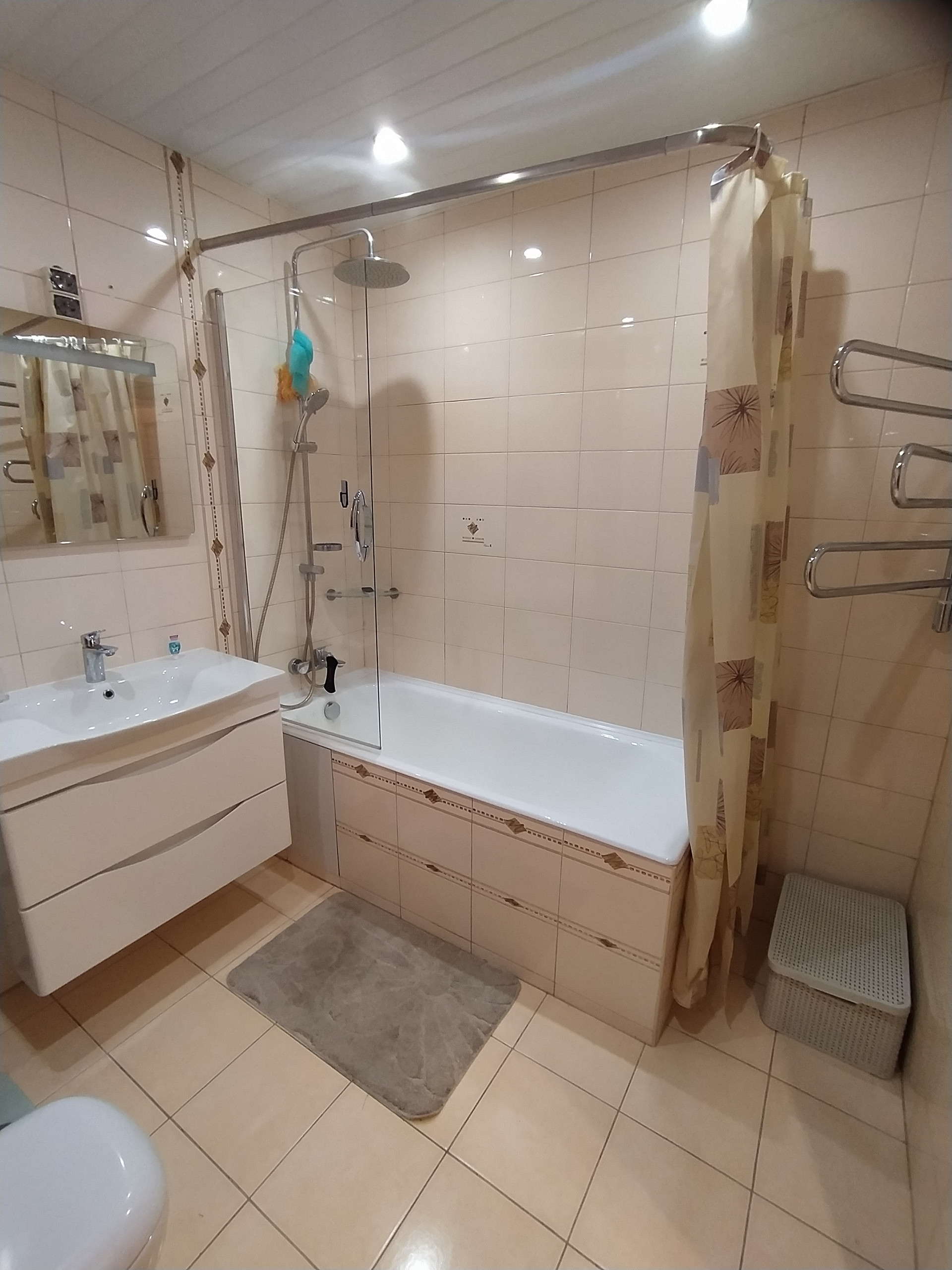 В квартире просторный санузел 5,5 кв.м, удобно оборудованный красивой и практичной импортной сантехникой. Есть гардеробная 3 кв.м, которую также можно, при желании, переоборудовать под санузел, там есть фановая труба и подводка горячей и холодной воды.