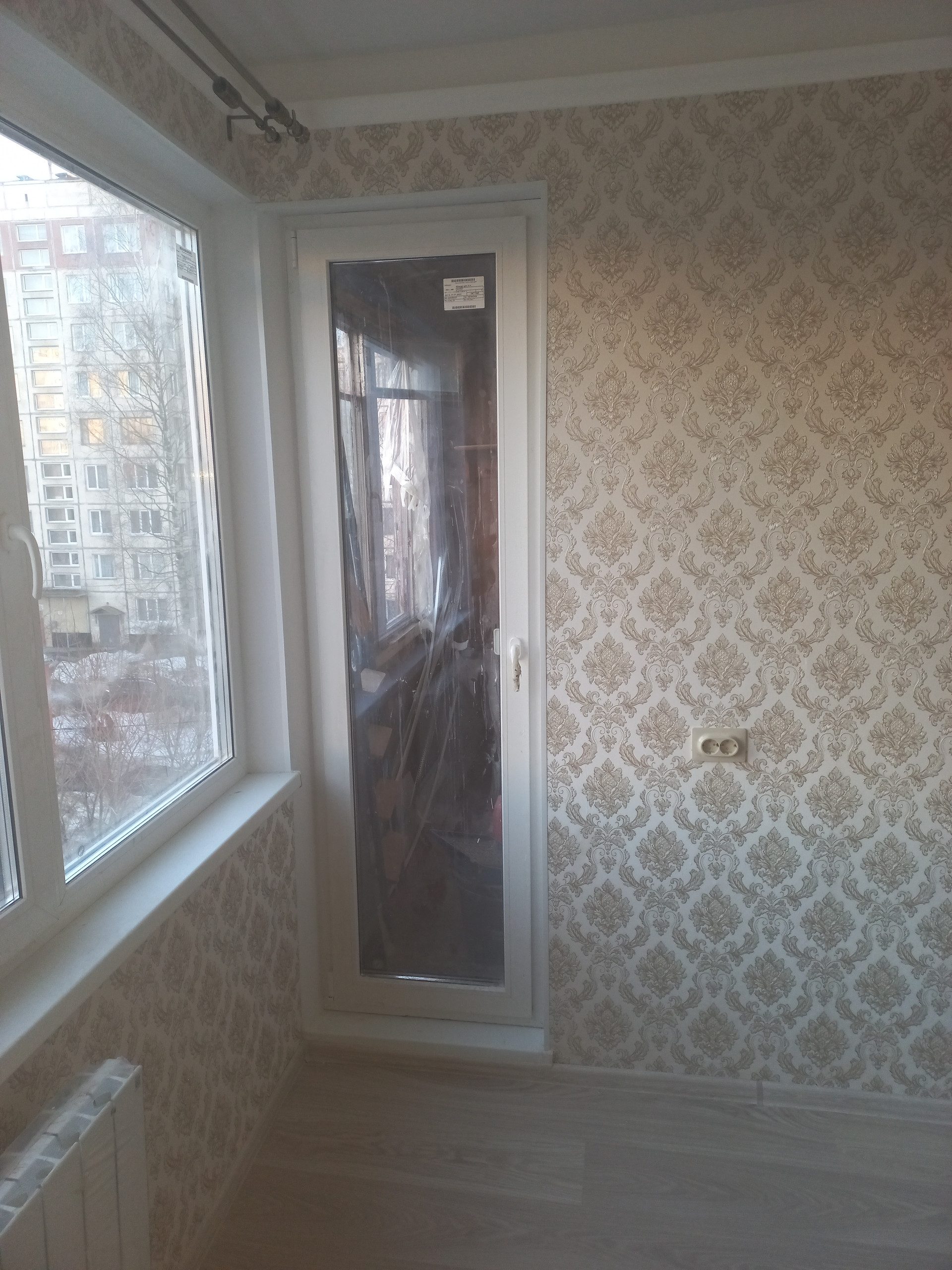 В комнате установлены: пластиковое окно, а также пластиковая дверь на лоджию, которая выполнена под заказ из сплошного стекла от компании "Лабладор" (итого на 60614 рублей).