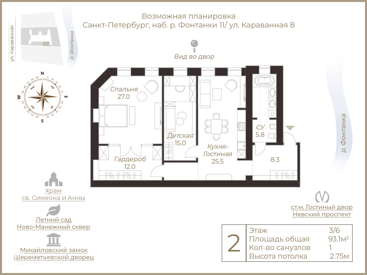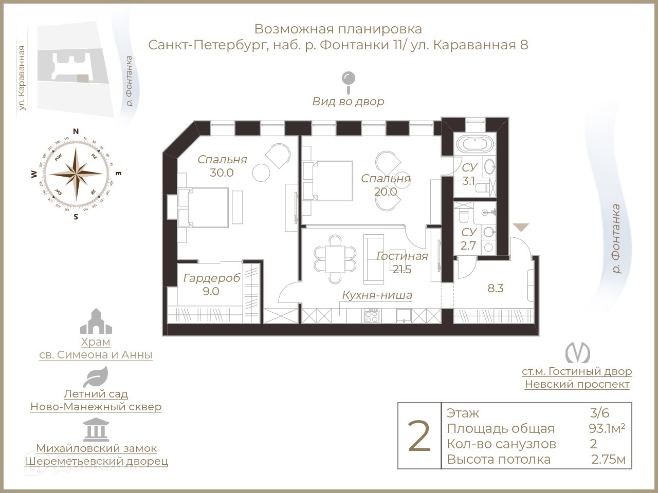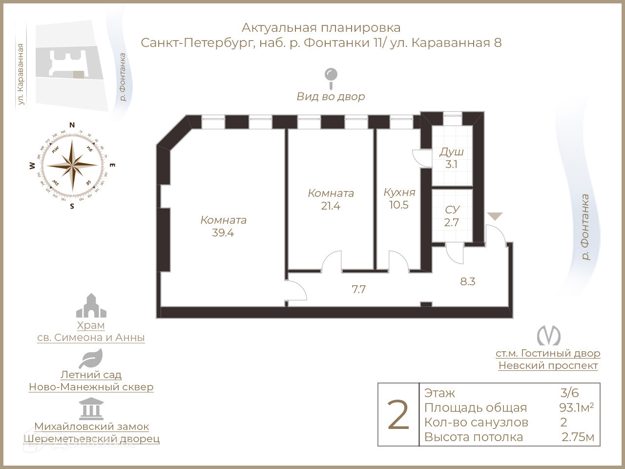 2-комнатная квартира, 93.1 м2, этаж 3 / 6, на продажу в Санкт-Петербурге, набережная реки Фонтанки, 11
