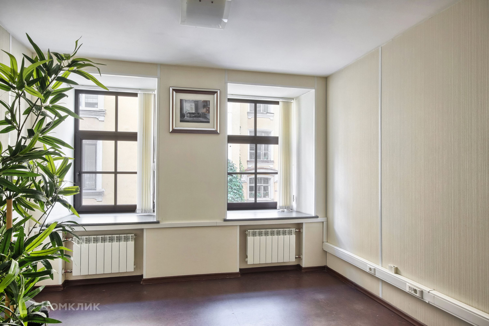 Общая площадь квартиры — 93,1 м². Сейчас в планировке две комнаты, кухня, два санузла, коридор и просторная прихожая, но в жилой части нет несущих стен, так что вы можете перестроить помещение по своему усмотрению. Здесь можно сделать евродвухкомнатную и евротрехкомнатную квартиру. Окна выходят в тихий двор