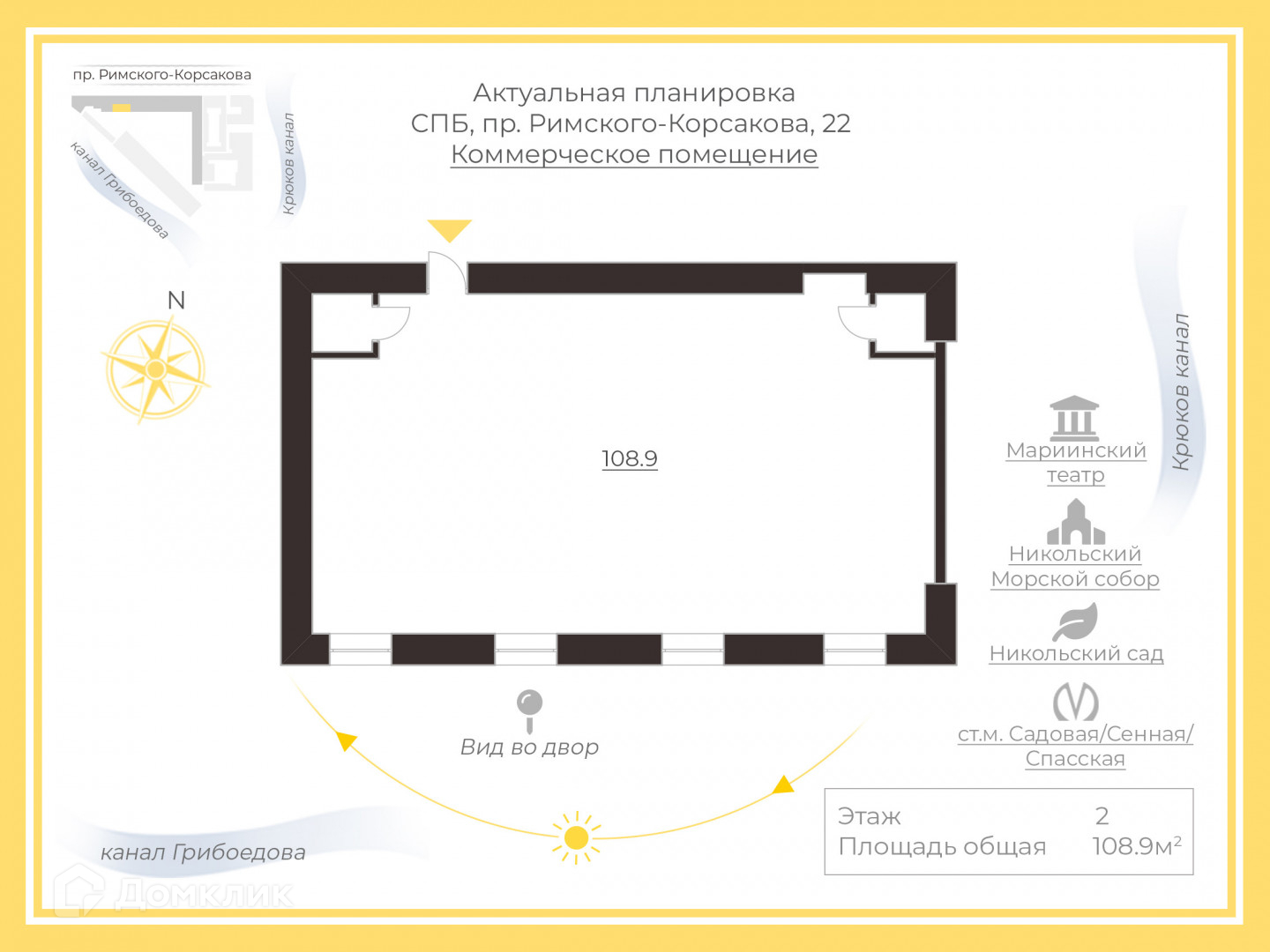 Здание расположено в одном из красивейших мест города.  Театральная площадь, Мариинский театр, благородный Никольский собор, живописные канал Грибоедова и Крюков канал, уютный Никольский сад, Семимостье создают атмосферу величия и покоя.