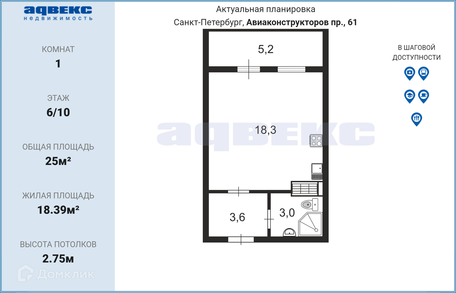 Квартира студия, 25 м2, этаж 6 / 10, на продажу в Санкт-Петербурге, проспект Авиаконструкторов, 61
