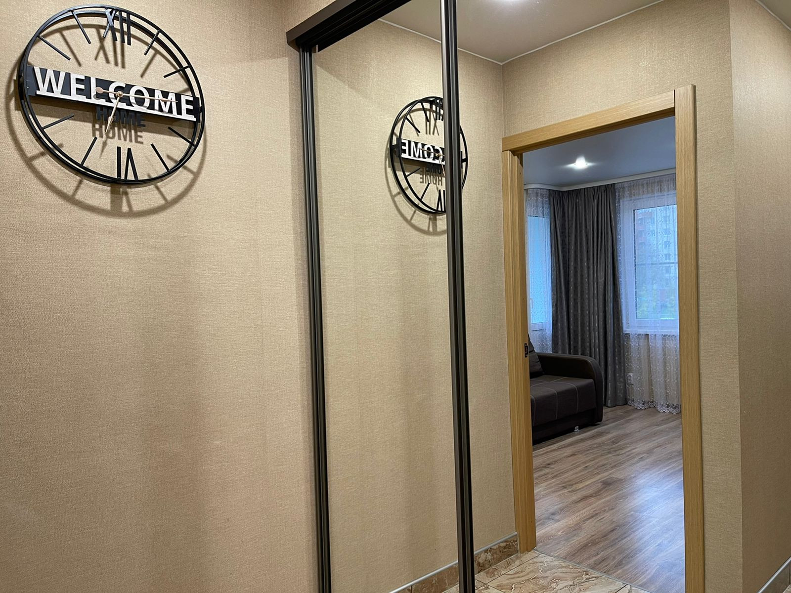 В прихожей -- гардеробная за зеркальными дверями-купе.