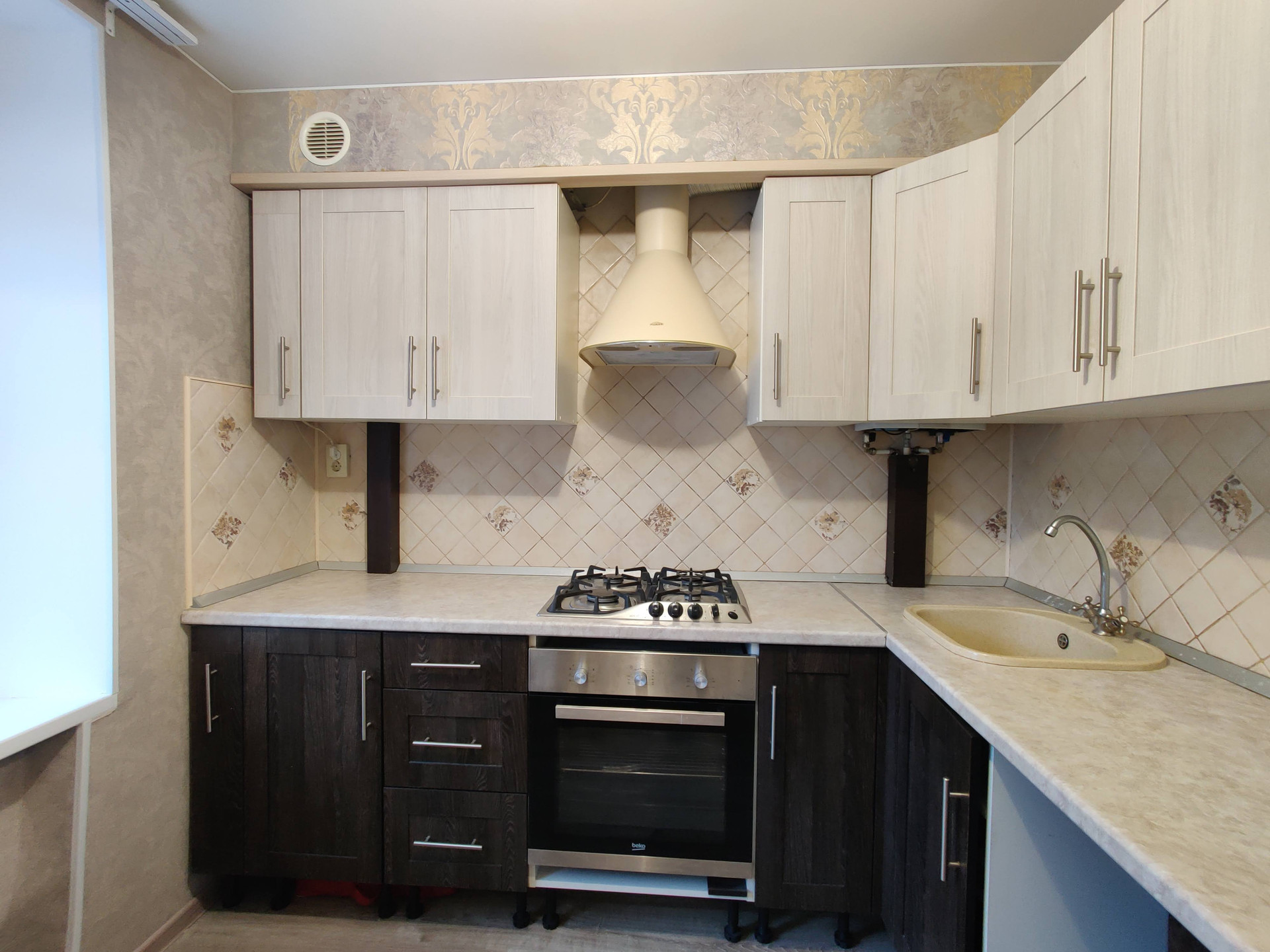 Газовая колонка установлена на кухне в одном из шкафчиков.