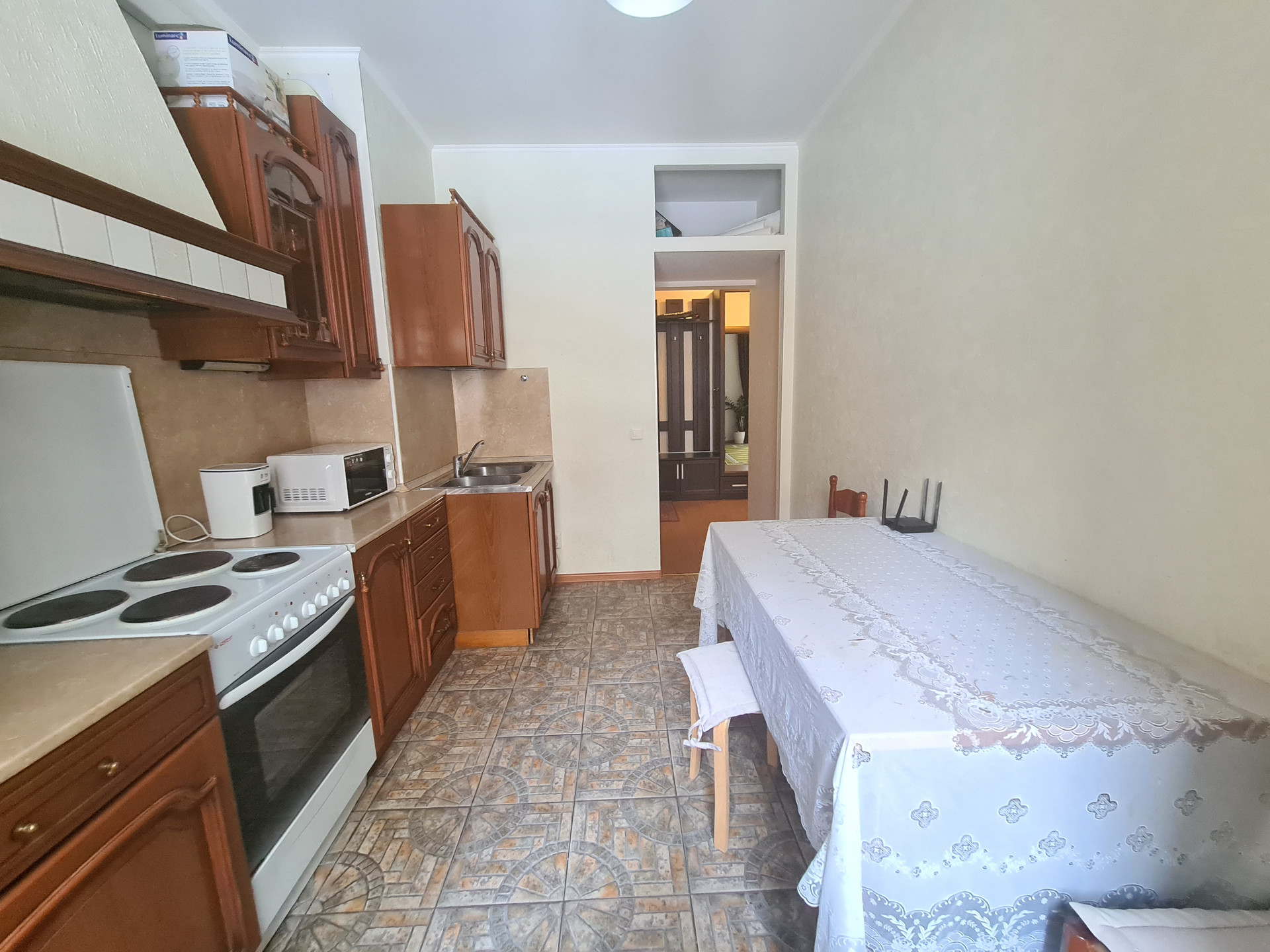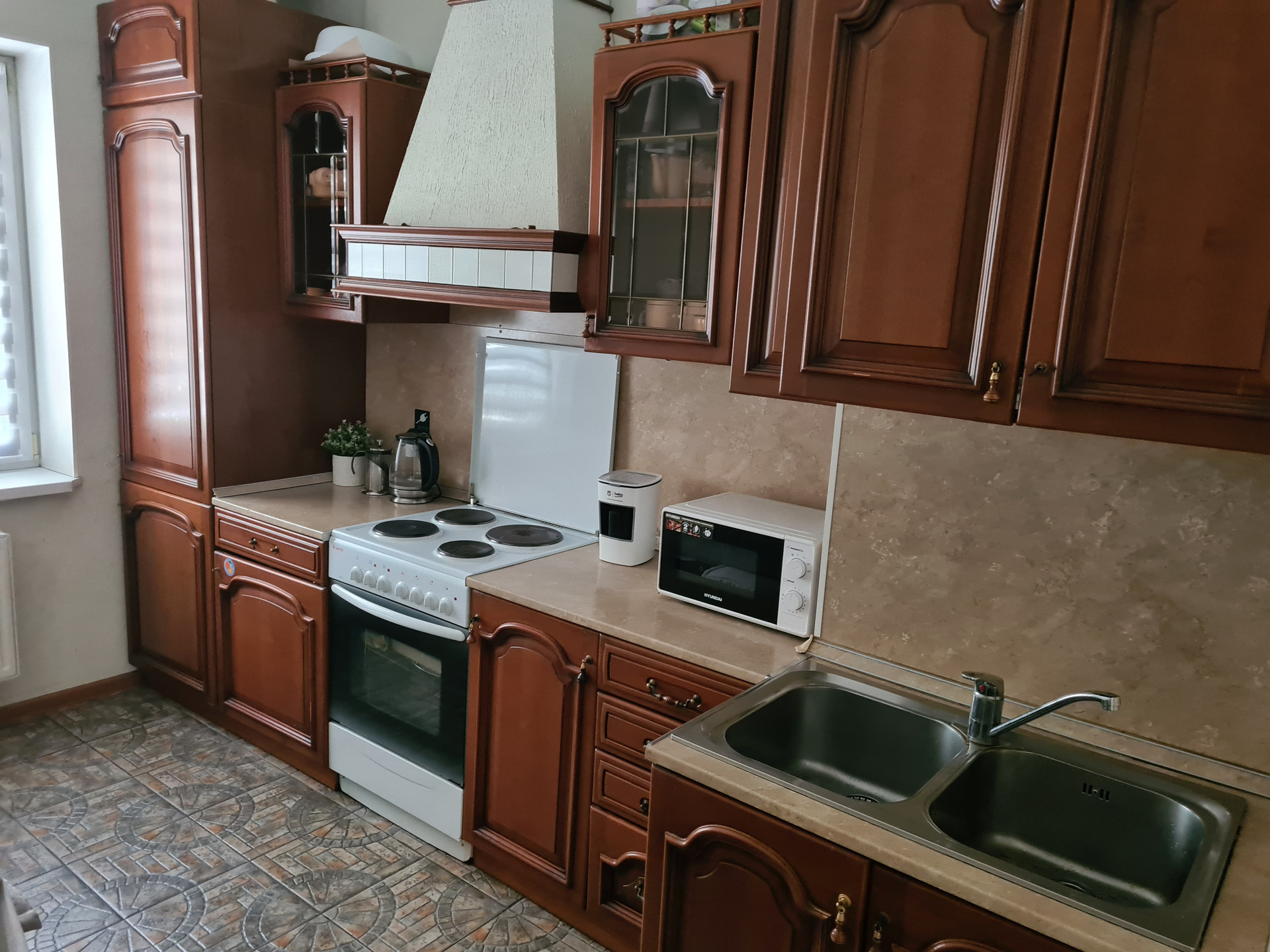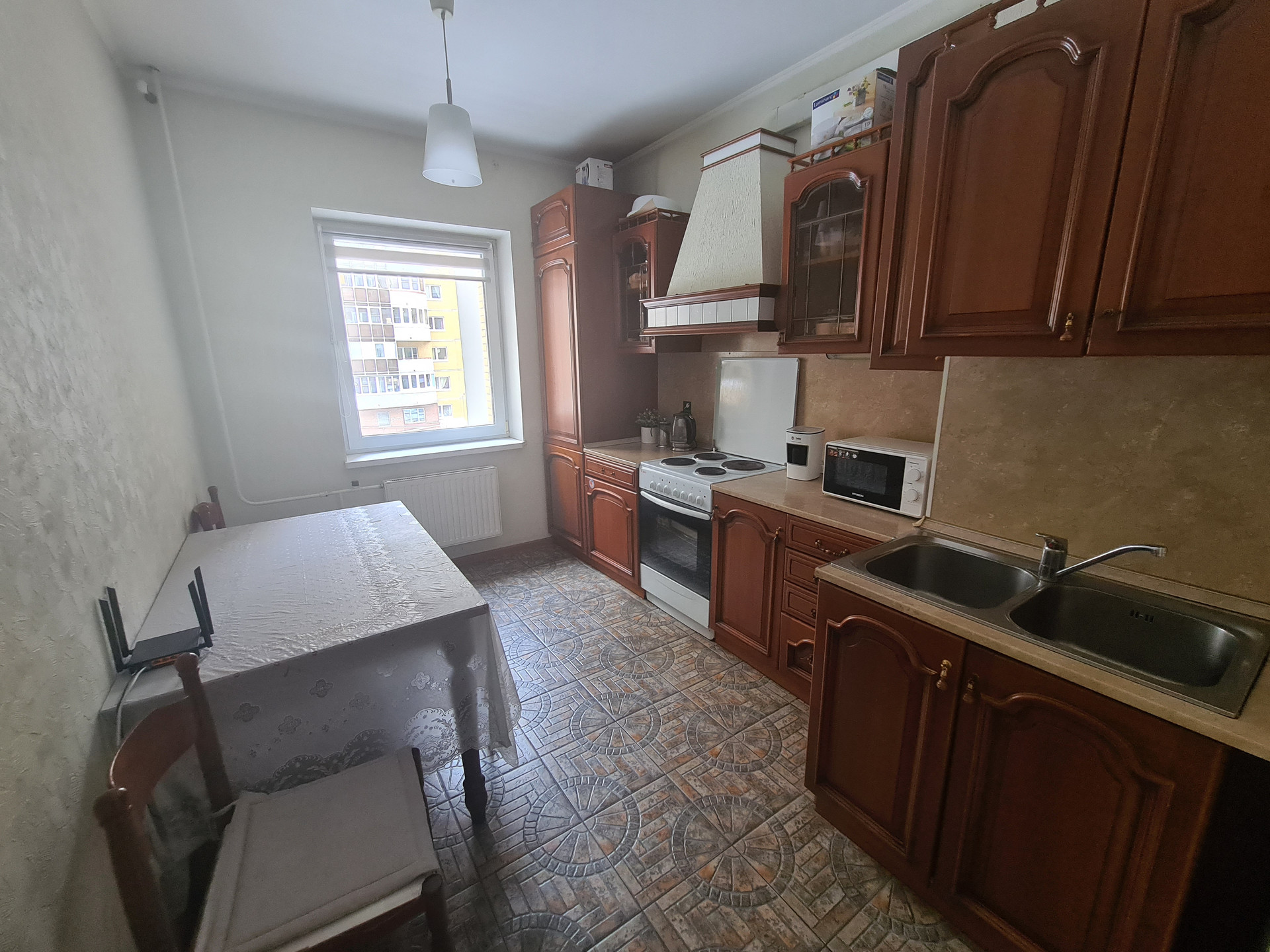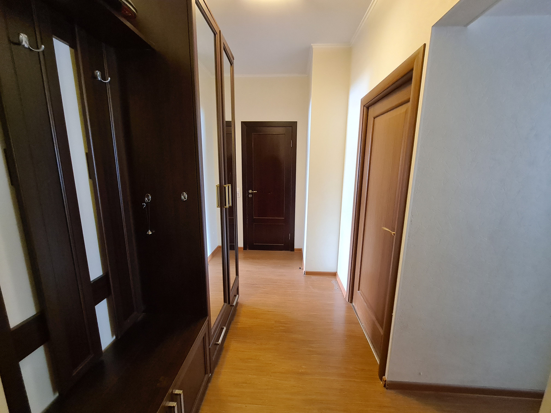 В квартире может остаться вся мебель и бытовая техника: модульная кухня (из массива дерева), стол, стулья, диван, мебельная горка, кровать двуспальная, шкаф трехдверный с зеркалом, мебельв коридоре, встроенный холодильник, посудомоечная машина, вытяжка.