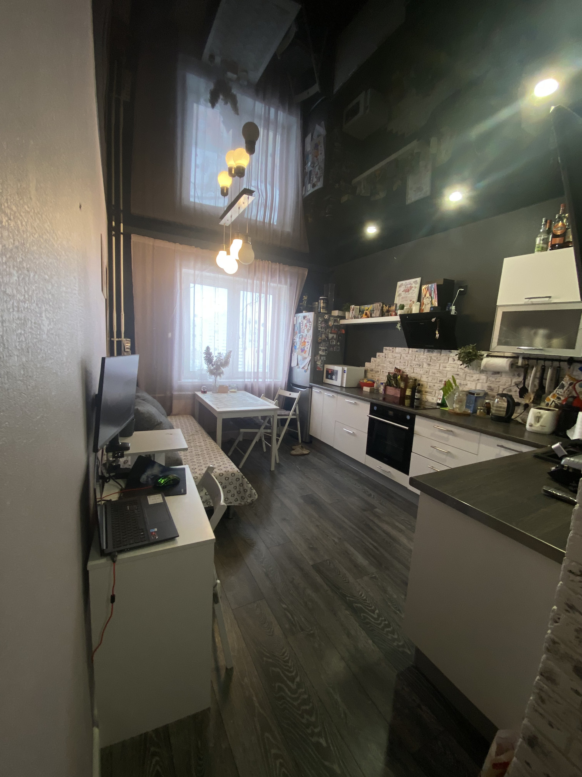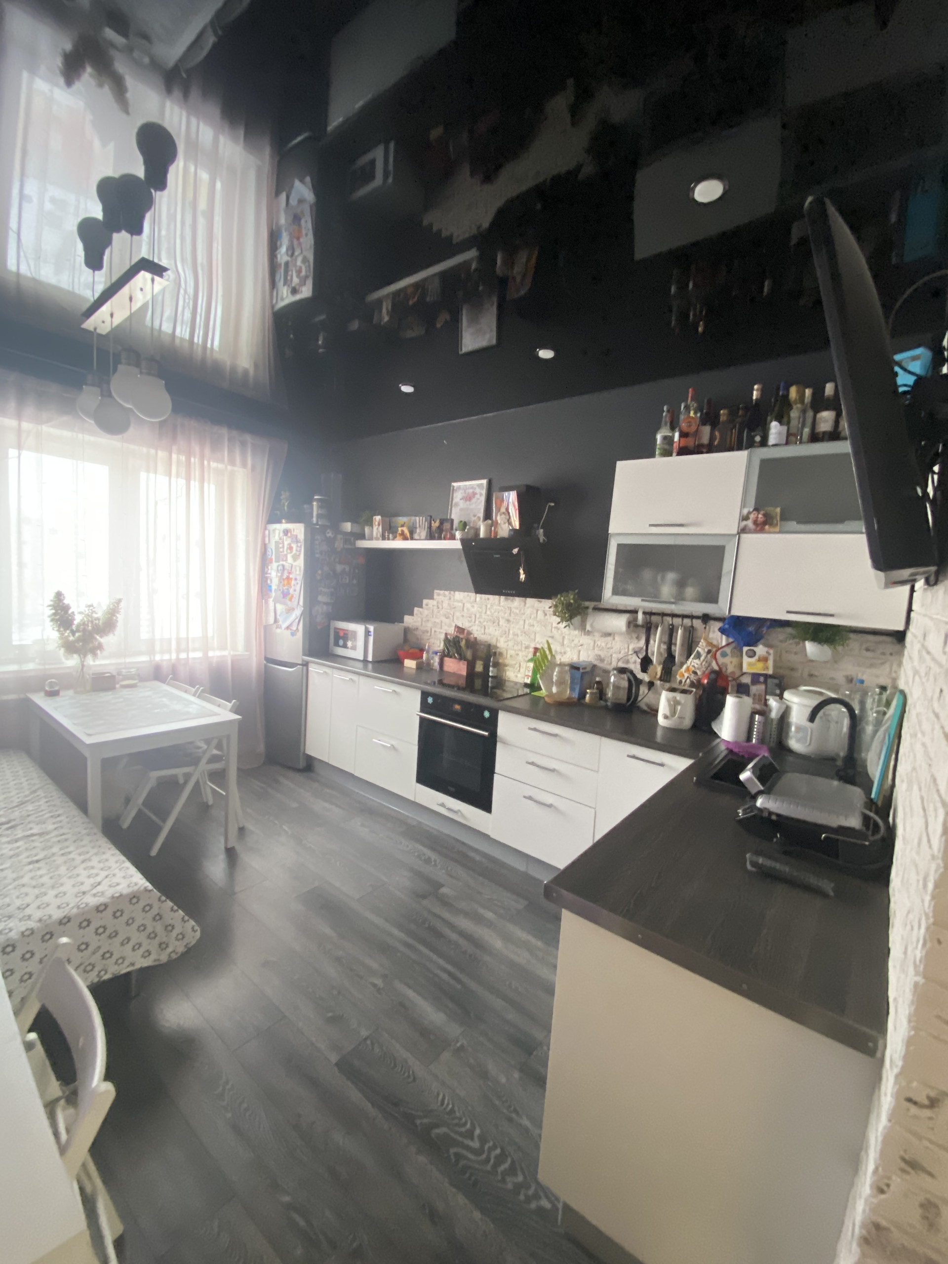 Везде натяжные потолки,на кухне черный потолок,что увеличивает визуально еще пространство)