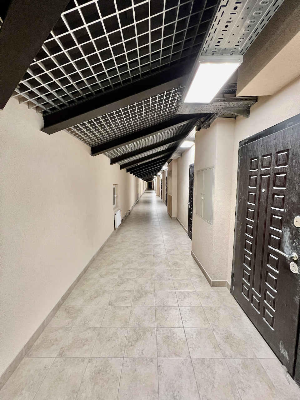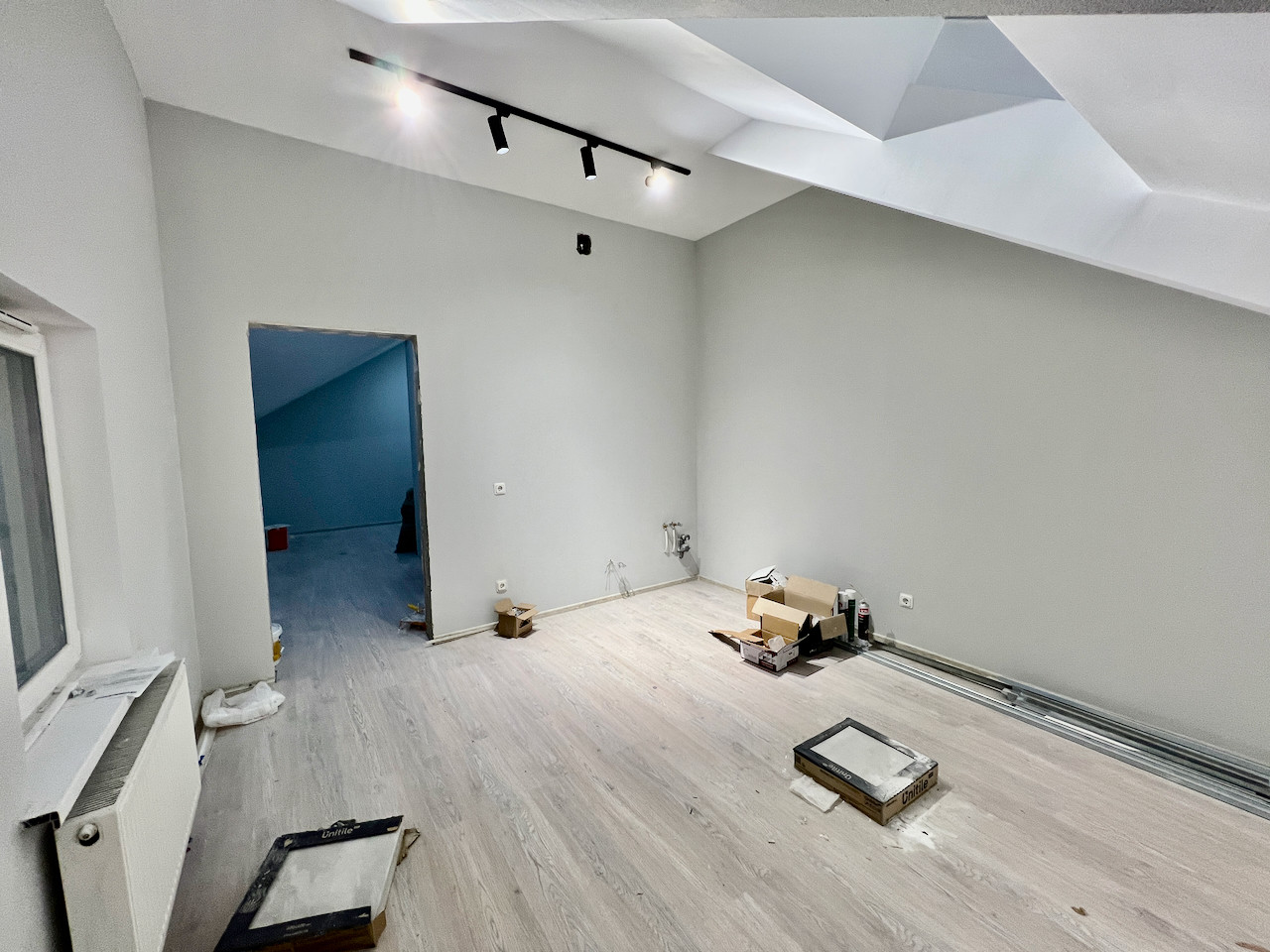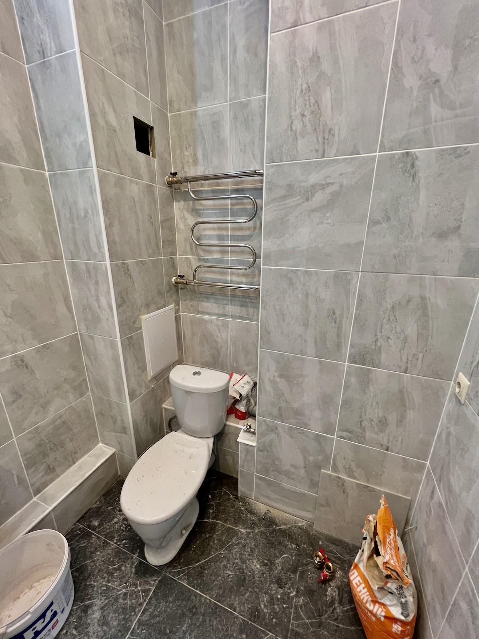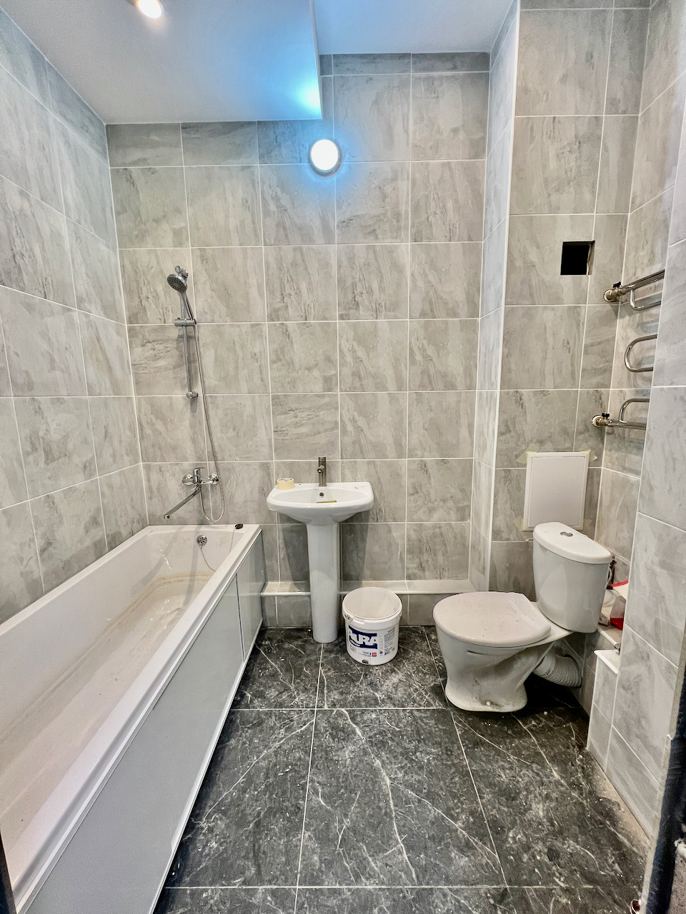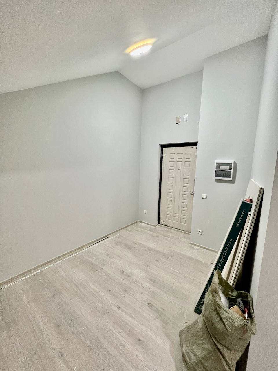 Ремонт выполнен в светлых тонах: на полу итальянский керамогранит и французский ламинат, установлена сантехника, выполнены подводки под кухню.