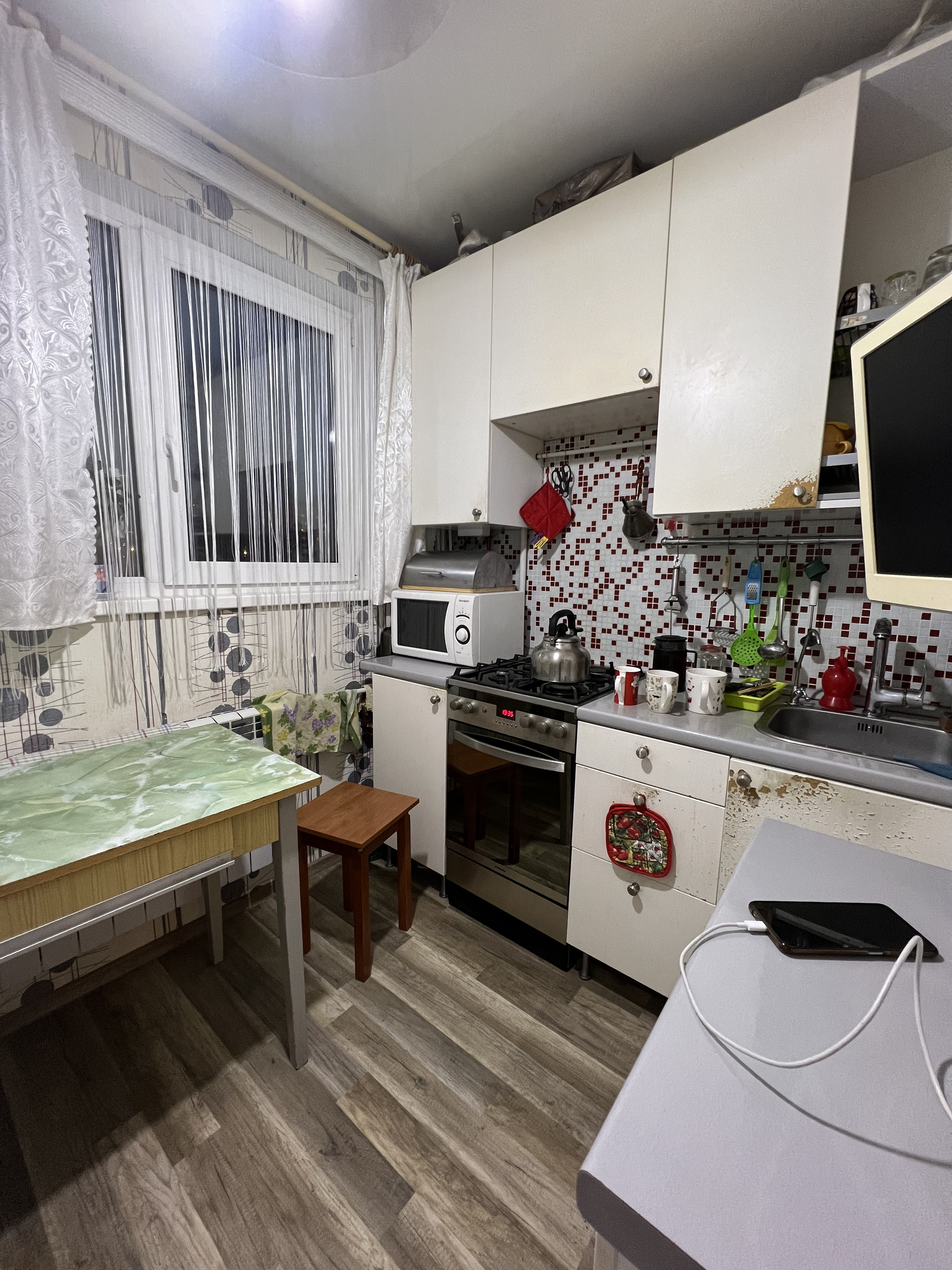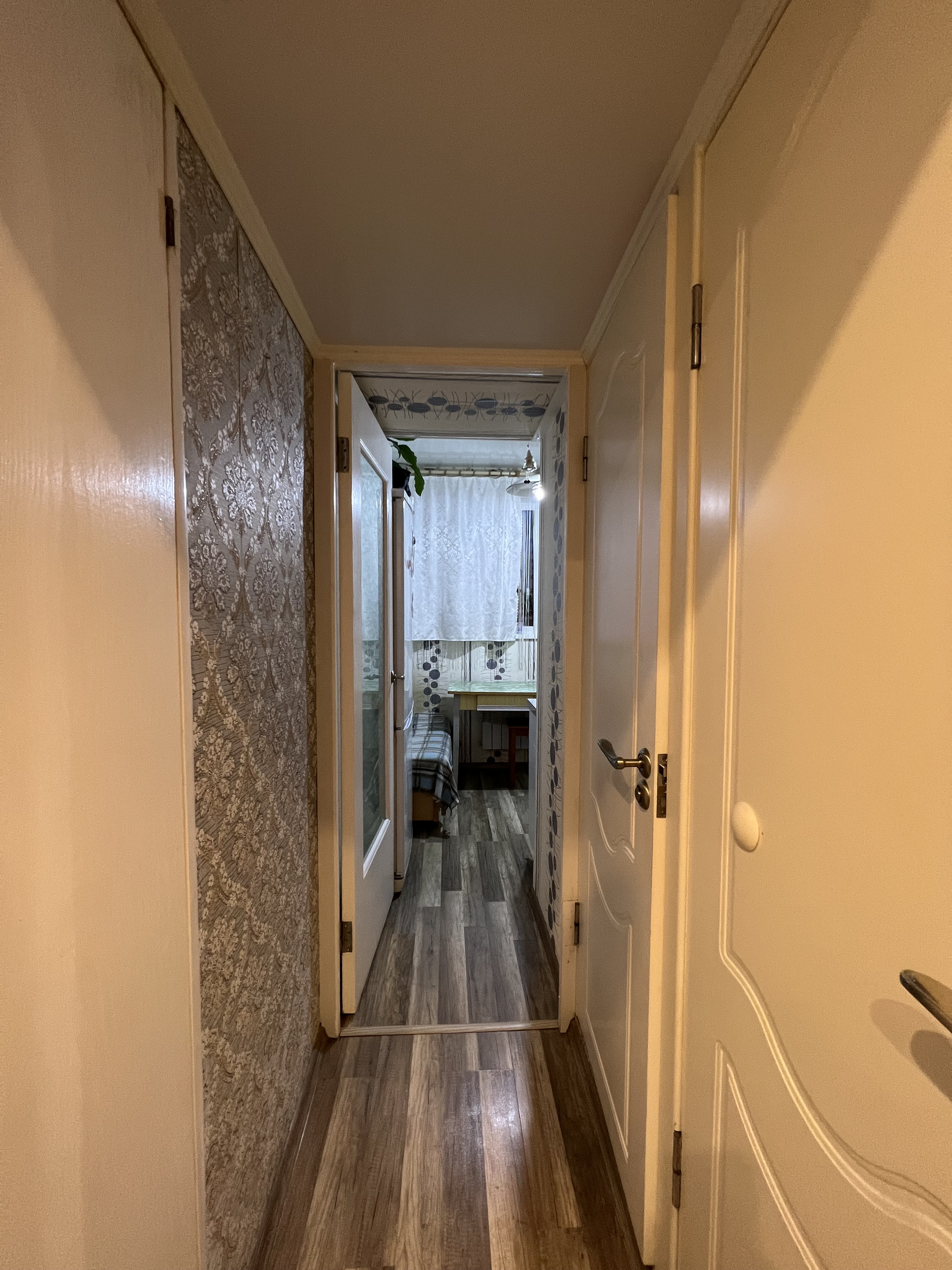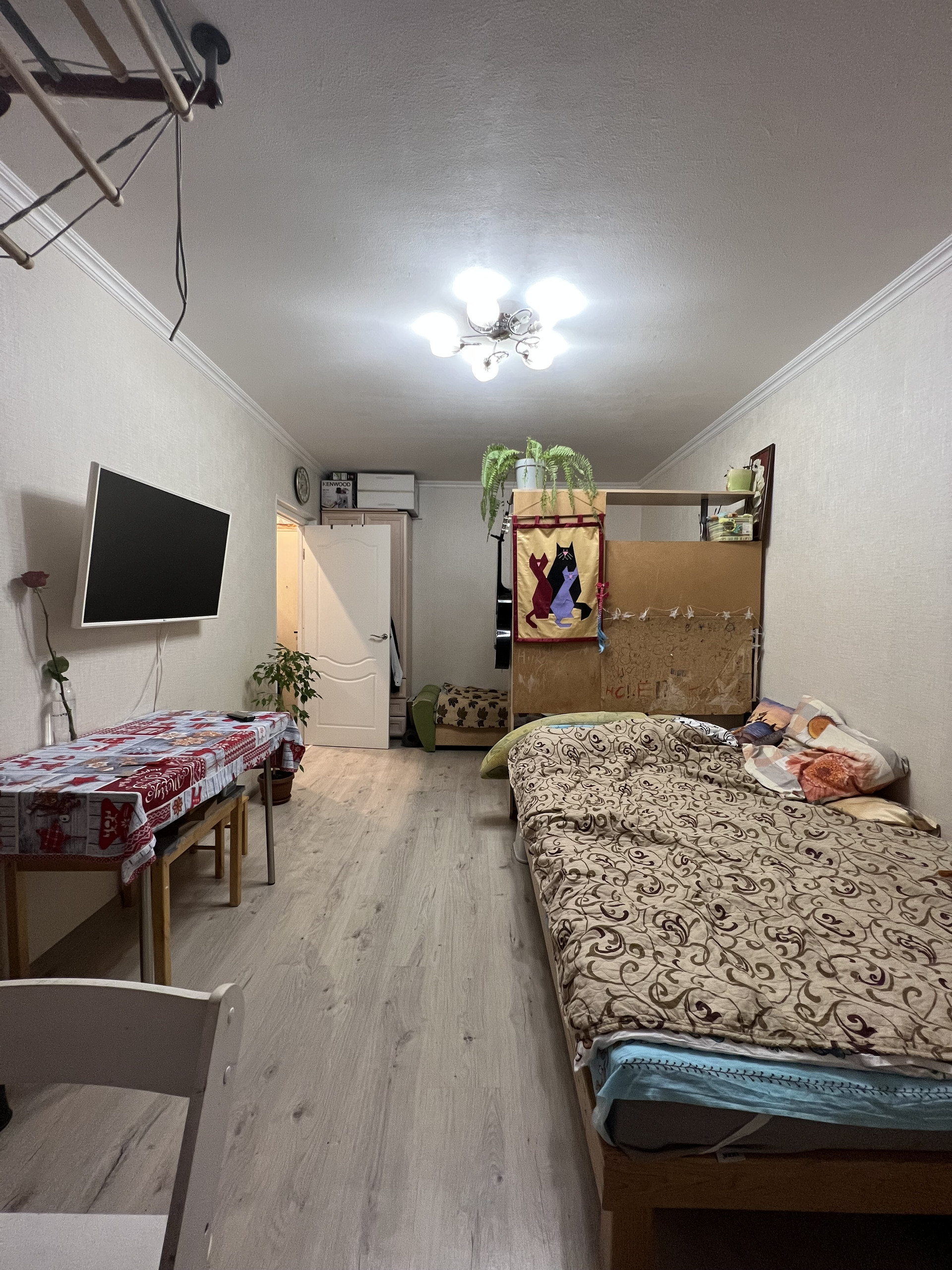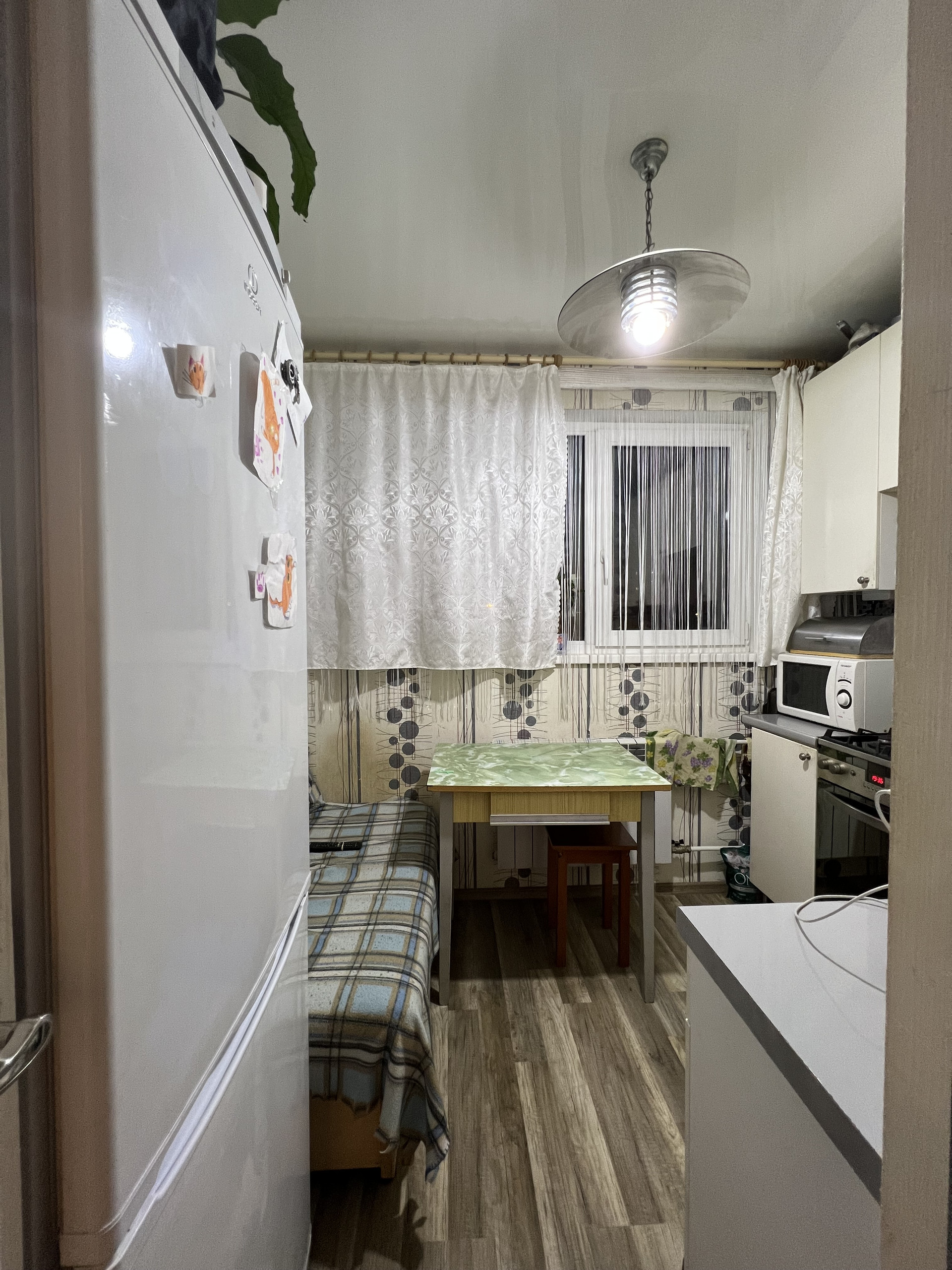Квартира в хорошем состоянии. Напольное покрытие в кухне и комнате-ламинат, в гардеробной-напольная плитка. Сан.узел в кафеле. Установлены окна ПВХ.