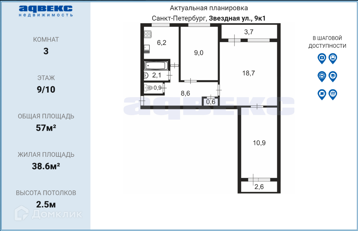 3-комнатная квартира, 57 м2, этаж 9 / 10, на продажу в Санкт-Петербурге, Звёздная улица, 9к1