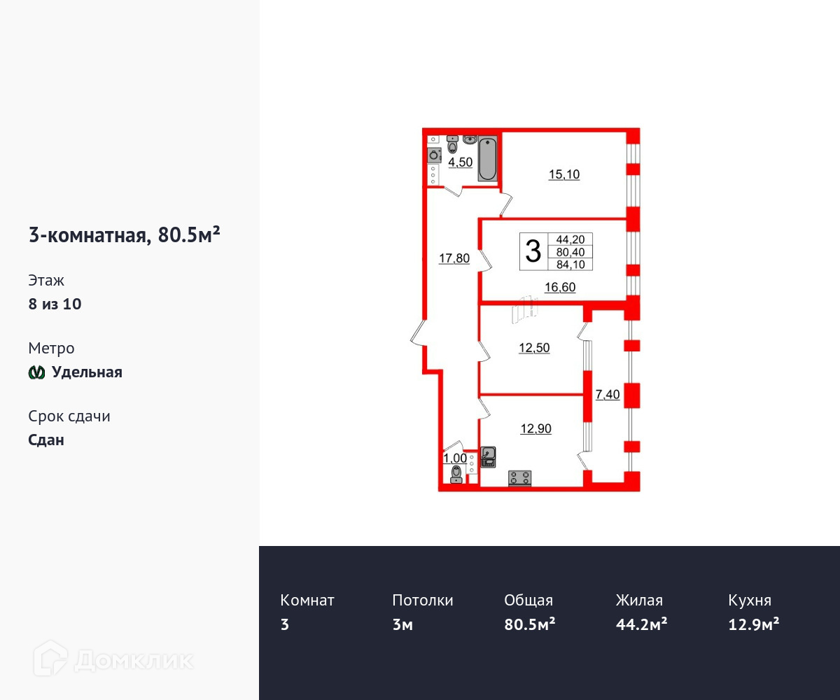 Продается трехкомнатная квартира в ЖК Svetlana Park площадью 80.5 м2 (жилая площадь – 44.2 м2). Квартира расположена рядом с метро Удельная. Расстояние до метро 15 Мин.пешком. Площадь кухни 12.9 м2. Площадь прихожей 17.8 м2. Высота потолка 3 м. Санузел – два санузла. Лоджия. Без отделки.