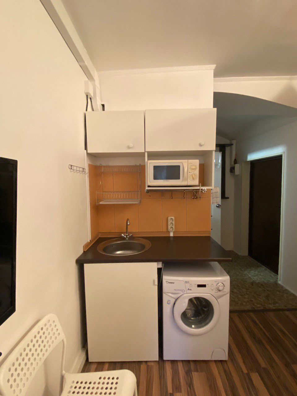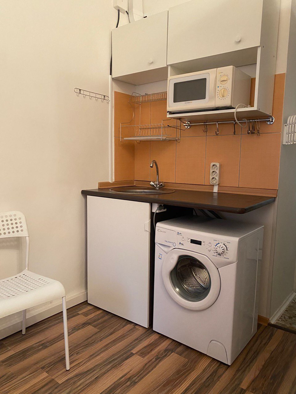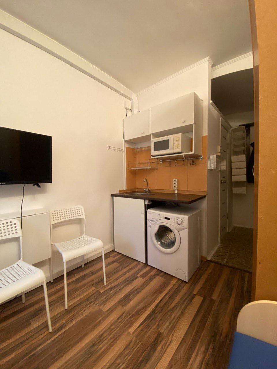 - полный комплект техники: телевизор, микроволновка, плитка, духовка, чайник, холодильник, стиралка, полный комплект посуды;