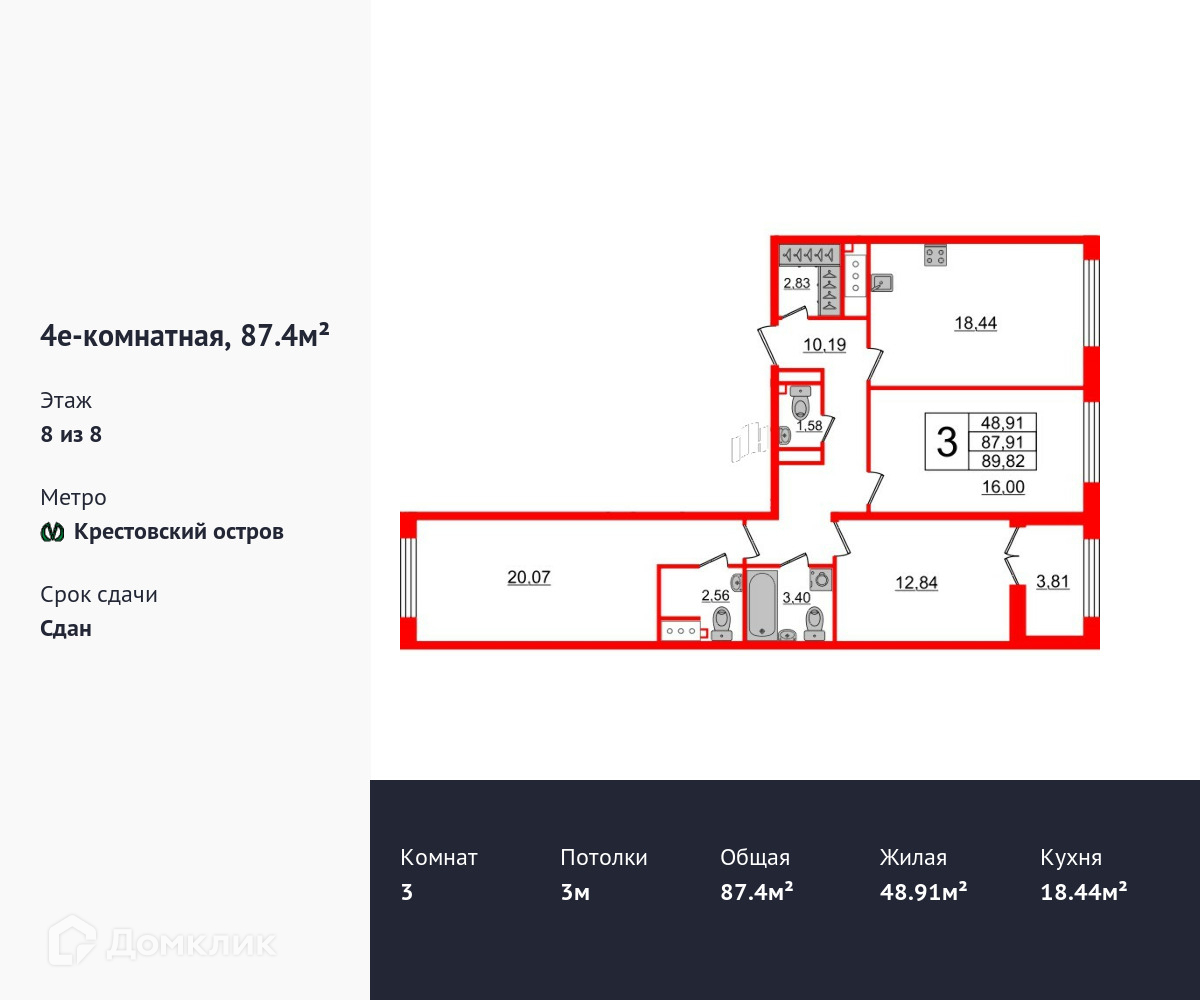 3-комнатная квартира, 87.4 м2, этаж 8 / 8, на продажу в Санкт-Петербурге