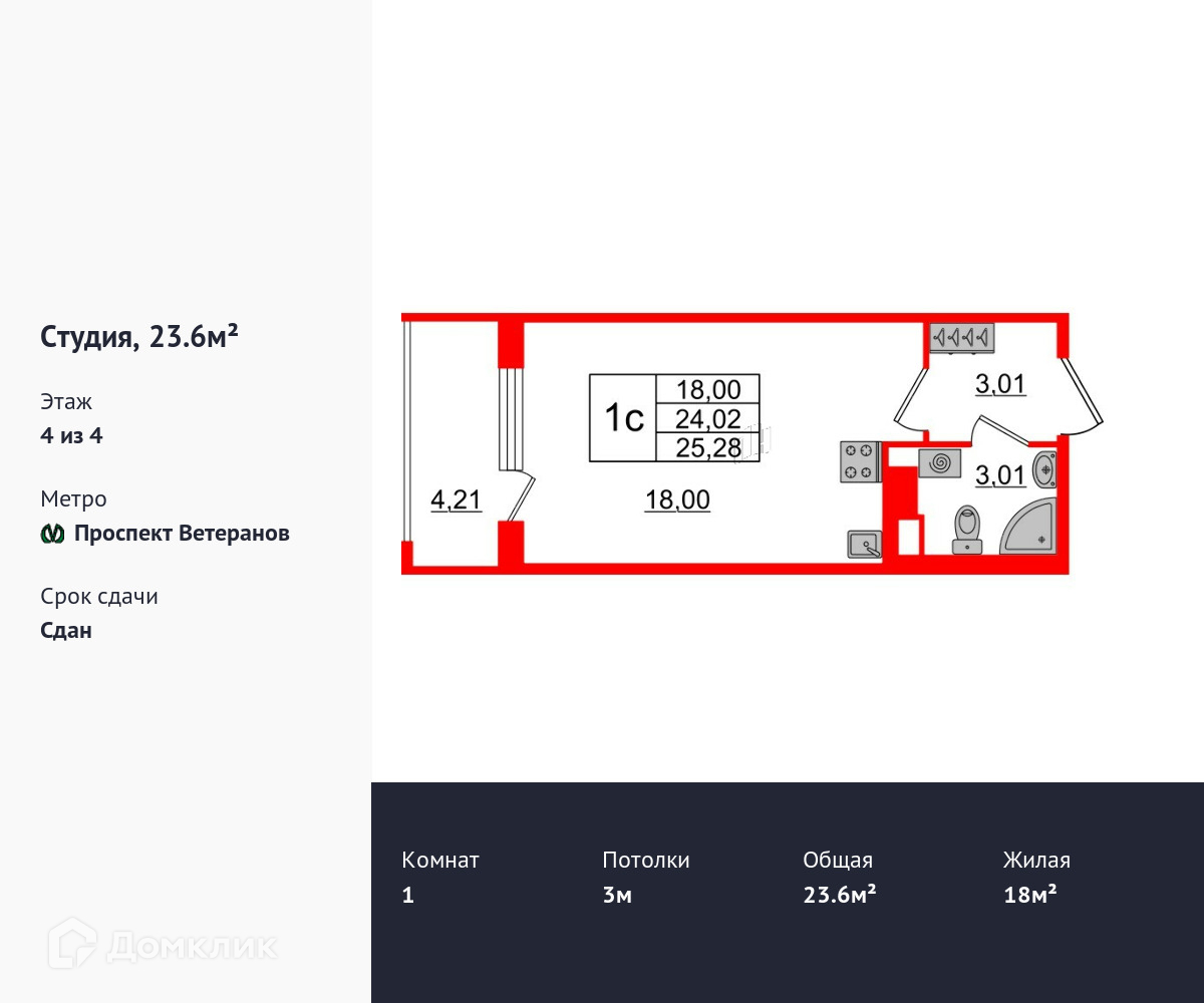 Общая площадь 23.6 м2