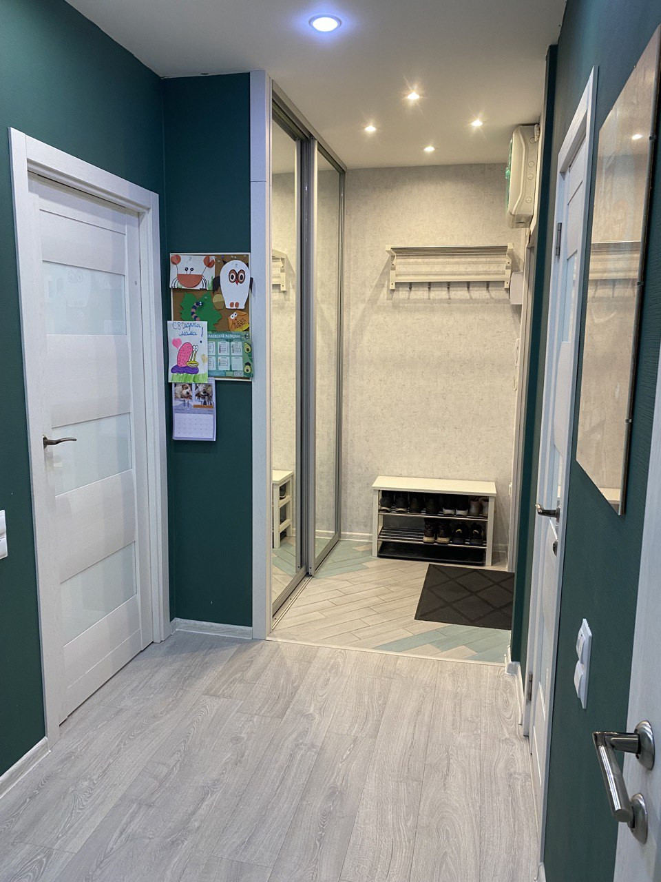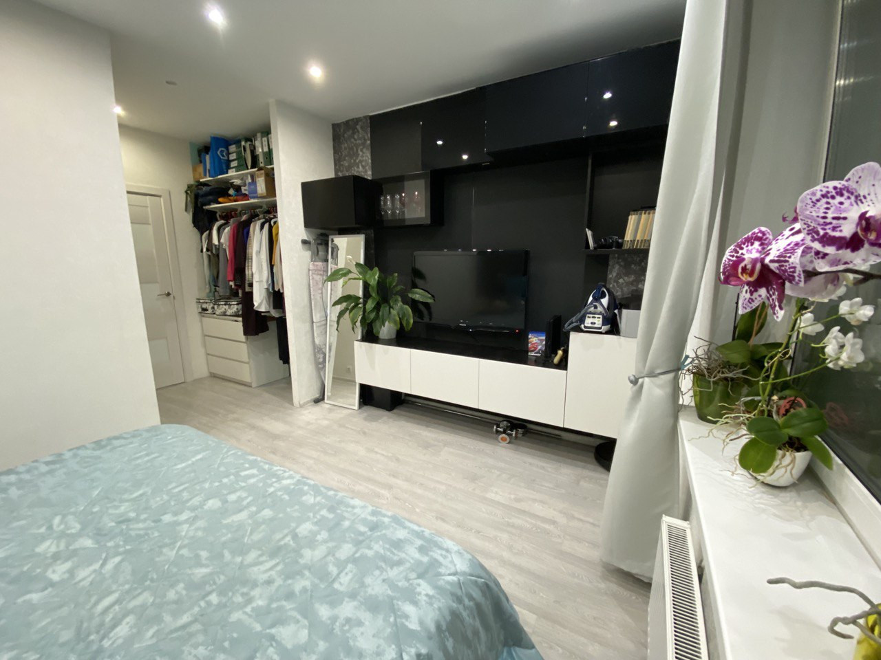 Грамотно организовано пространство для хранения, имеется встроенный шкаф в прихожей и спальне, плюс стеллаж в туалете.