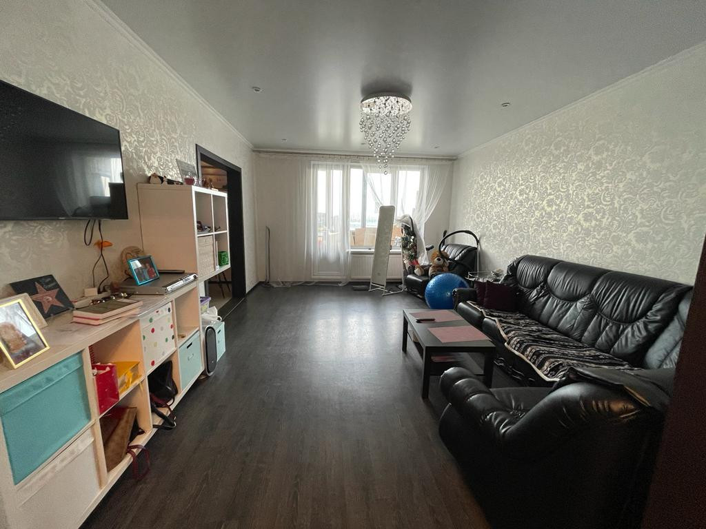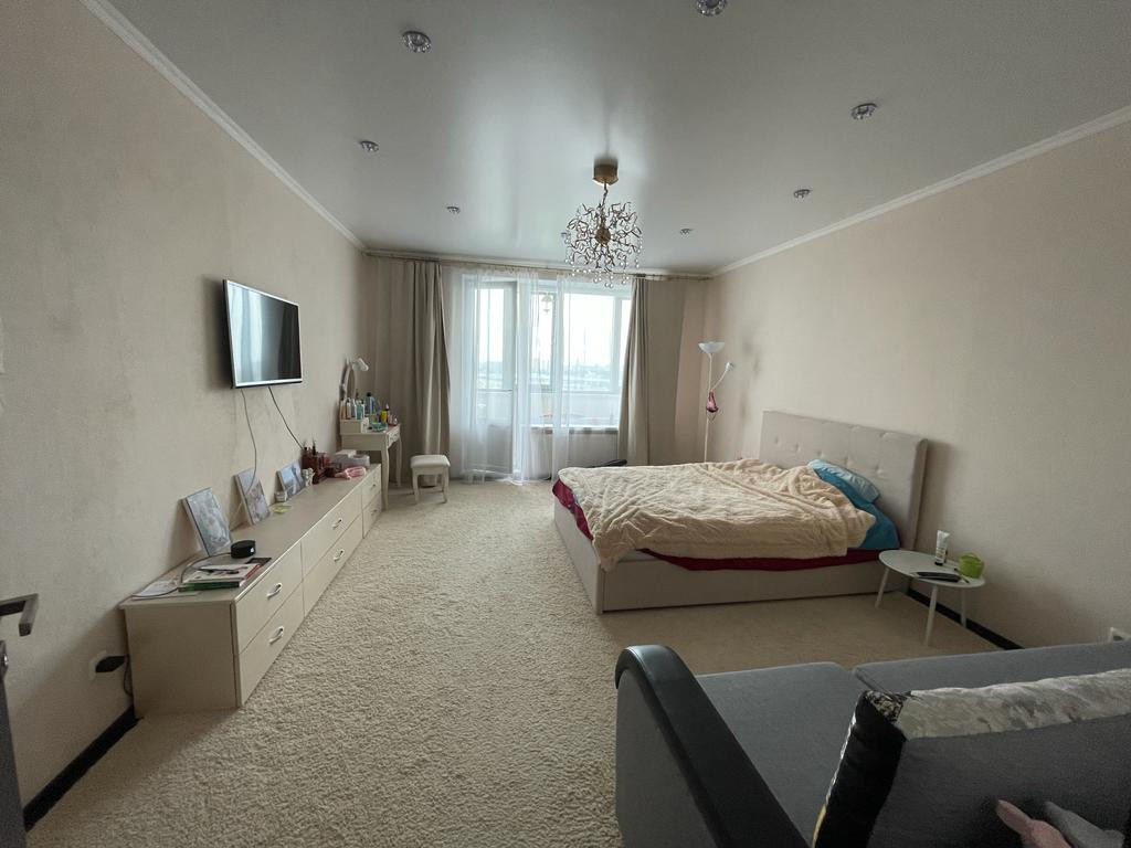 Большая 3-х комнатная квартира-101,5 кв.м, расположена на 13 этаже, прихожая- 18,7 кв.м длиной почти 9 м., комнаты изолированные- 22,5 кв.м; 21,8 кв.м, 17,7 кв.м, кухня-12,6 кв.м, большая лоджия-20,5 кв.м длиной 11,6 м., где можно разместить дополнительно кабинет или комнату для занятия спортом. Два санузла -5 кв.м и 2 кв. м., установлены счетчики на воду, душевые кабины, стены отделаны кафелем. Во всех комнатах пластиковые окна, натяжные потолки с люстрами и встроенными светильниками. Окна трех комнат (вдоль которых расположена лоджия) выходят на пр. Просвещения, окно спальни - во двор. За счет лоджии в квартире очень тихо. Хорошие, доброжелательные соседи.