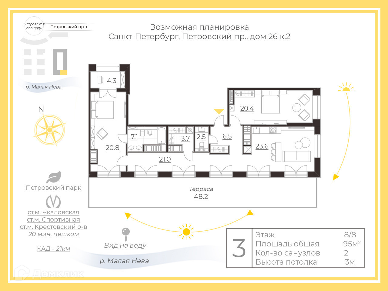 Квартира с прекрасной террасой площадью в 48 м2, лучший - последний этаж.  Шесть панорамных окон в пол с выходом на террасу.  Открывающийся перед вами панорама - от исторического центра Петербурга  до Финского залива, не оставит никого равнодушным. Все рассветы и закаты будут ваши.
