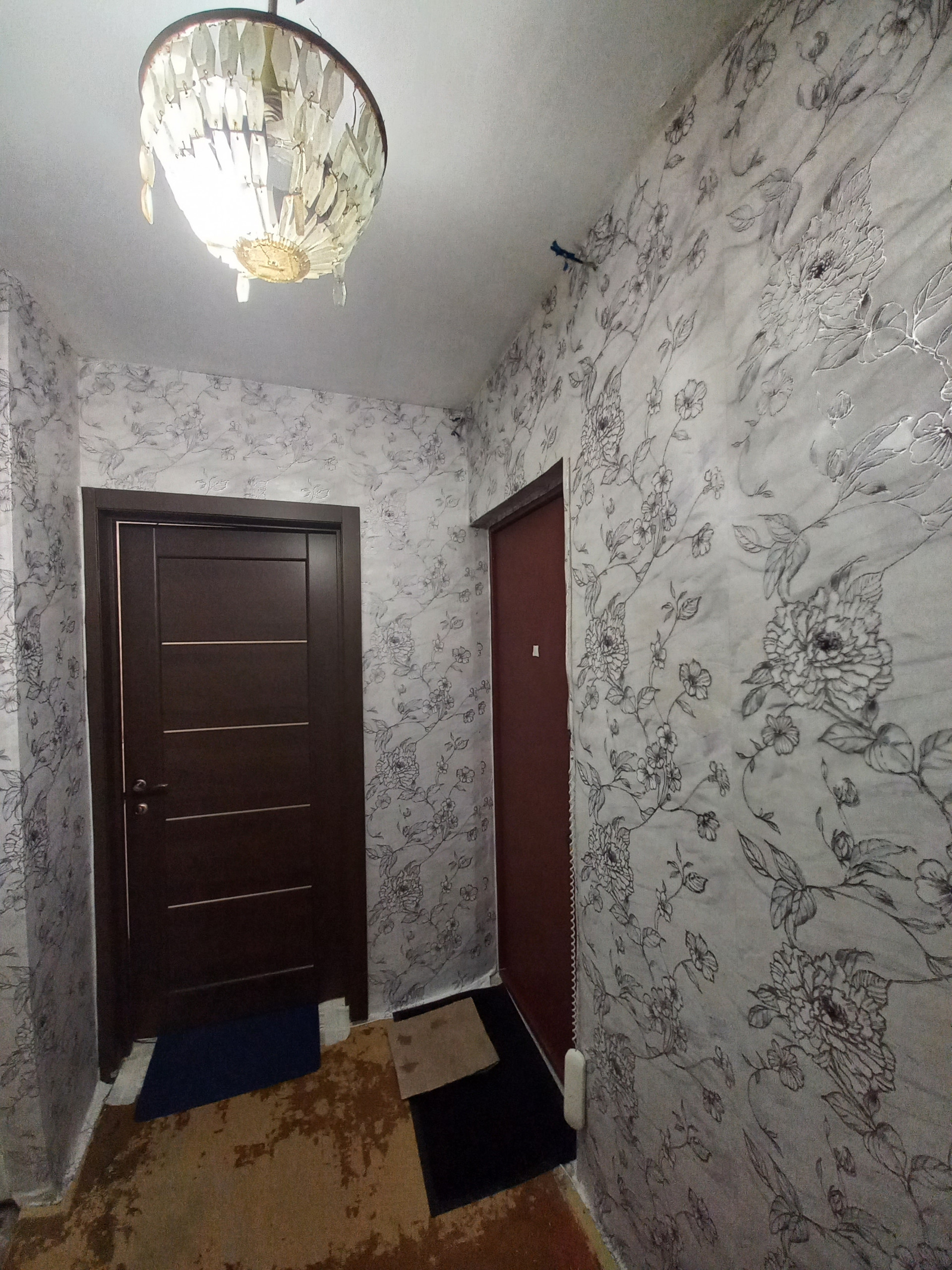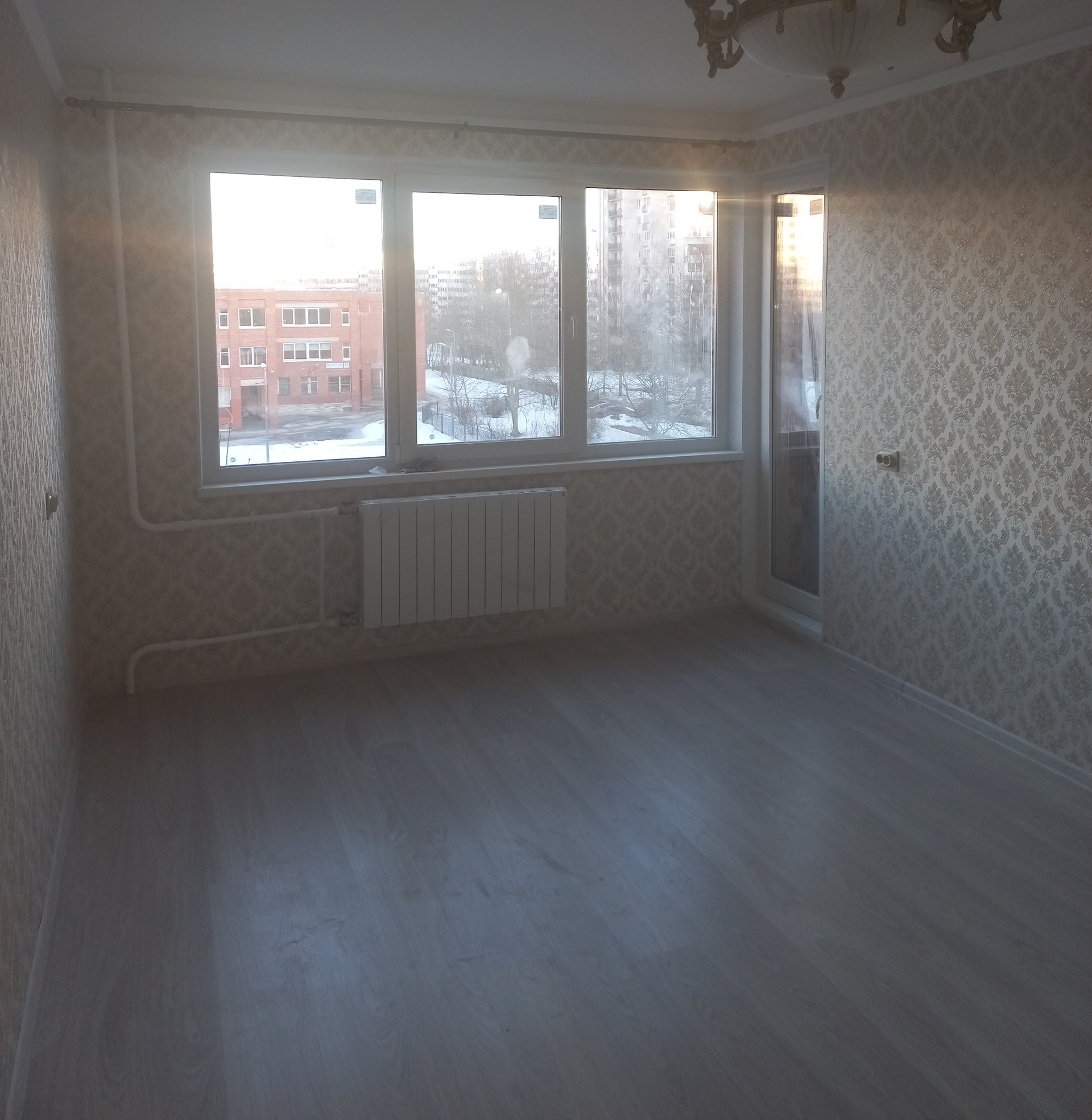 В комнате установлен новый радиатор отопления и поклеены дорогие и красивые обои.