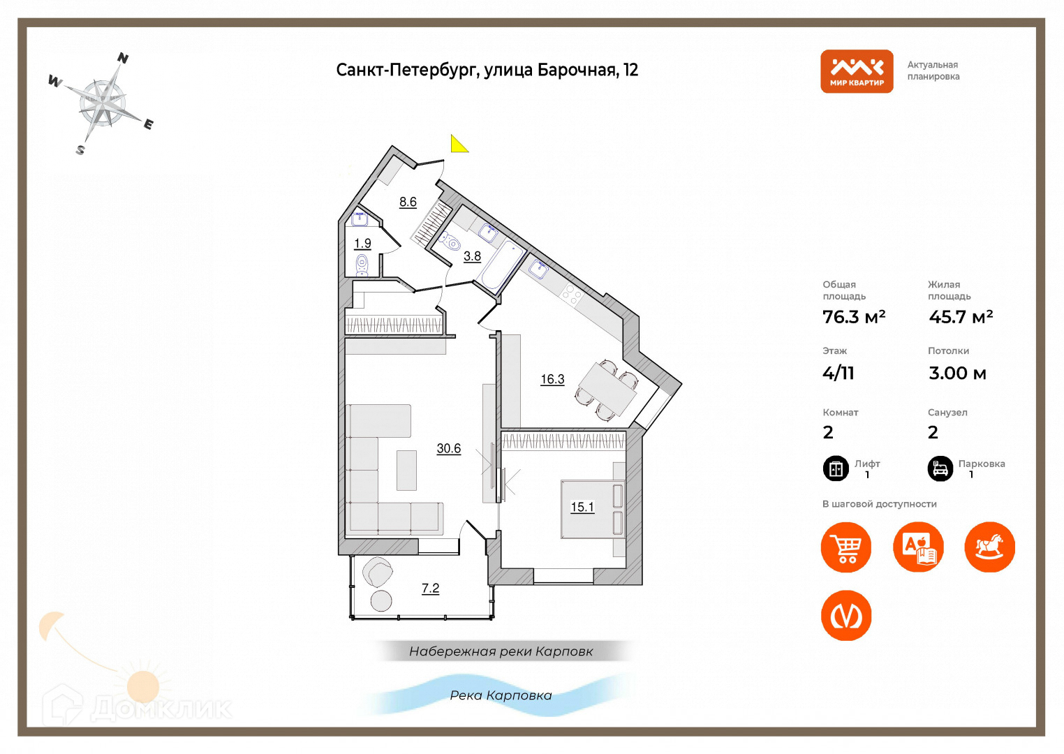 Общая площадь 76.3 м2