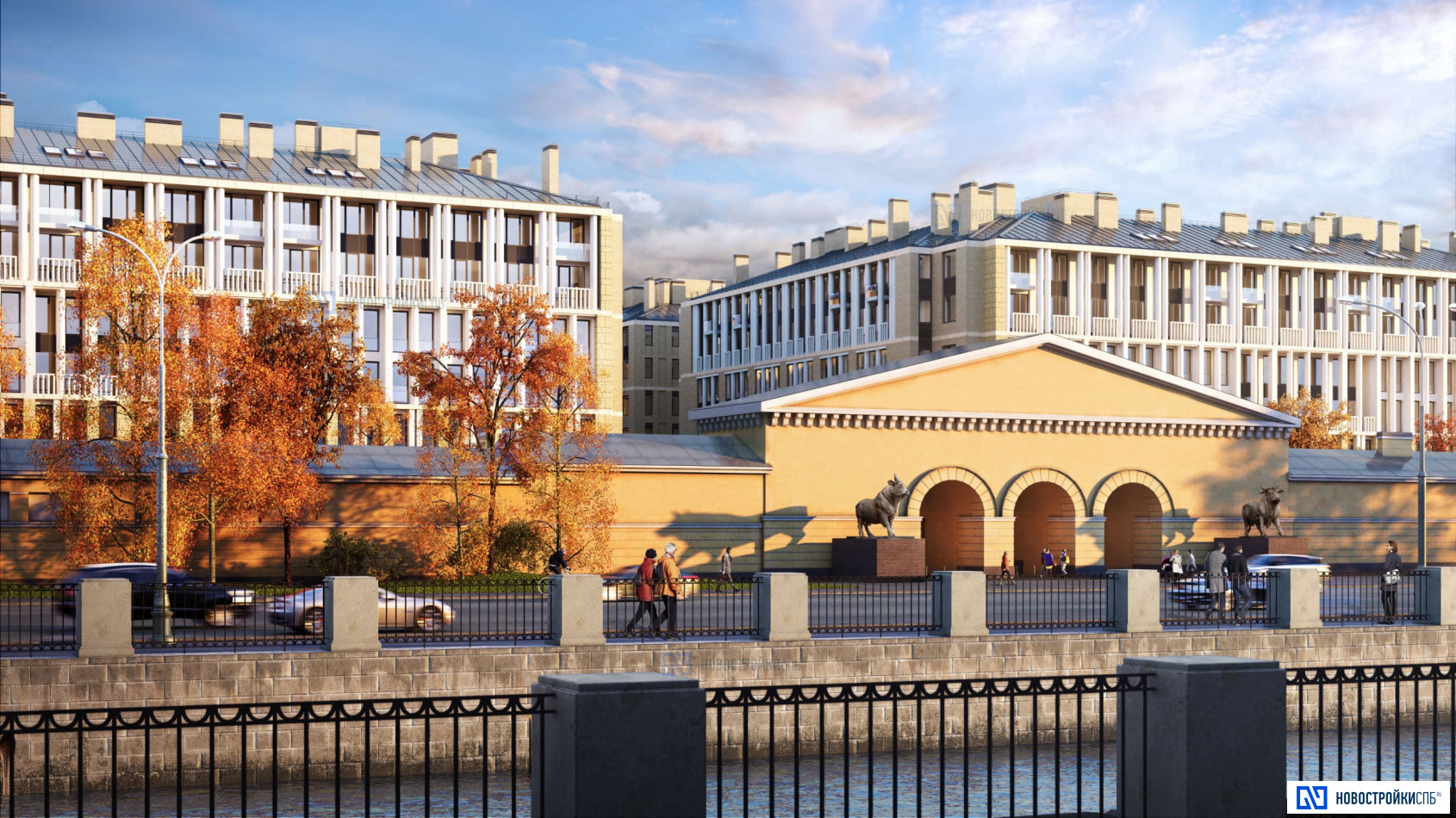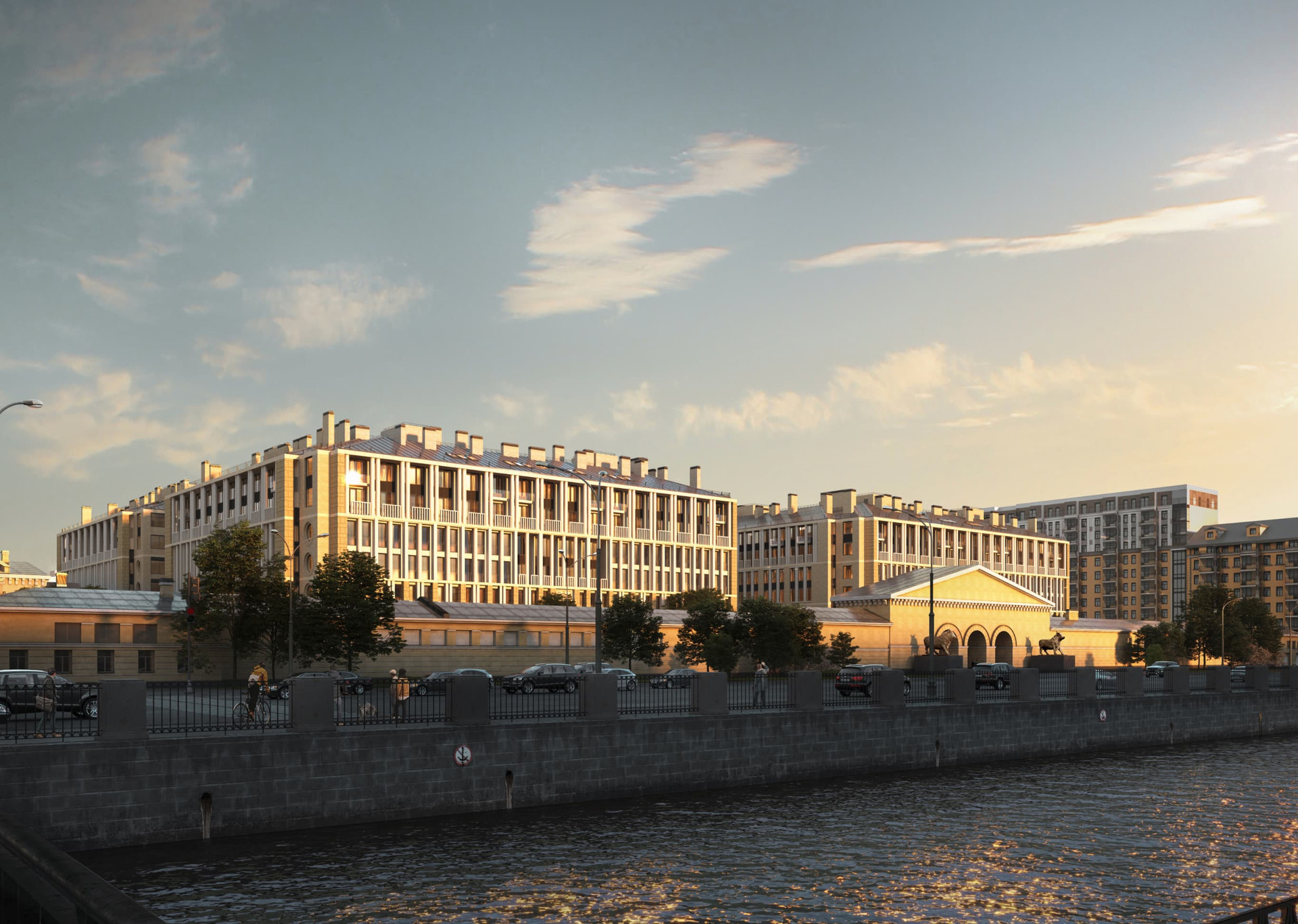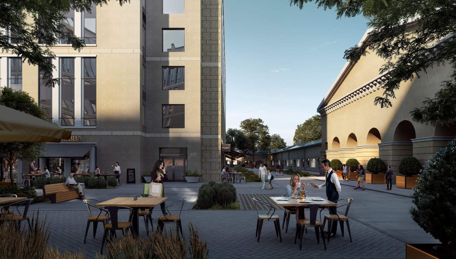 По периметру комплекса проходит живописный прогулочный променад с кофейнями, ресторанами, магазинами и зеленой зоной отдыха. Внутренние дворы закрыты и свободны от автомобилей. На первых этажах размещены коммерческие помещения. На территории комплекса построен собственный детский сад.