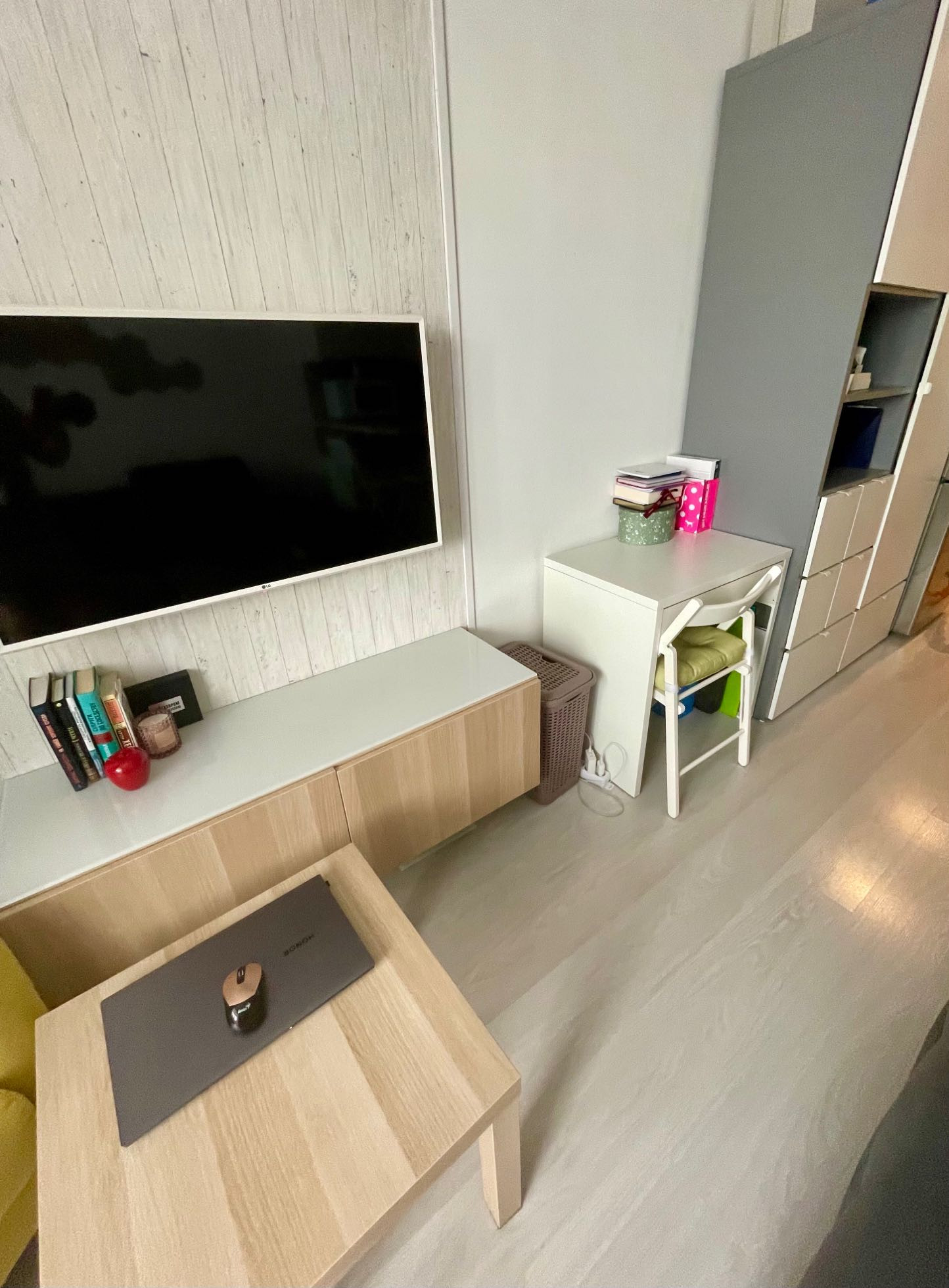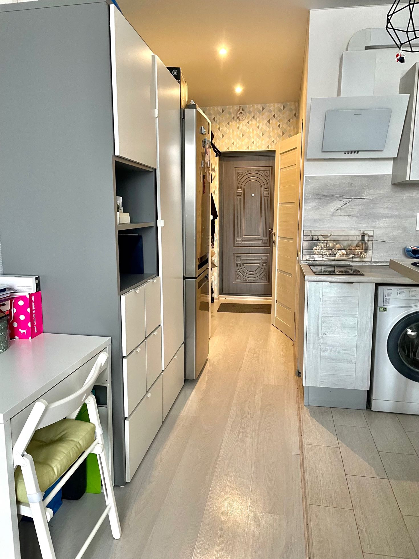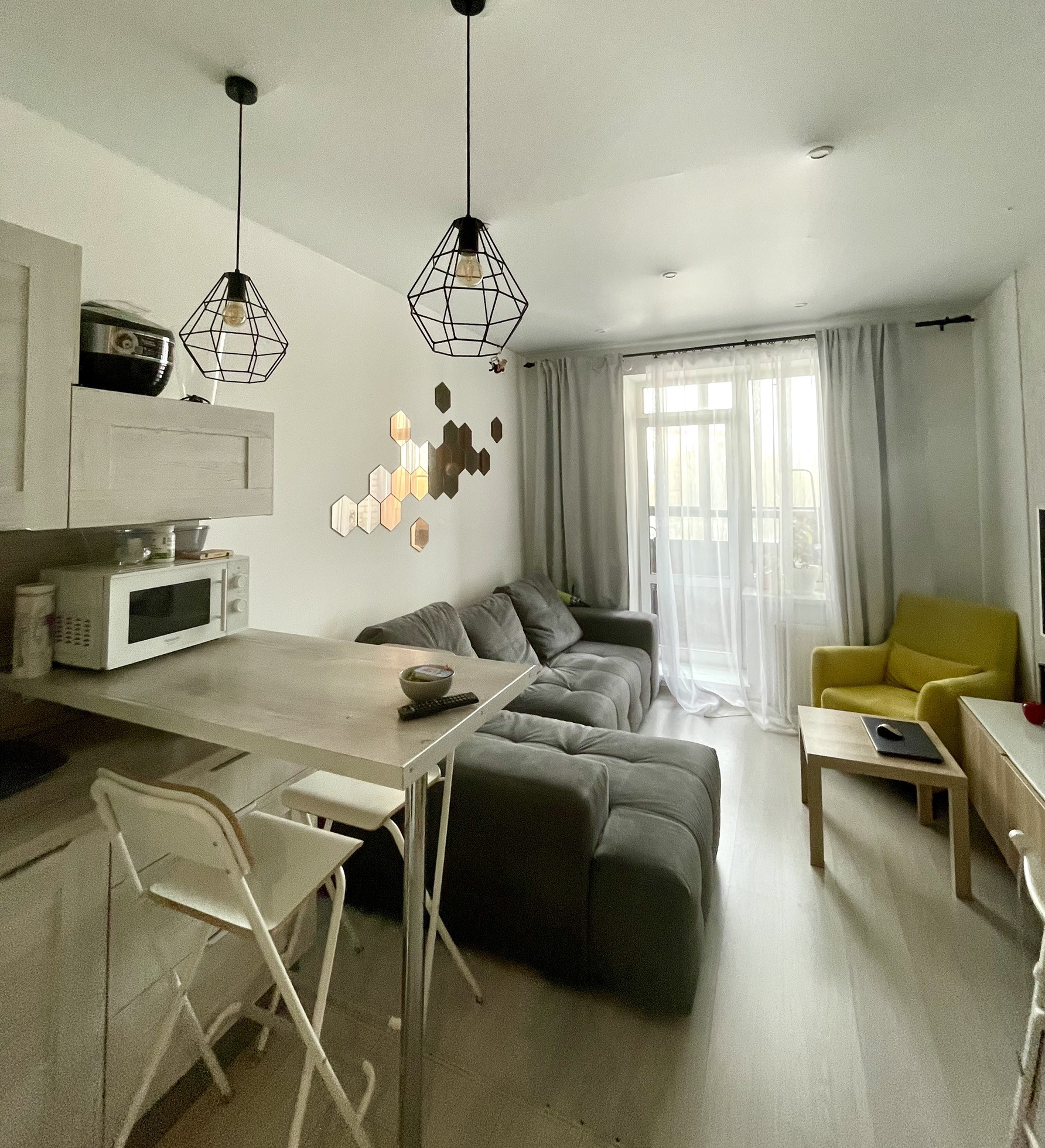 + эргономика пространства, мебель соразмерна помещению, не загромождает его физически, можно свободно перемещаться по дому, не натыкаясь на перегородки и предметы: