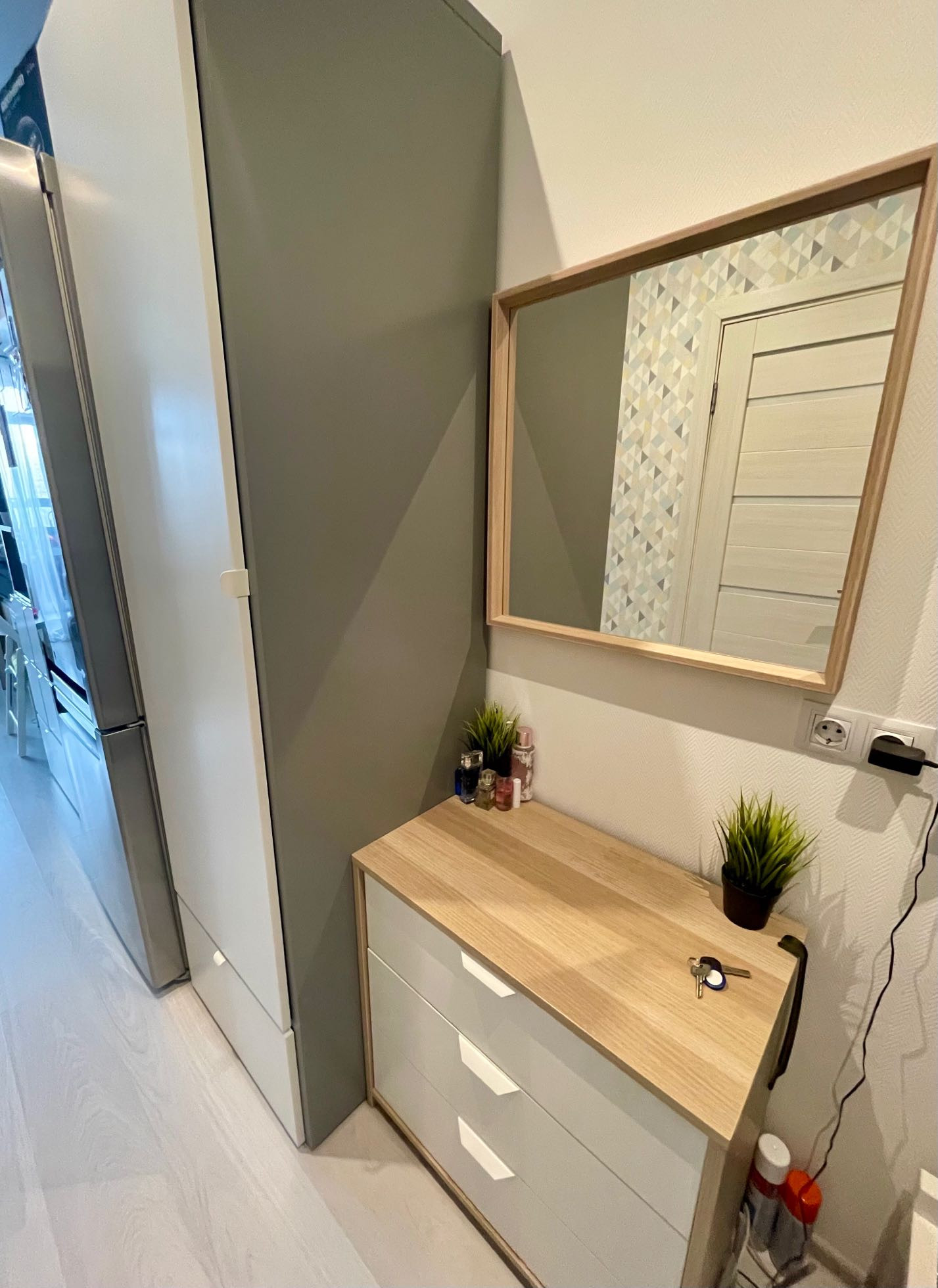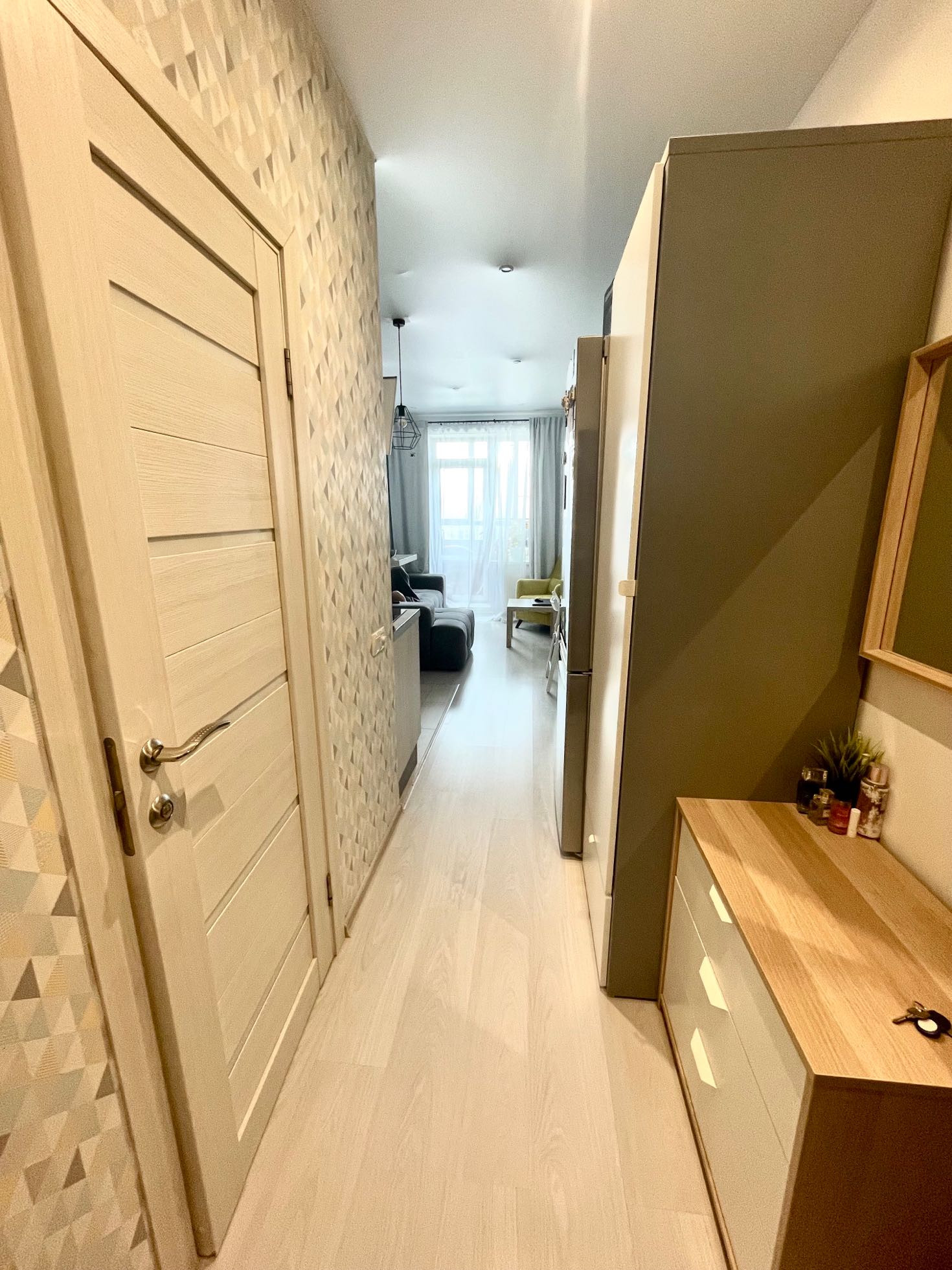 + выполнен качественный `для себя` евроремонт с привлечением профессиональных дизайнера и строителей, светлые тона, использованные в отделке прихожей, комнаты и кухонной зоны, визуально расширяют все жилое пространство, `не давят` стены и потолок; в санузле стены, пол и душевая кабина выполнены из кафеля под мрамор `Forest Brawn`, теплый цвет в сочетании со строгостью;