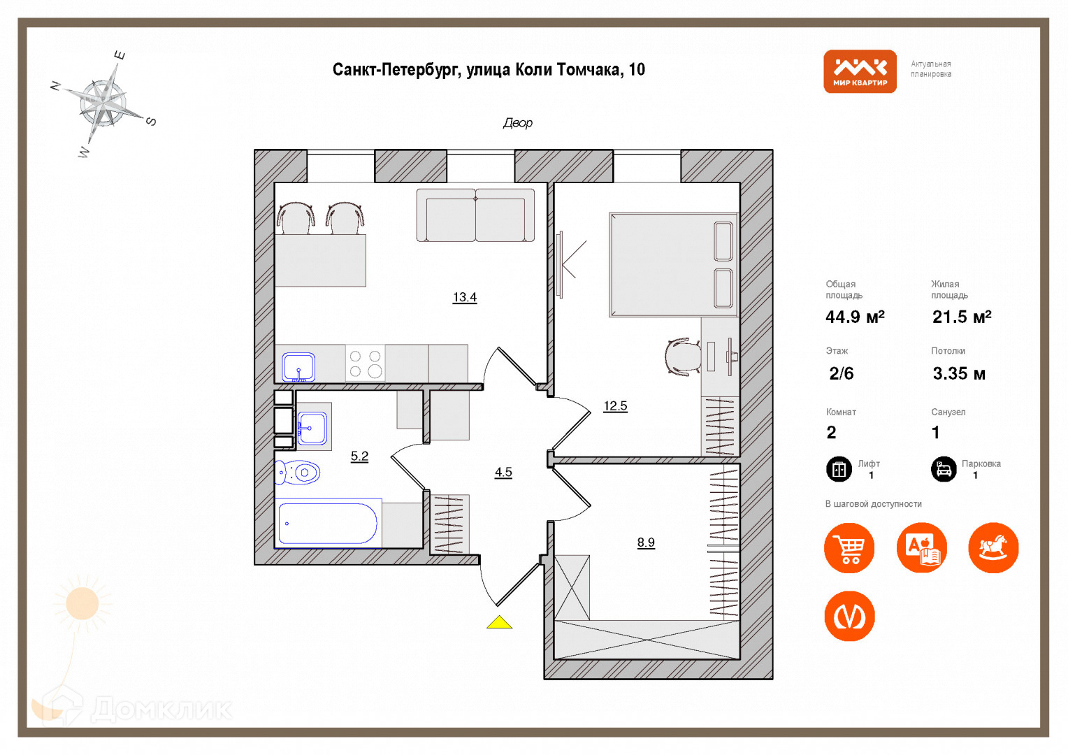 Общая площадь 44.9 м2