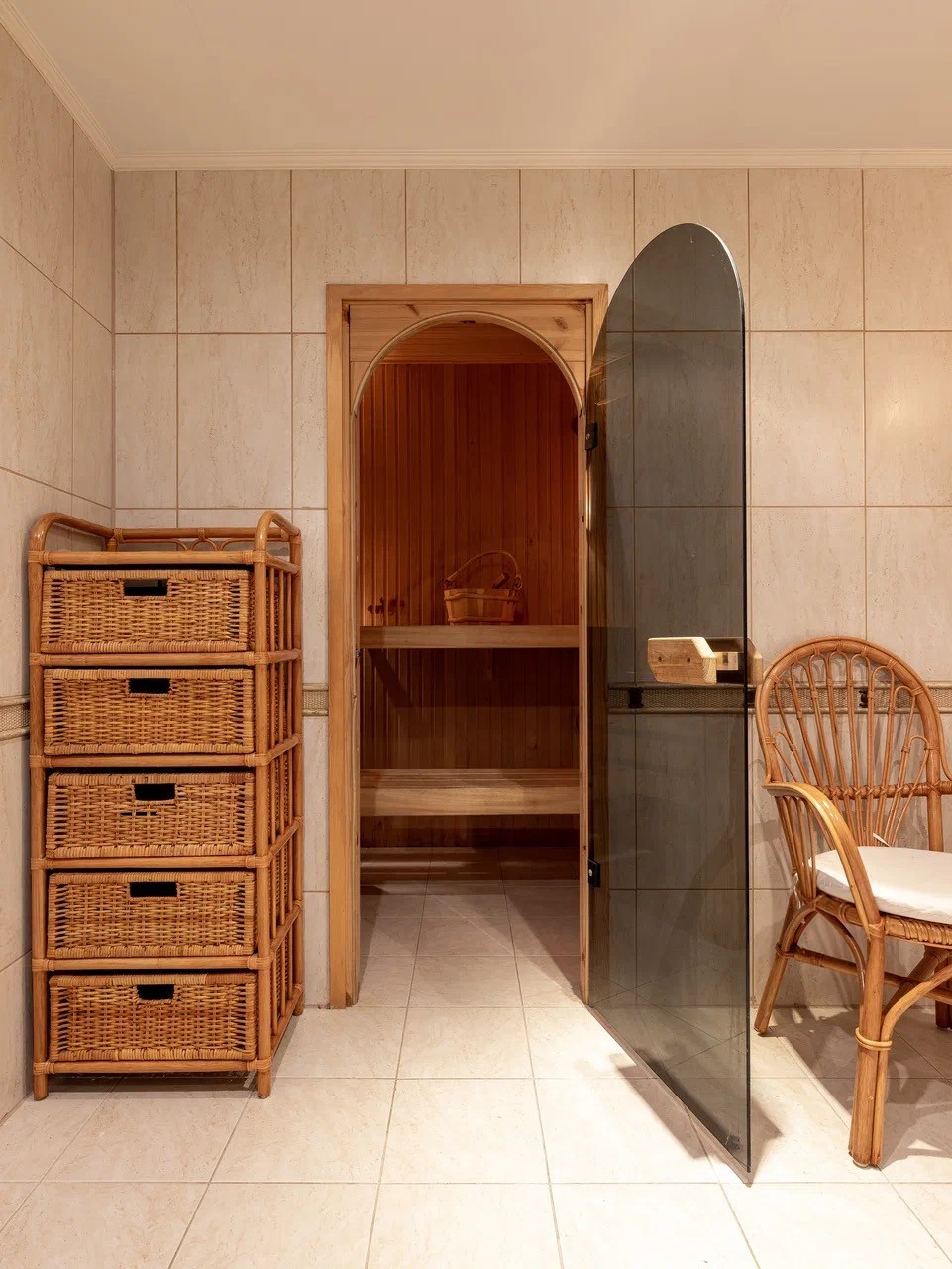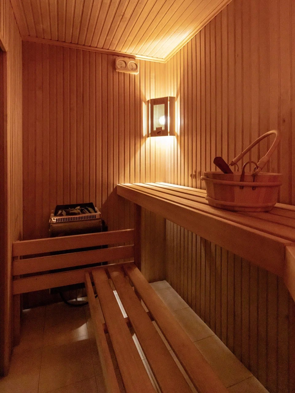 На цокольном этаже находятся два гаража, постирочная, гардеробная , санузел и финская сауна с душем.