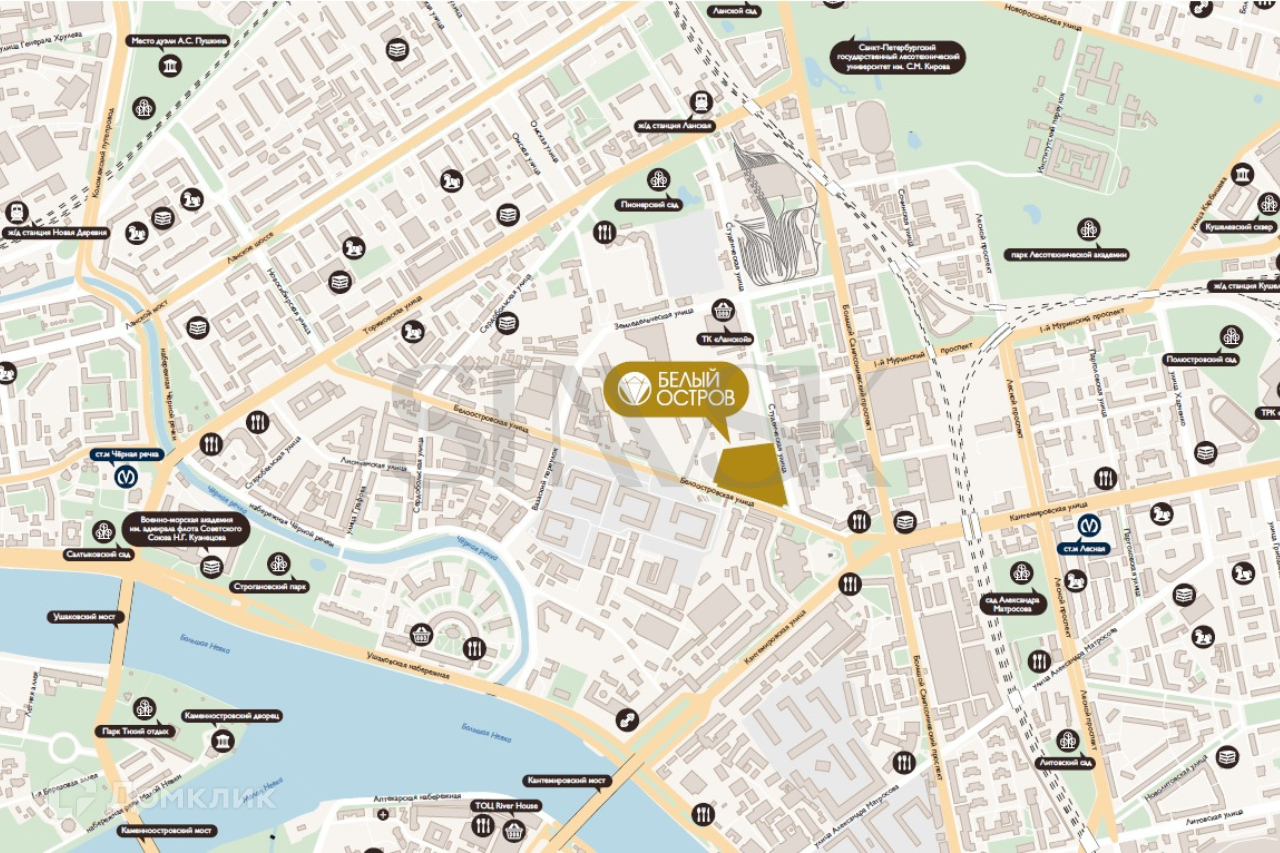 ЖК Белый остров расположен в Приморском районе с развитой транспортной инфраструктурой. В пешей доступности есть две станции метро: Лесная 12 минут пешком (900 метров) и Черная речка 21 минута пешком. Также в пешей доступности две железнодорожные станций: Ланская и Кушелевка.