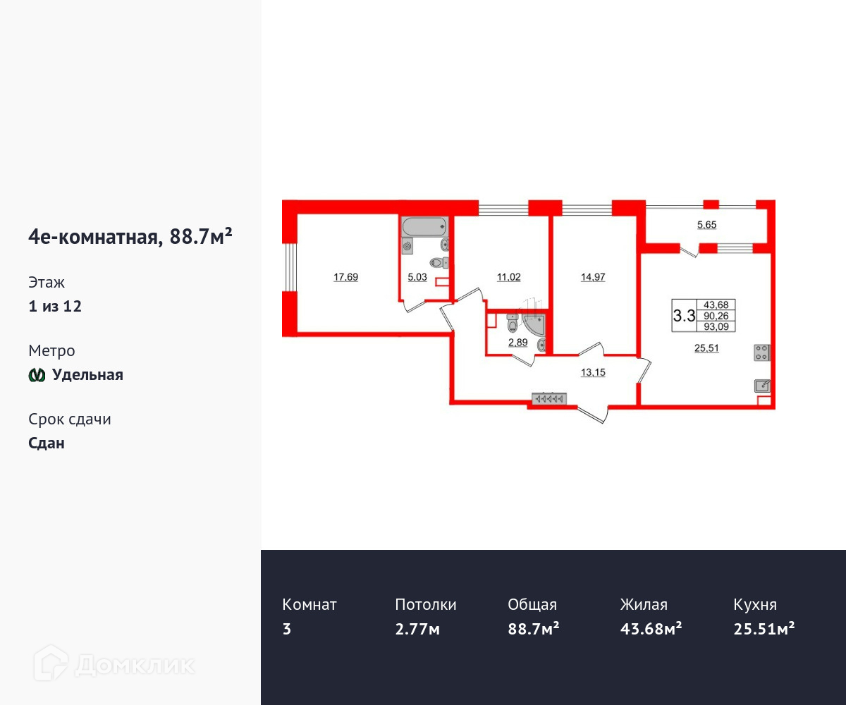 Продается трехкомнатная квартира в ЖК Панорама парк Сосновка площадью 88.7 м2 (жилая площадь – 43.68 м2). Квартира расположена рядом с метро Удельная. Расстояние до метро 15 Мин.пешком. Площадь кухни 25.51 м2. Площадь прихожей 13.15 м2. Высота потолка 2.77 м. Чистовая отделка.