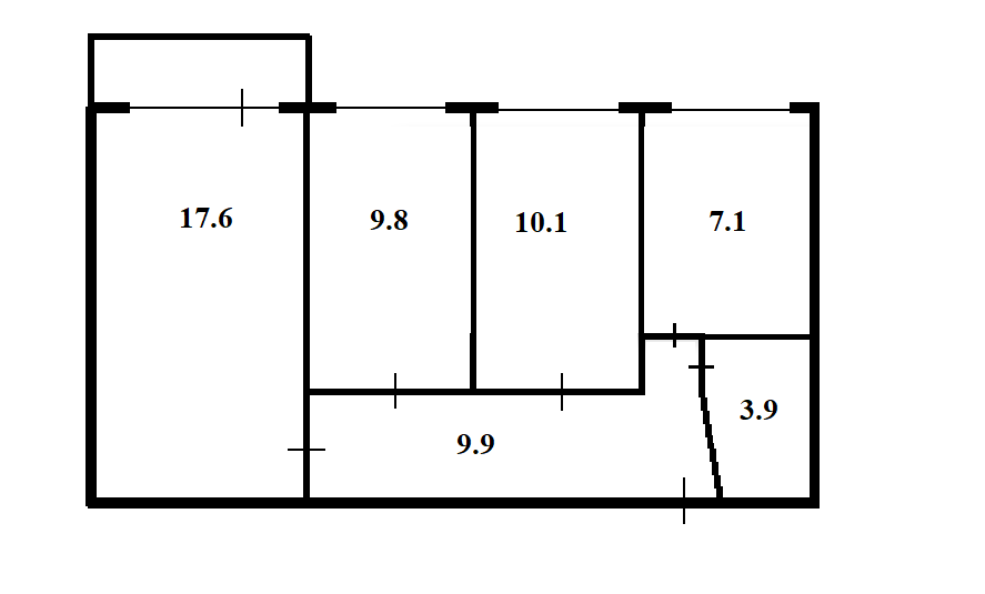 Кухня 7.1 кв.м., комнаты: 10.1+9.8+17.6 кв.м.