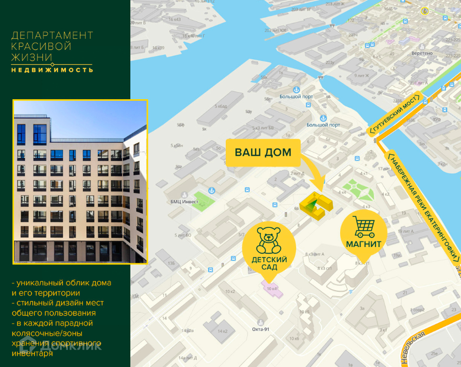 Огромный плюс комплекса - это расположение. Он окутан зеленью. Рядом находится парк Екатерингоф.