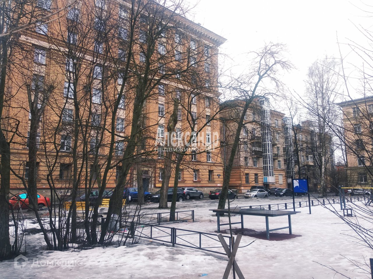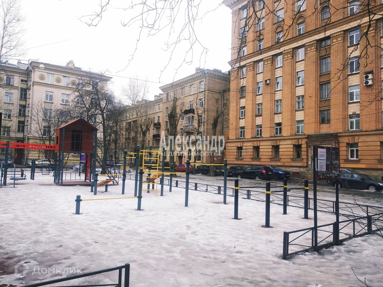 Вход из зеленого двора с новой спортивной игровой площадкой, фасад украшен монументальными декоративными элементами в стиле советского ампира.