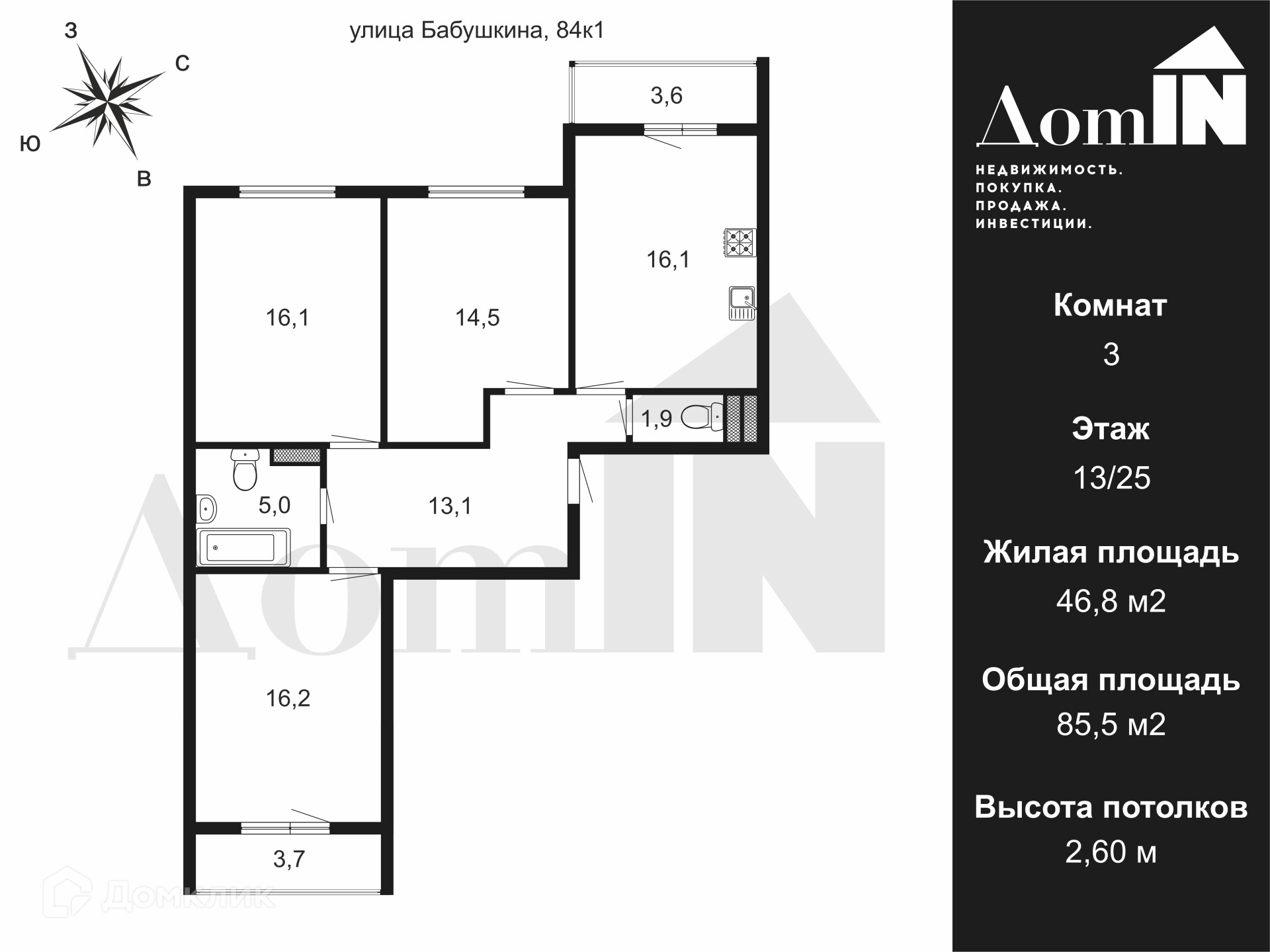 3-комнатная квартира, 85.5 м2, этаж 13 / 25, на продажу в Санкт-Петербурге, улица Бабушкина, 84к1