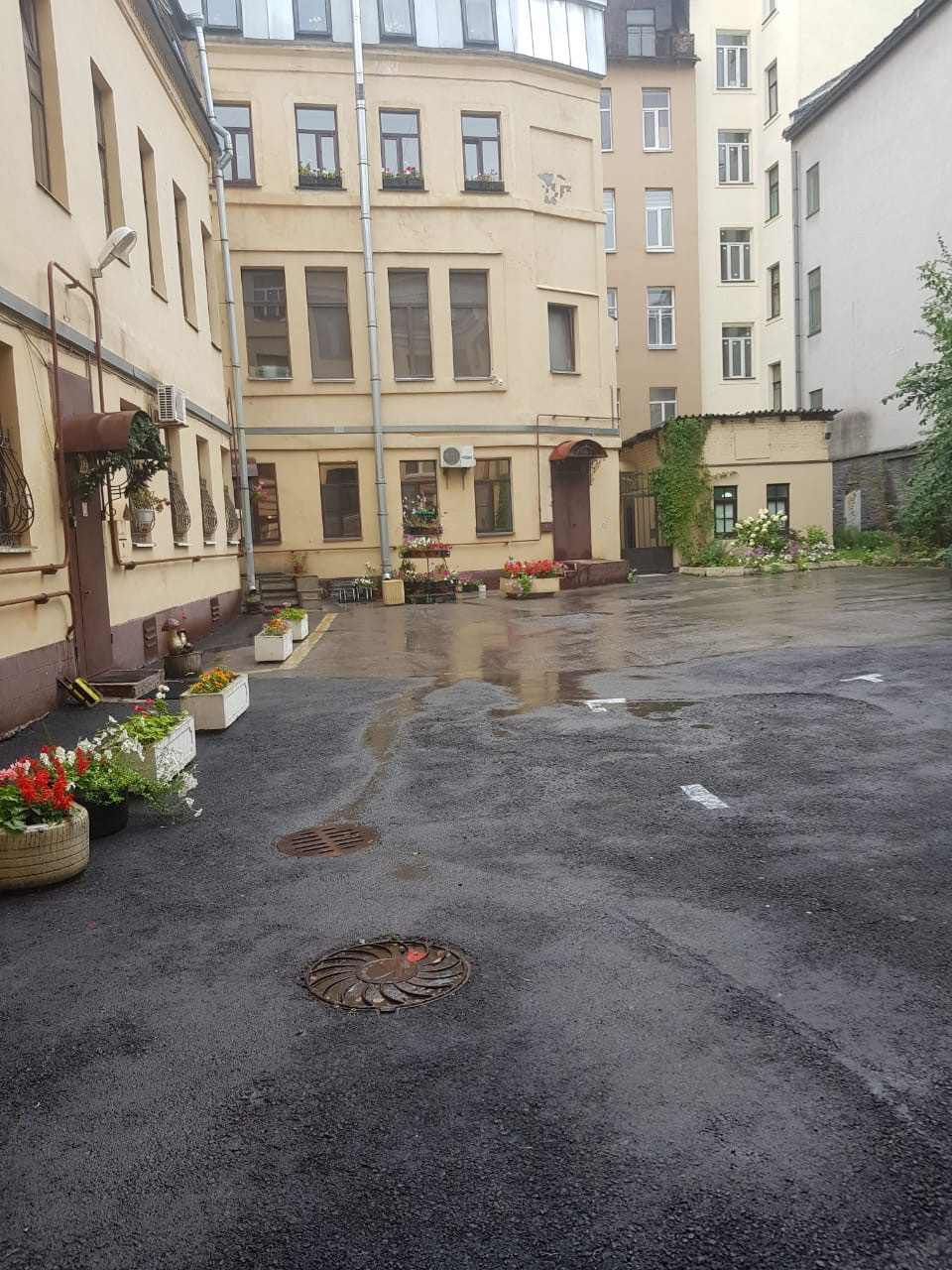 Двор закрыт, с зелеными насаждениями.