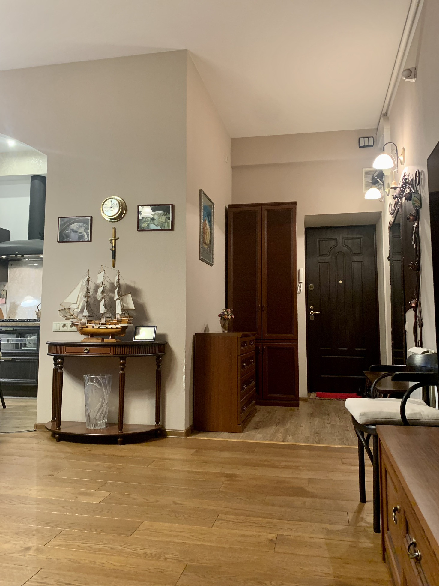 В отделки использовались качественные и экологичные материалы. Пол в  квартире - массив дуба; в прихожей , ванной комнате и на кухне - испанская плитка и смонтированы  полы с подогревом.
