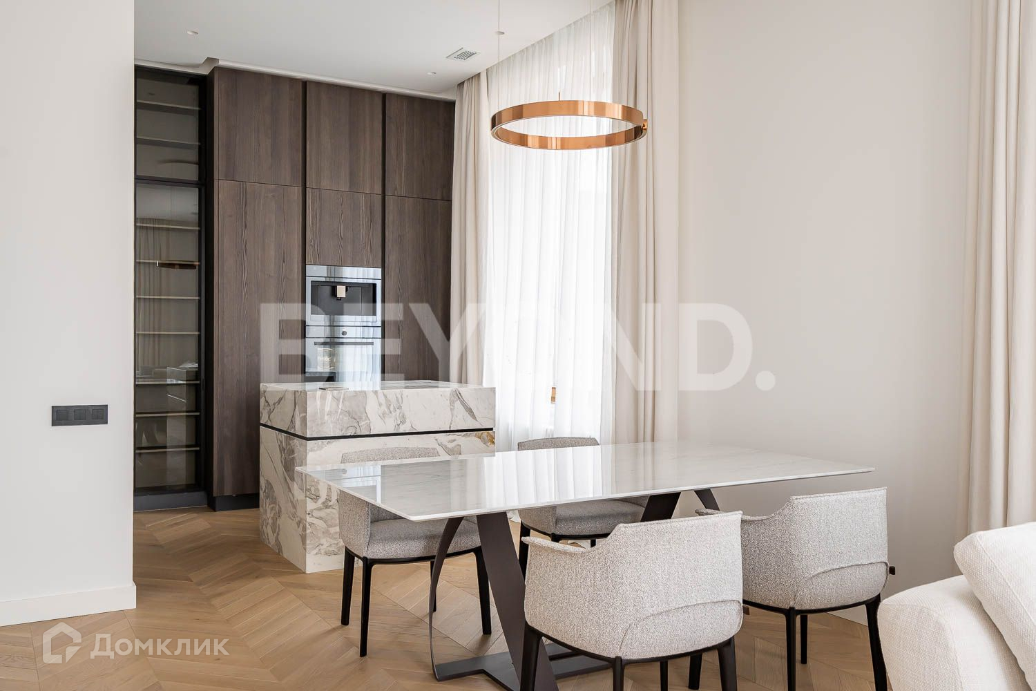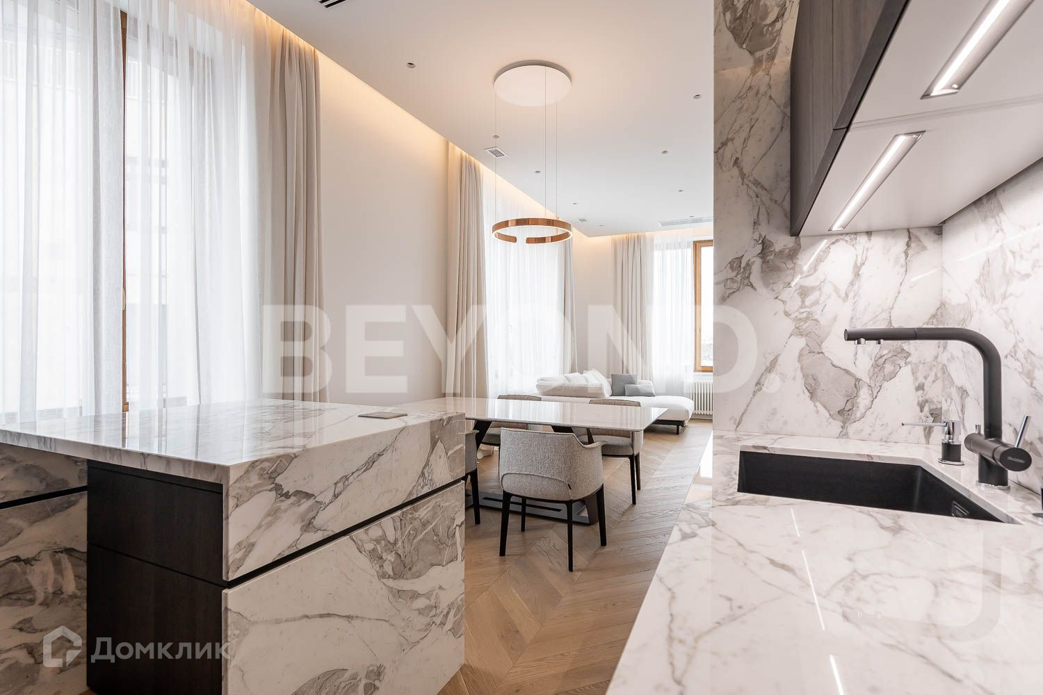 Гостиная c стремя окнами объединена с кухней-столовой с мраморным островом. Встроенная итальянская кухня полностью оборудована швейцарской бытовой техникой V-ZUG. Элегантная обеденная группа с мраморным столом и удобными креслами Poltrona Frau.