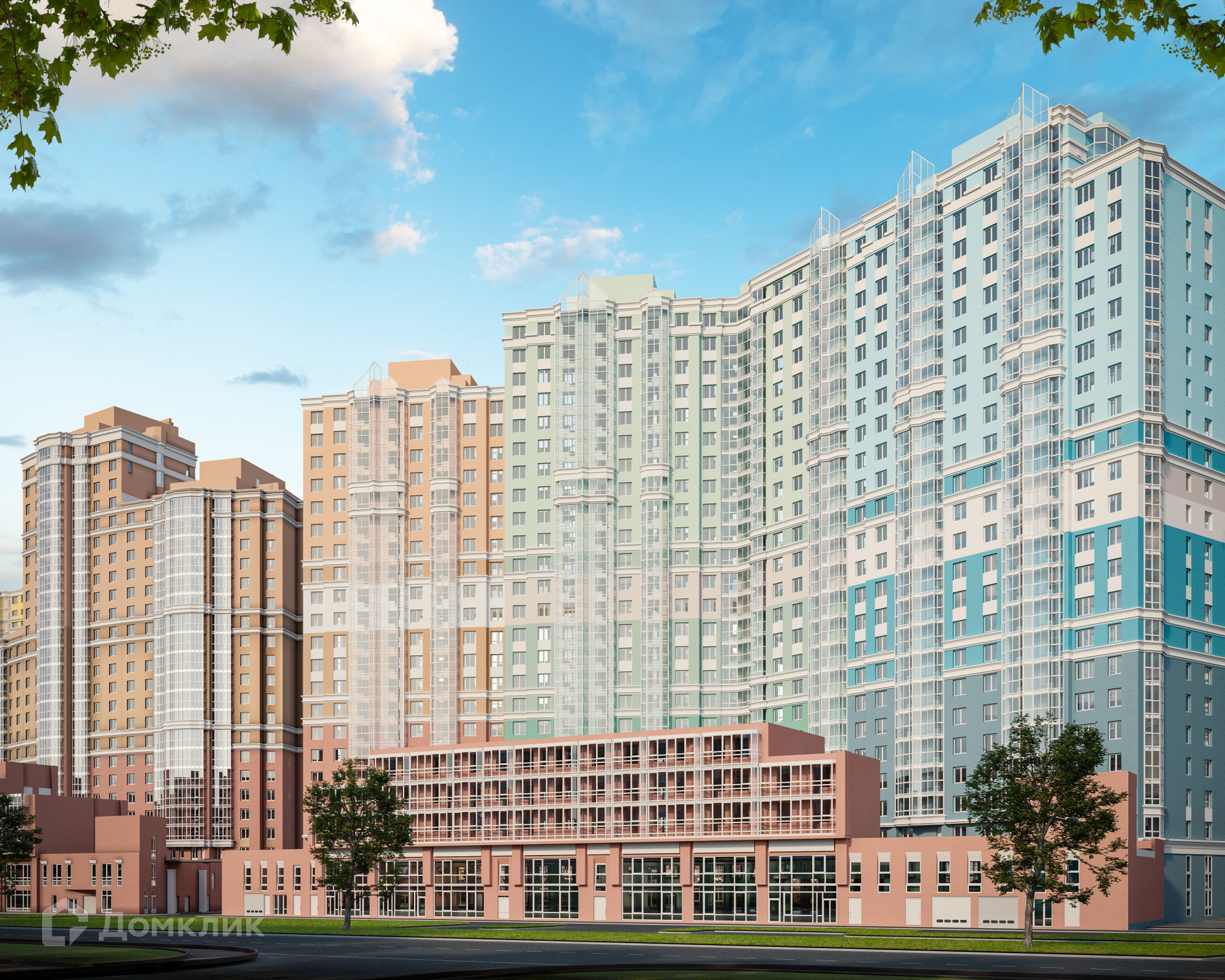 В состав комплекса помимо жилых корпусов со встроенными коммерческими помещениями входят: