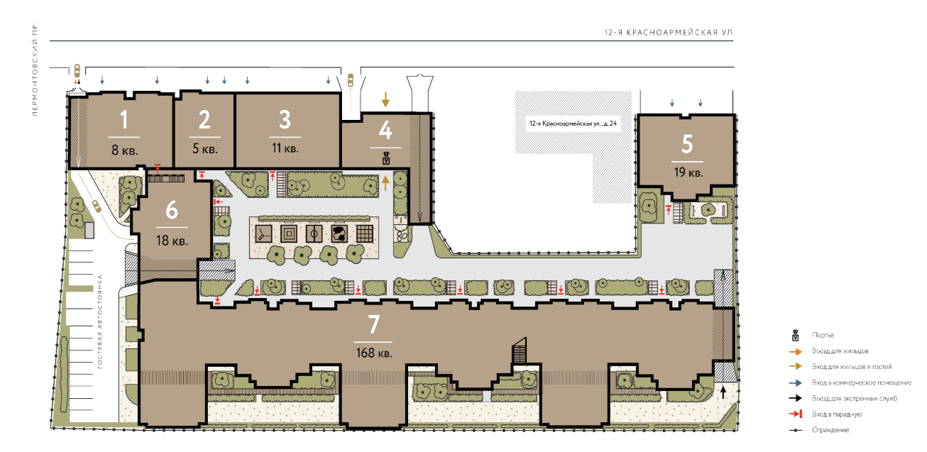 Внутренний двор приподнят над уровнем земли, под ним располагается паркинг.