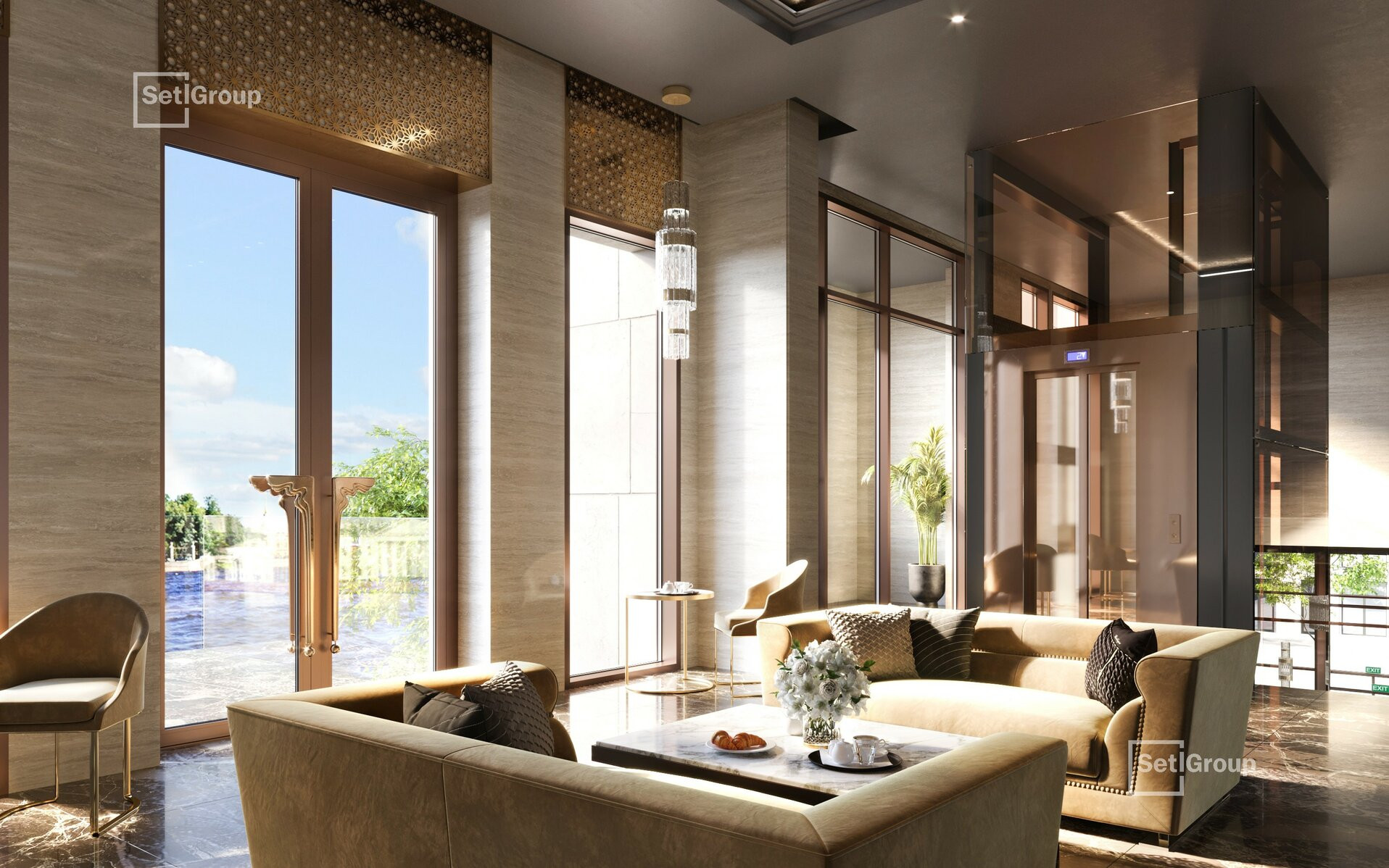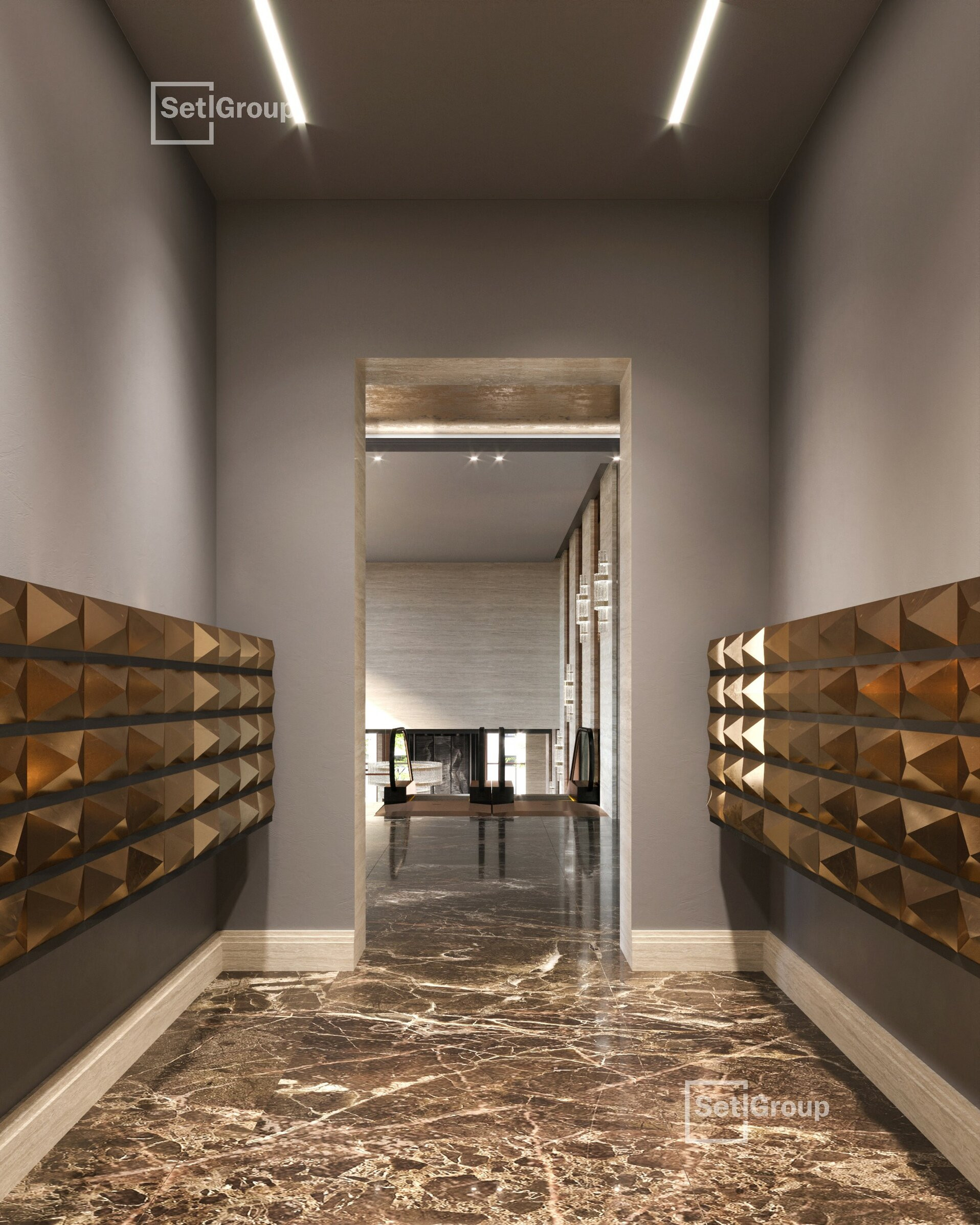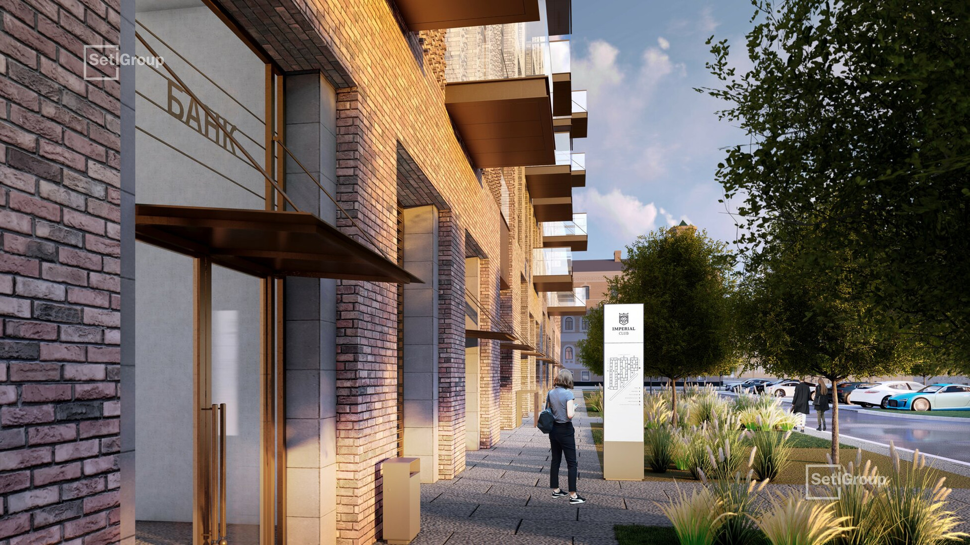 В роскошных интерьерах центральной входной группы гости и жители Imperial Club будут чувствовать себя особенными. Холлы в жилом комплексе двухуровневые, с эскалатором, дизайнерской мебелью, разноуровневым авторским освещением, лаунж-зоной и панорамными окнами.