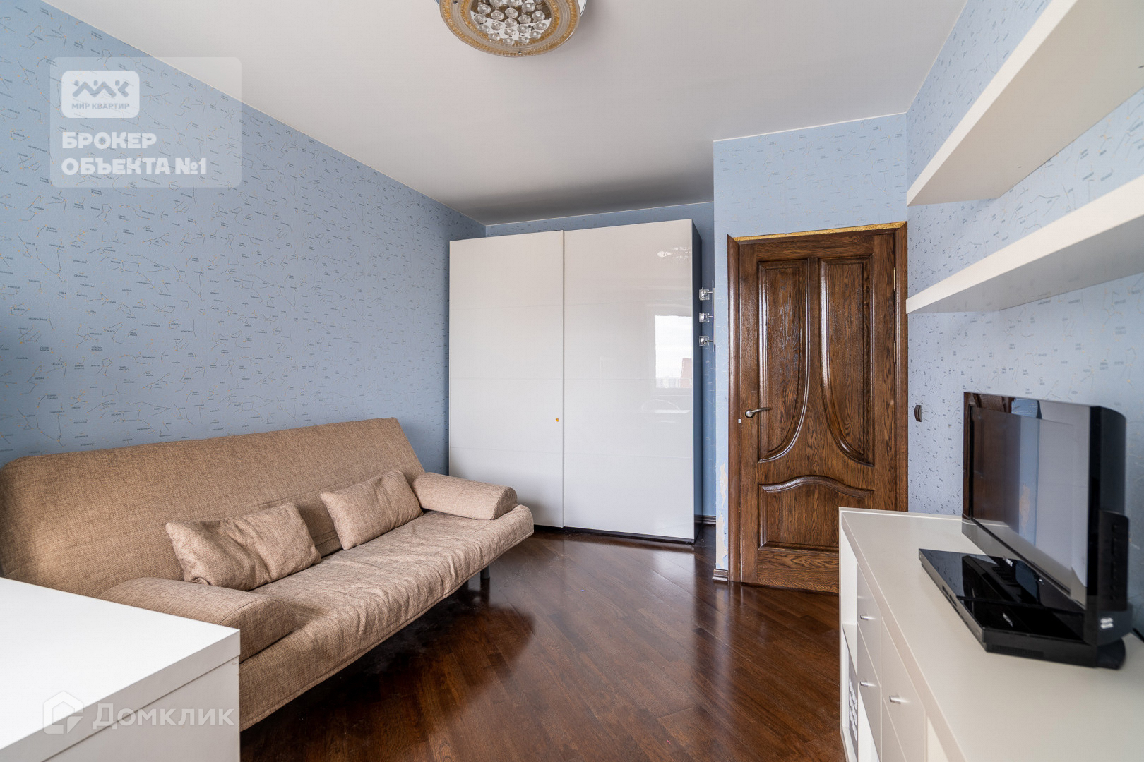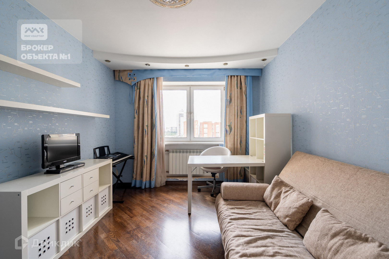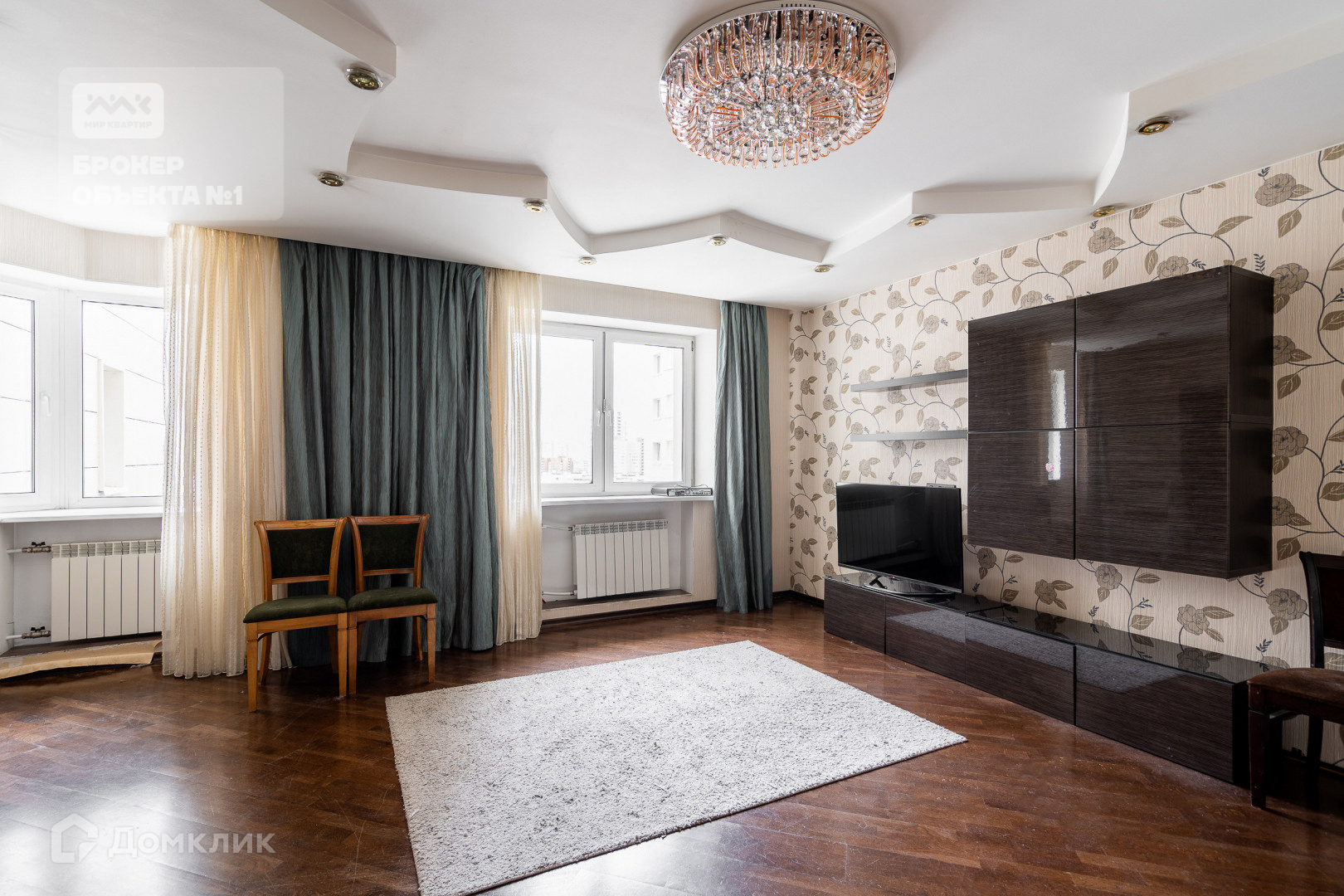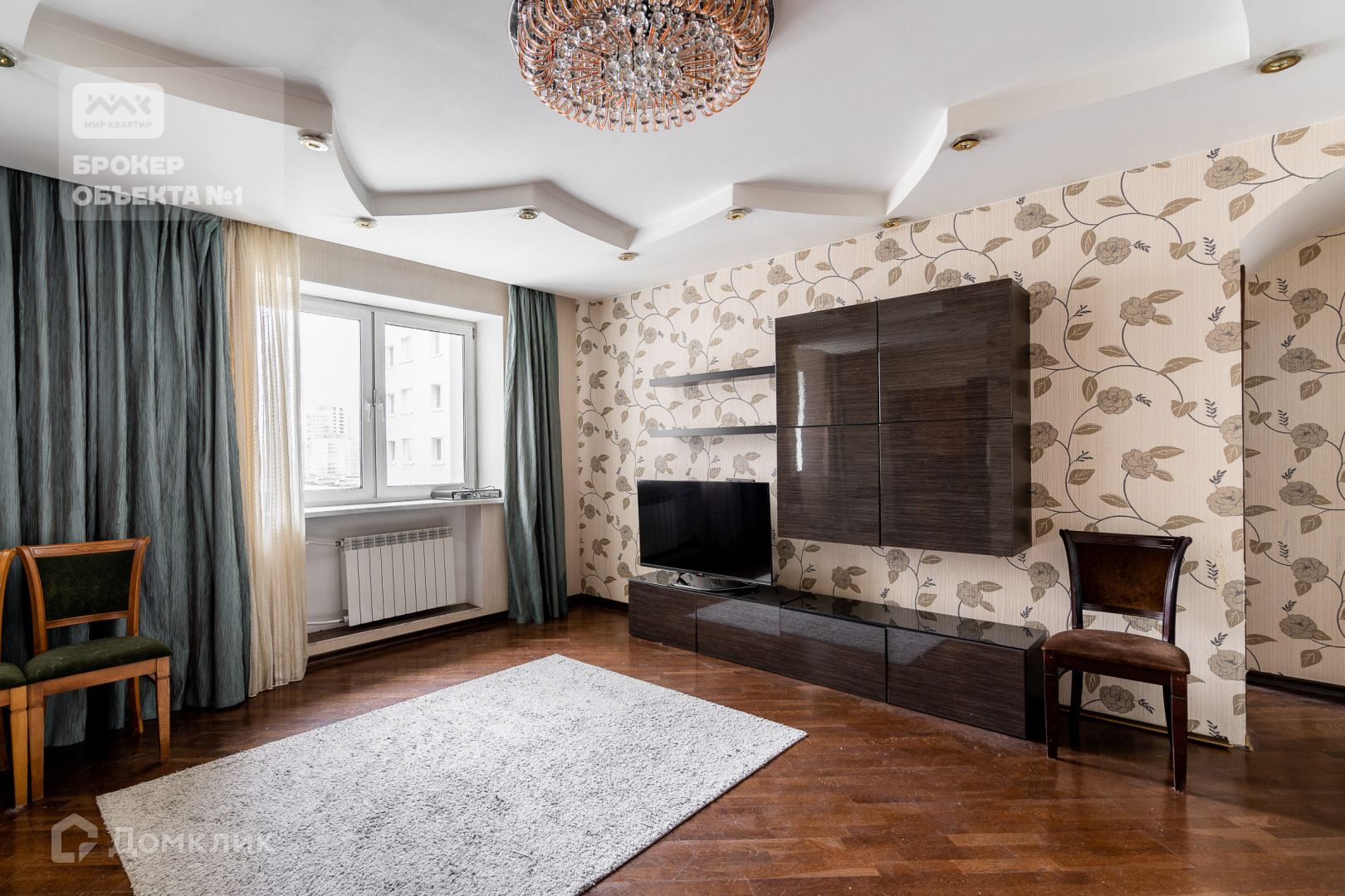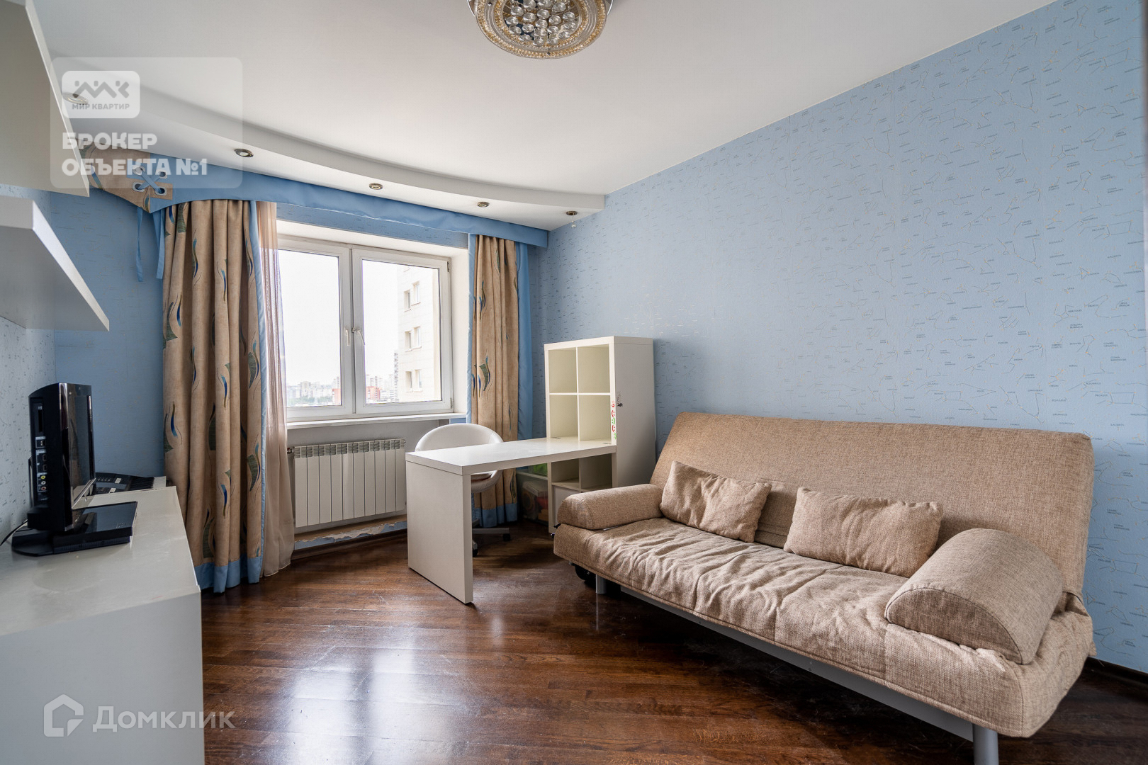 Отделка стен и пола выполнена в теплых и спокойных тонах. В просторной кухни-столовой остается вся бытовая техника. Мастер-спальня с санузлом, просторной гардеробной и застеклённой лоджией с видом на парк и Смольный собор.  Детская комната с балконом видом на парк. Вторая детская и гостиная в тихий двор.