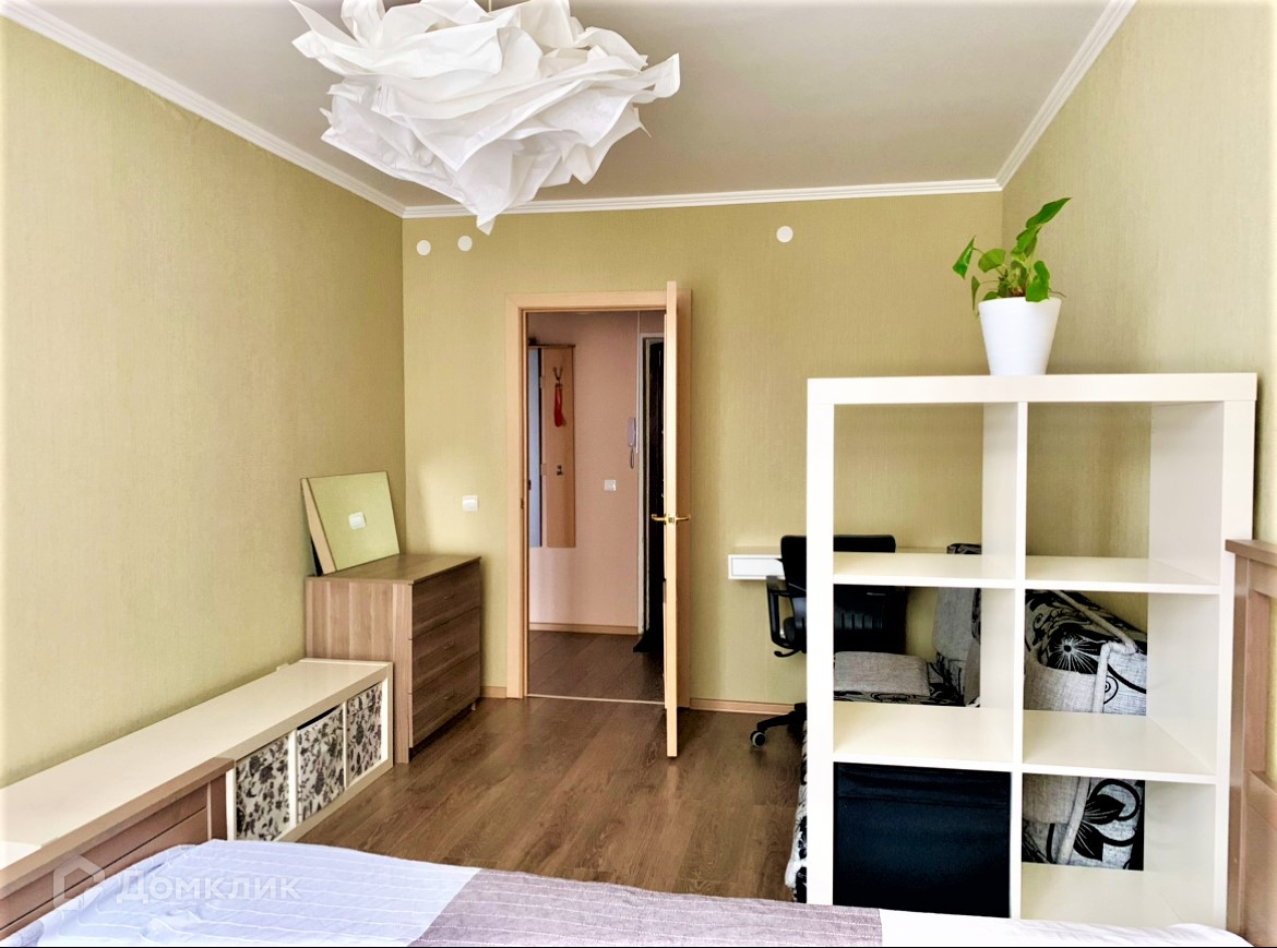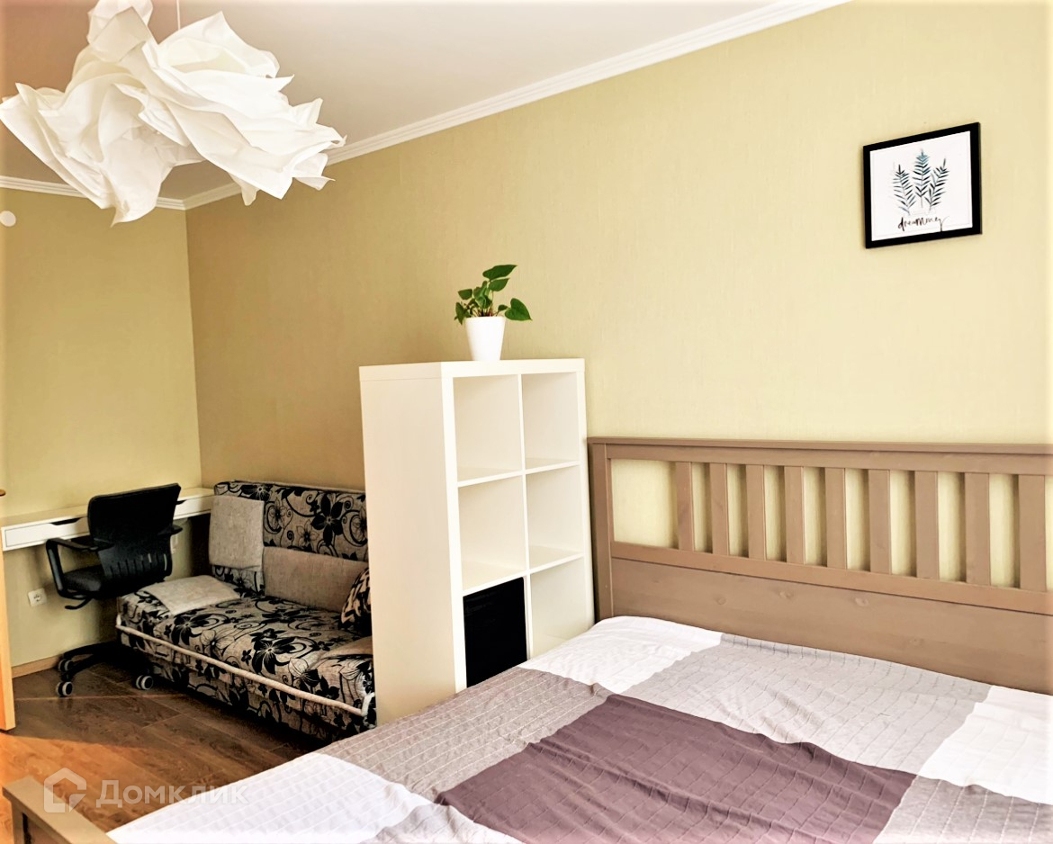 В комнате большая кровать 180*200 и диван-книжка. Есть рабочее место, стеллажи для вещей и комод.