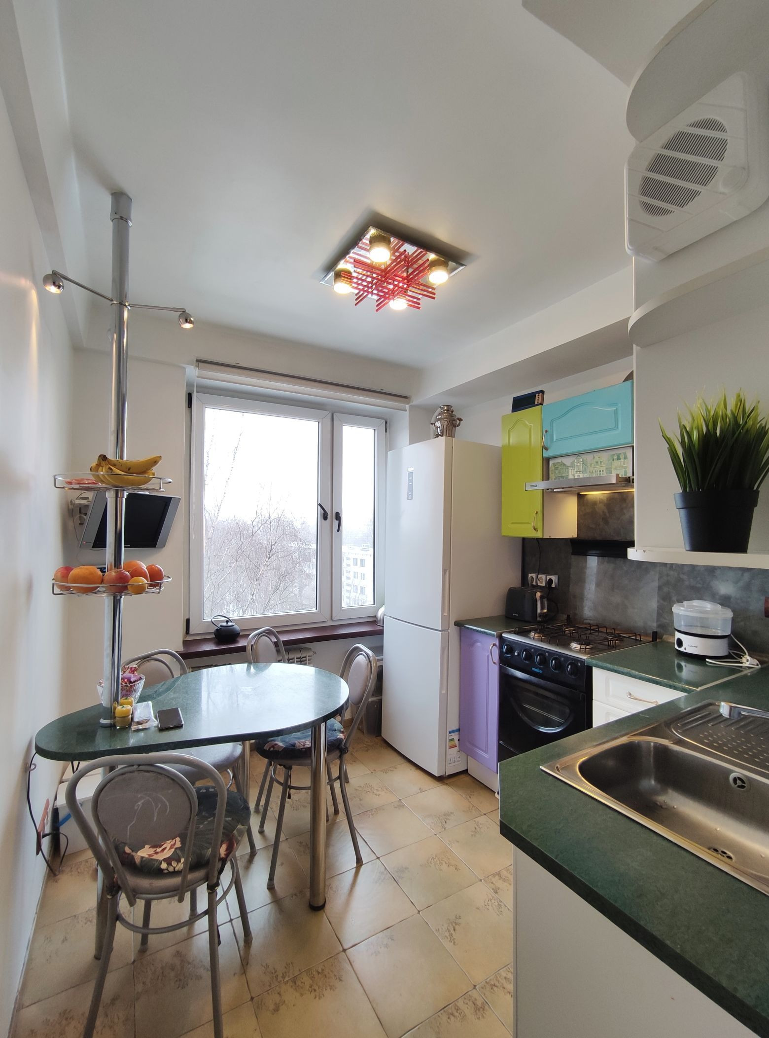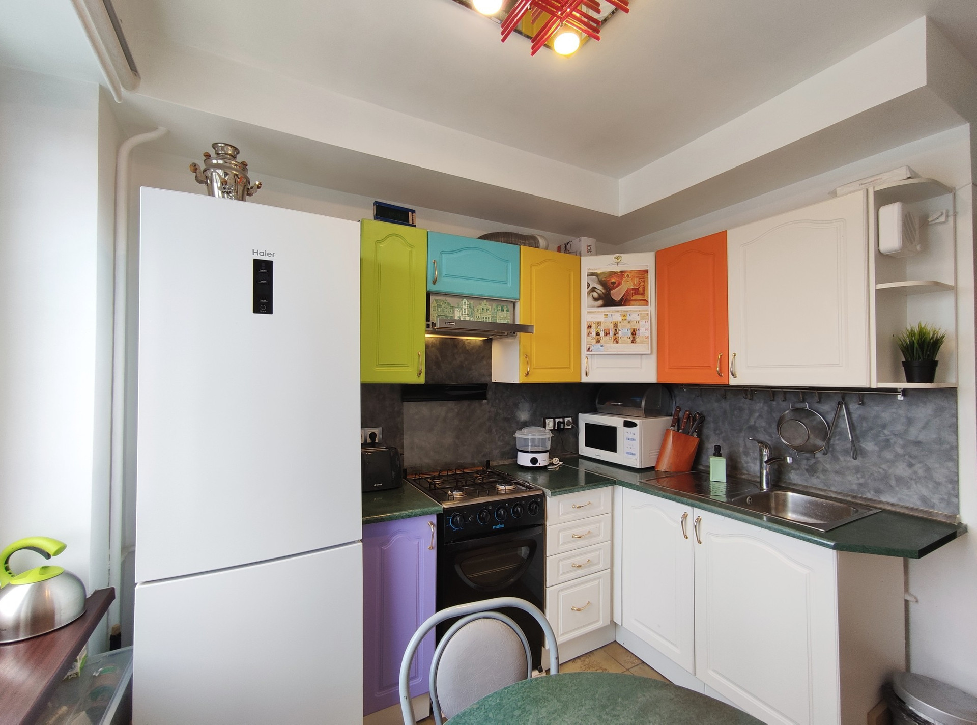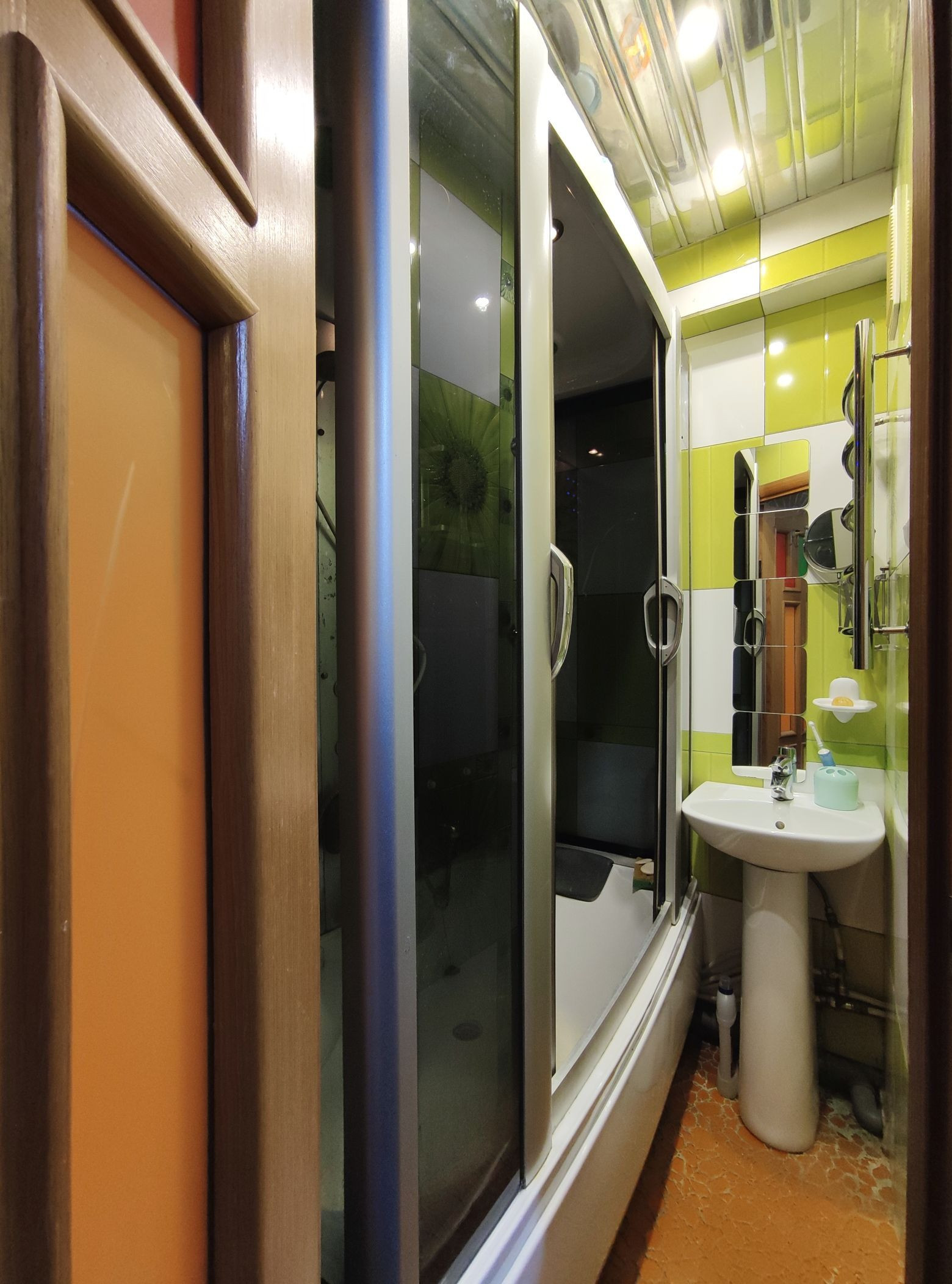 Всё сделано с любовью и для себя. Пространством распорядились максимально рационально: стиральная машина размещена в подсобке; в ванной умудрились разместить большую душевую кабину; на семиметровой кухне, на удивление, свободно. Тёплый пол в коридоре и ванной комнате.