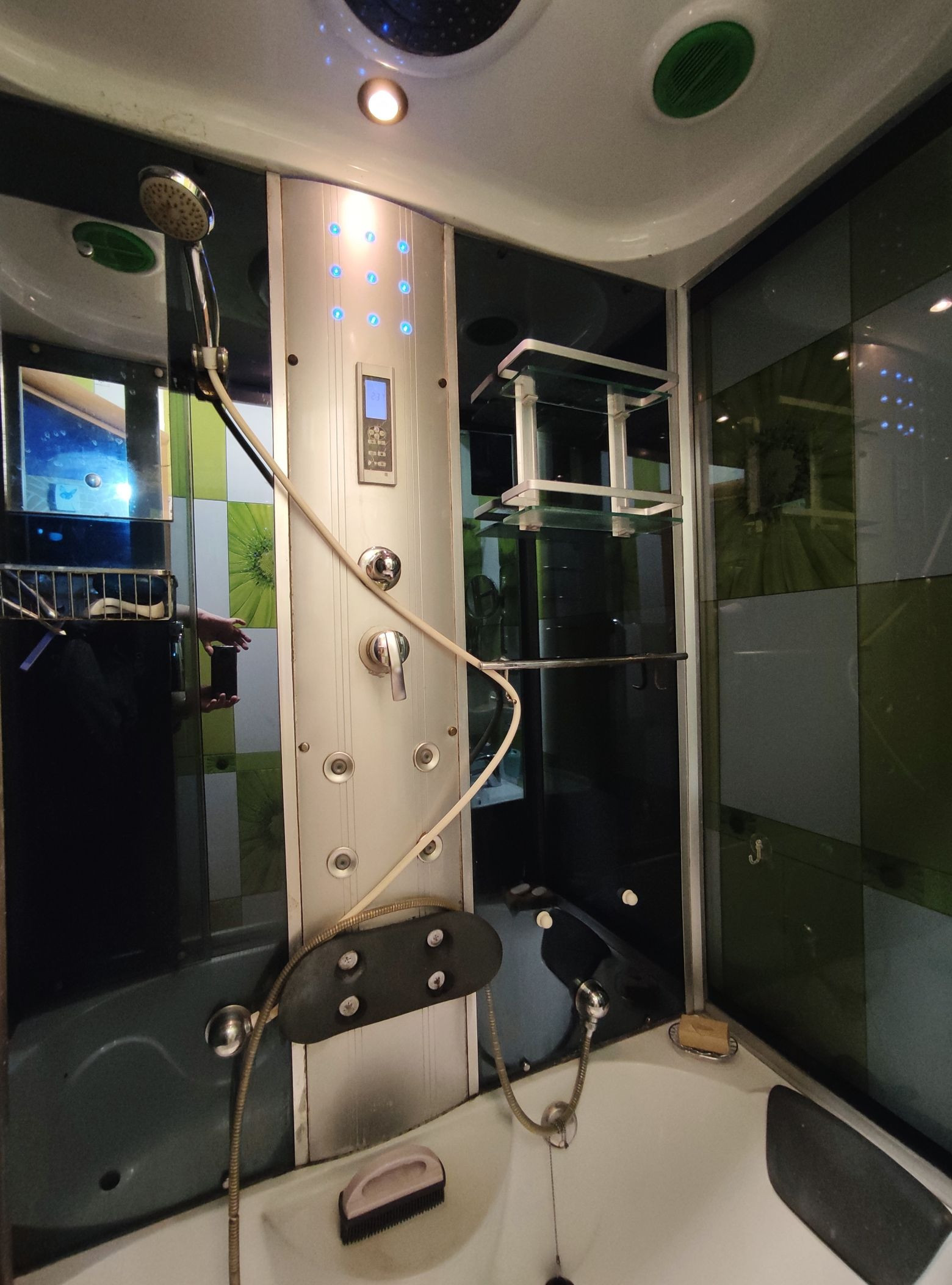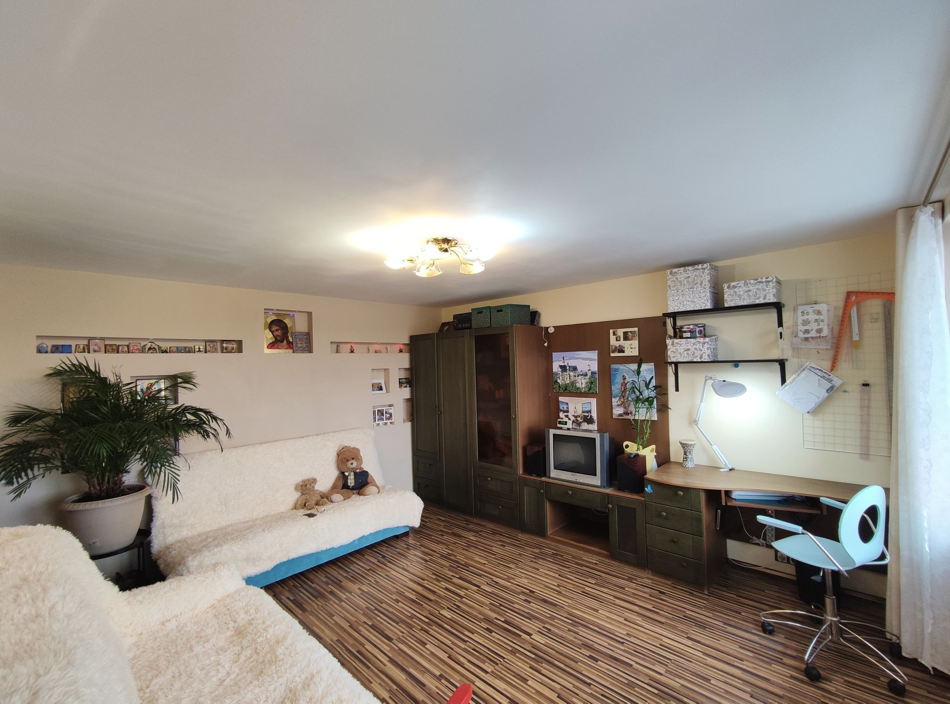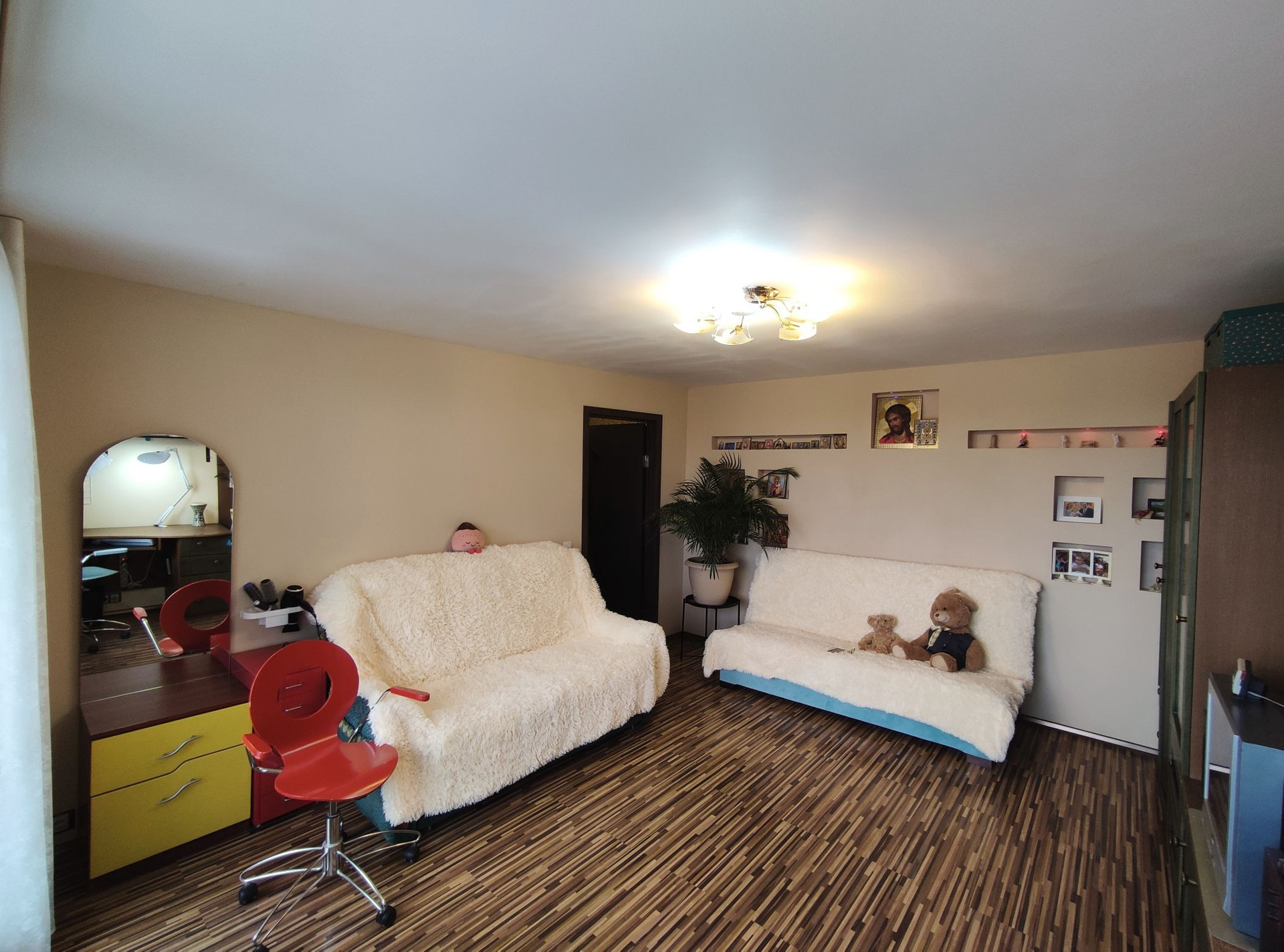 Всё сделано с любовью и для себя. Пространством распорядились максимально рационально: стиральная машина размещена в подсобке; в ванной умудрились разместить большую душевую кабину; на семиметровой кухне, на удивление, свободно. Тёплый пол в коридоре и ванной комнате.