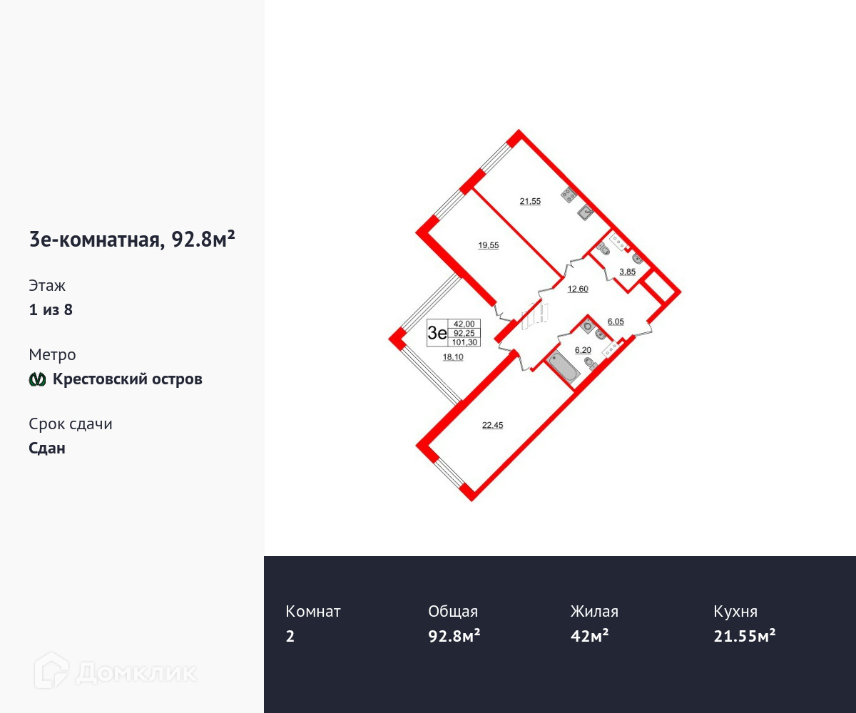 Продается двухкомнатная квартира в ЖК Петровский Квартал на воде площадью 92.8 м2 (жилая площадь – 42 м2). Квартира расположена рядом с метро Спортивная. Расстояние до метро 20 Мин.пешком. Площадь кухни 21.55 м2. Площадь прихожей 18.65 м2. Санузел – два санузла. Лоджия. Без отделки.