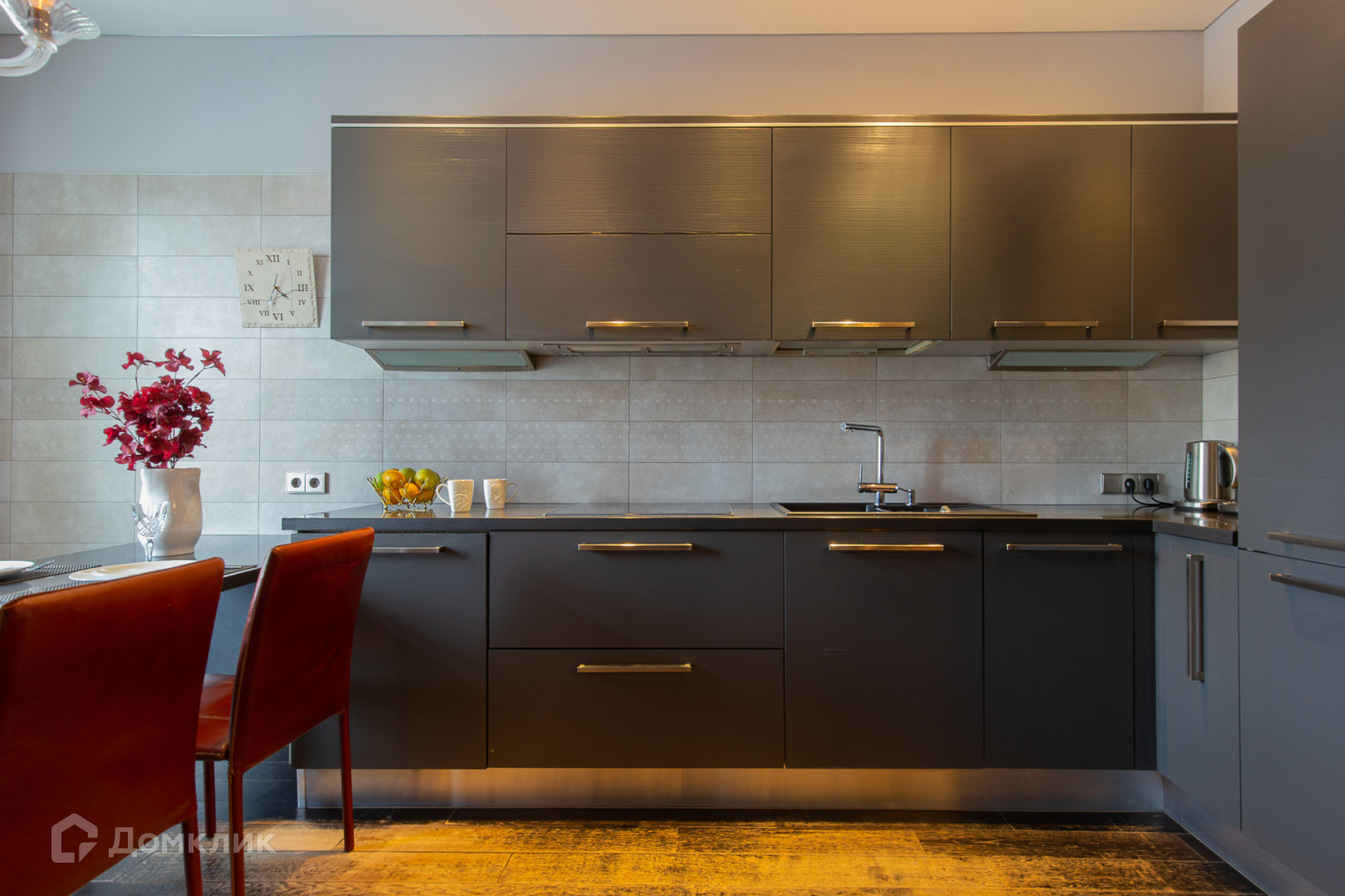 - обстановка на кухне: итальянская мебель с фасадами из шпона лиственницы, каменная столешница и стол, бытовая техника SIEMENS (духовка, индукционная плита, кофемашина, ПММ), комбинированный смеситель с питьевой водой, люстра с острова Мурано (Венеция);
